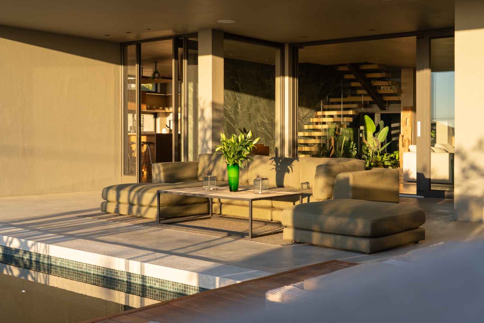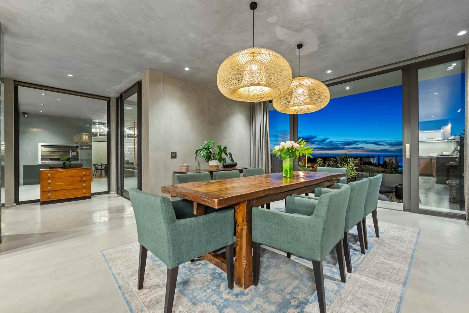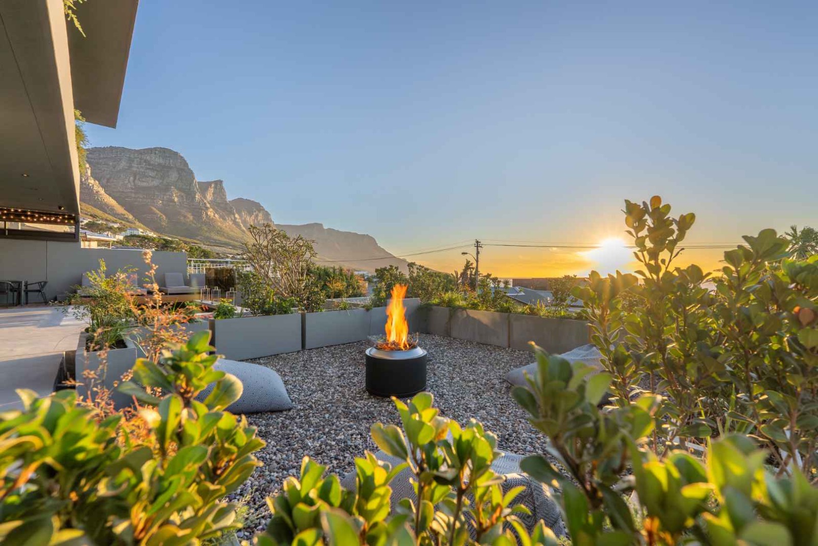 To the side of the home, a separate boma area creates an additional entertainment setting, enhanced by ambient lighting and a fully integrated Sonos sound system—perfect for evenings spent under the stars.