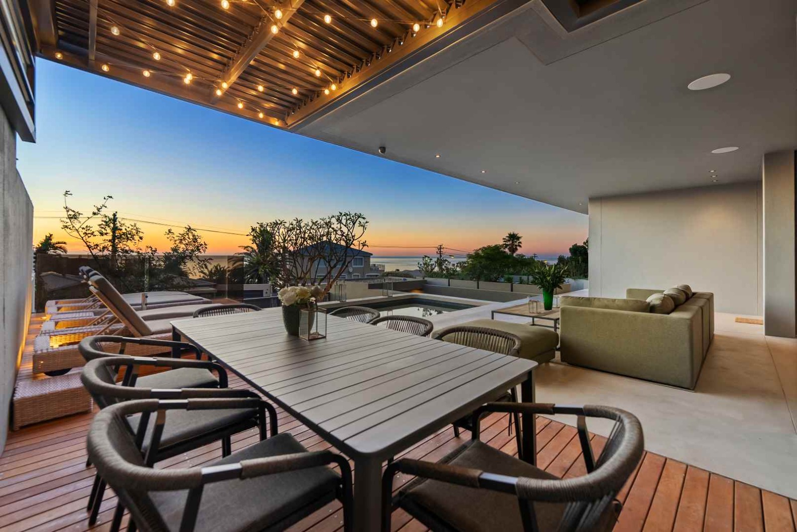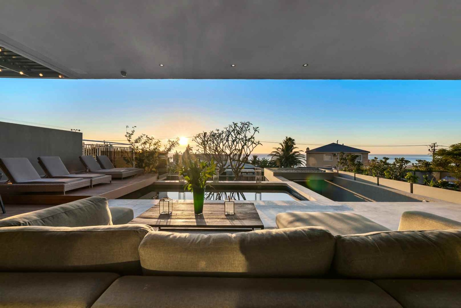 The entrance level opens into two generous living spaces, seamlessly integrated with a sleek open-plan kitchen. Designed with entertaining in mind, this central hub extends out to a beautifully appointed patio and pool area. Positioned at the front of the home, the patio features a built-in braai and comfortably accommodates both lounging and dining areas. The adjoining pool is framed by a sun deck, ideal for loungers, and softened by the presence of a mature Frangipani tree. With mountain and ocean views forming a tranquil backdrop, this outdoor space offers a serene escape from the everyday.