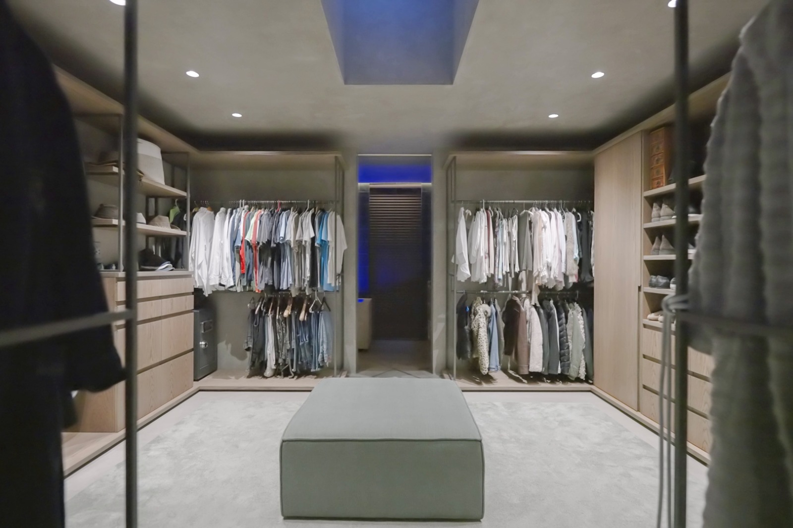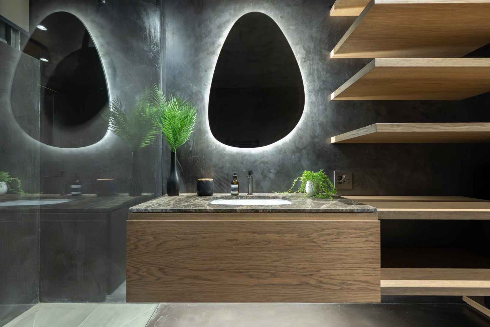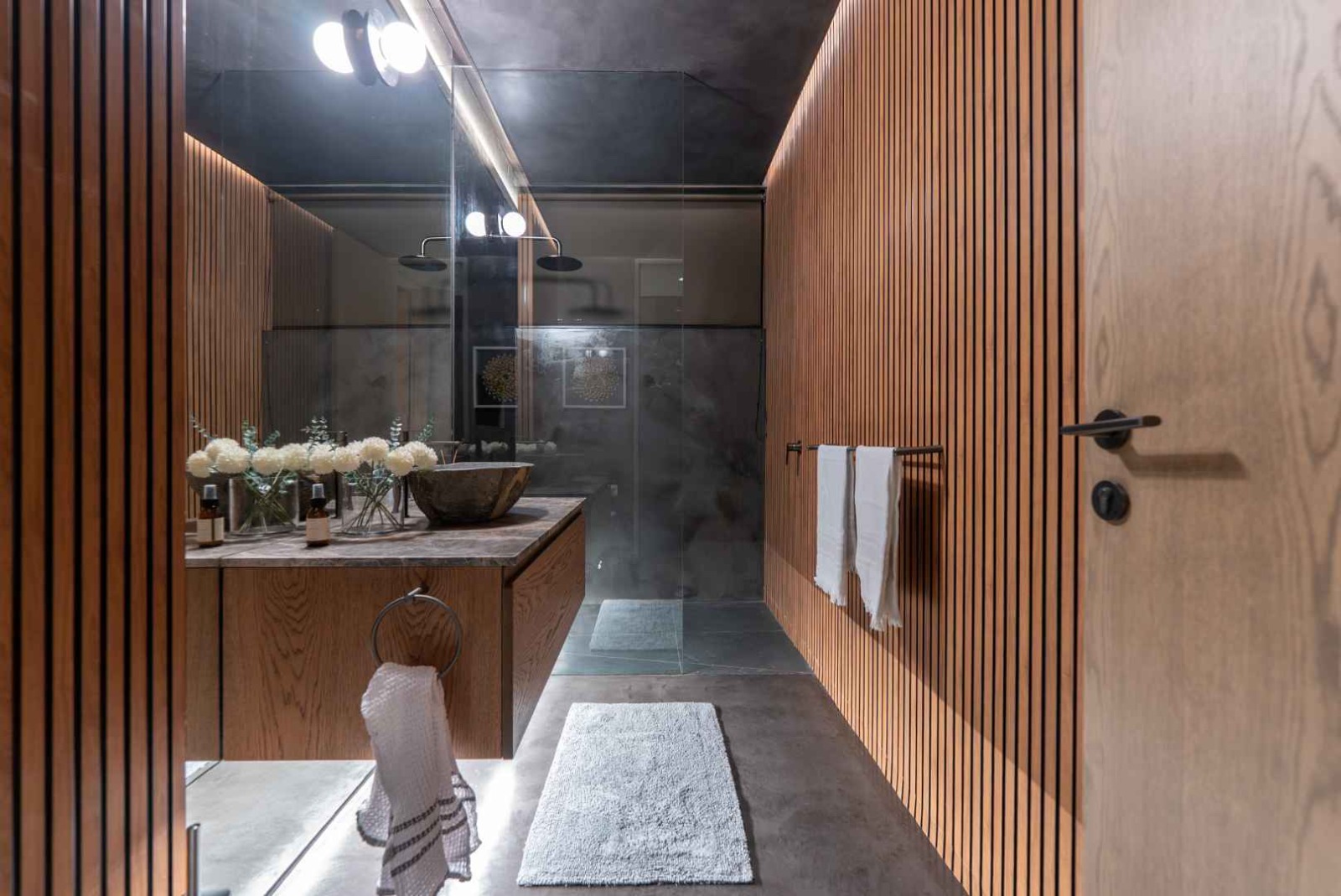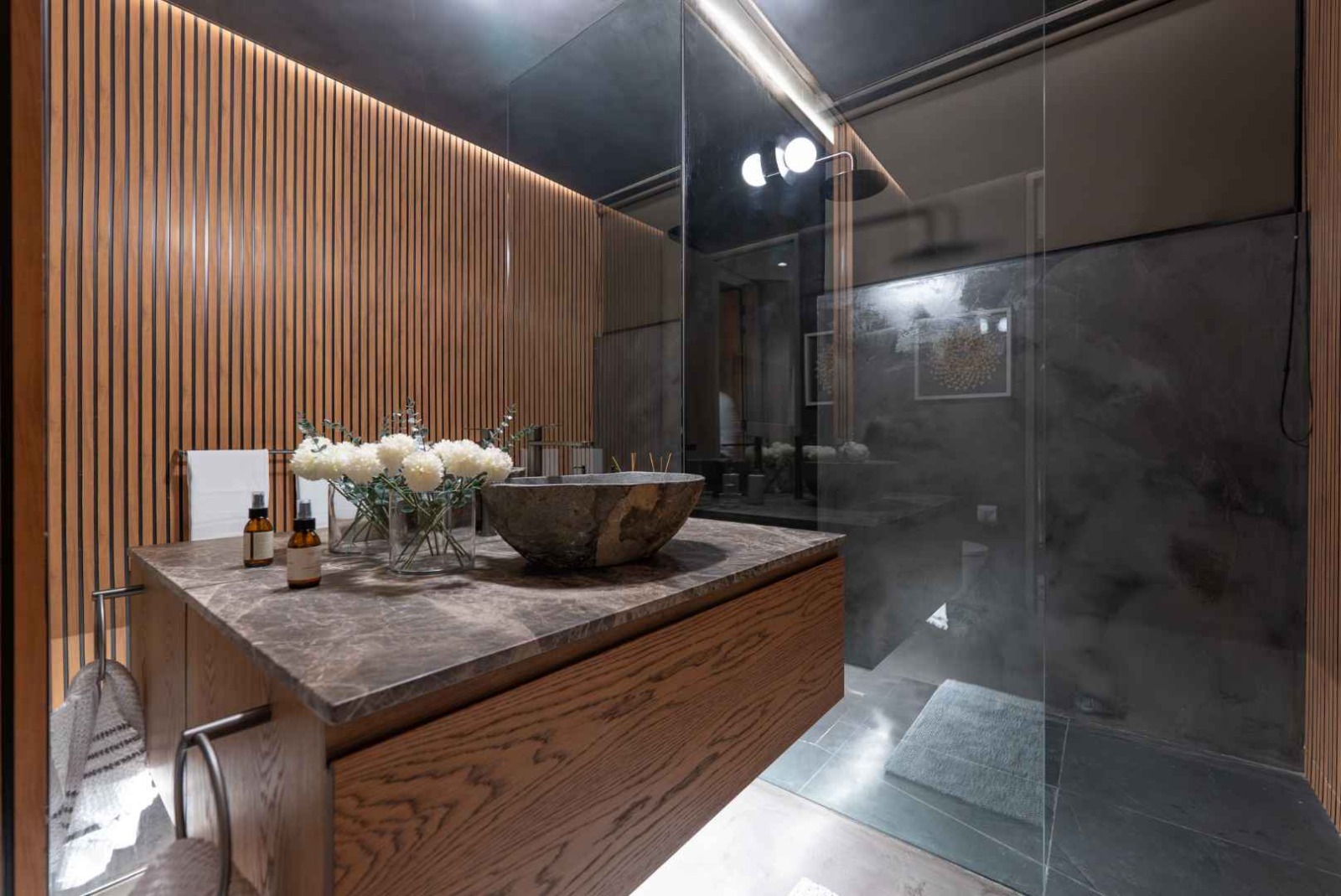 Upstairs, a striking wooden staircase—accented by a green marble feature wall and glass balustrades—leads to three spacious en-suite bedrooms. Each room is thoughtfully designed with ample storage and its own workspace, catering perfectly to modern living. The main suite is a true retreat, boasting a luxurious bathroom complete with double vanities, a freestanding bath, a large shower, sauna, and ice bath. A wood-burning fireplace further enhances the sense of comfort and indulgence.