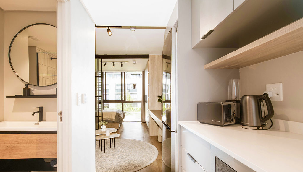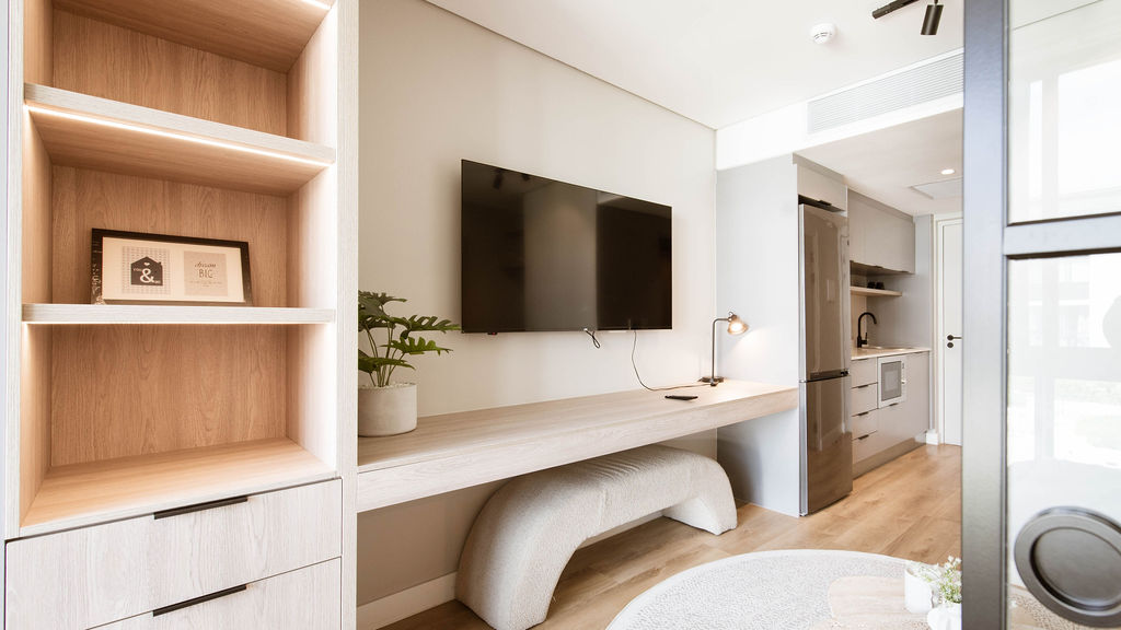The living space connects seamlessly to a sleek, modern kitchenette — practical for everyday living and perfectly suited to a lock-up-and-go lifestyle. A dedicated built-in study area adds real functionality, making this an excellent option for students, young professionals, or tenants working remotely. Generous cupboard space ensures everything has its place, enhancing the apartment’s clean, efficient design. The bathroom is contemporary and neatly finished, complementing the overall modern aesthetic.