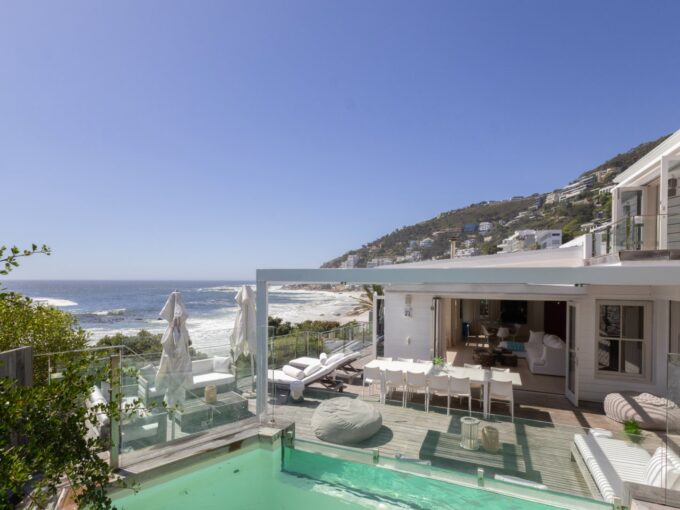Upon entering the apartment you are welcomed with a spacious entrance, to the right of the entrance there is a stunning glass wine room. Leading into a large spacious open-plan living area with a lounge, dining room, and kitchen. The spacious lounge and dining area has views over the V&A waterfront with an amazing bar area which is great for entertaining and opens up onto a big terrace. The large terrace has views of the stadium, urban landscape, and ocean in the distance with an elevated pool that enjoys views over Signal hill. A contemporary kitchen which is any chef’s dream has 3 built in ovens, a breakfast bar, and a big scullery/laundry room adjacent to the kitchen.