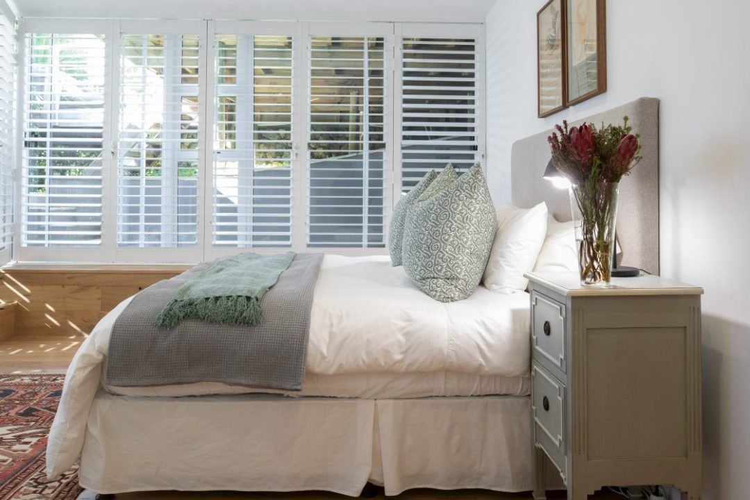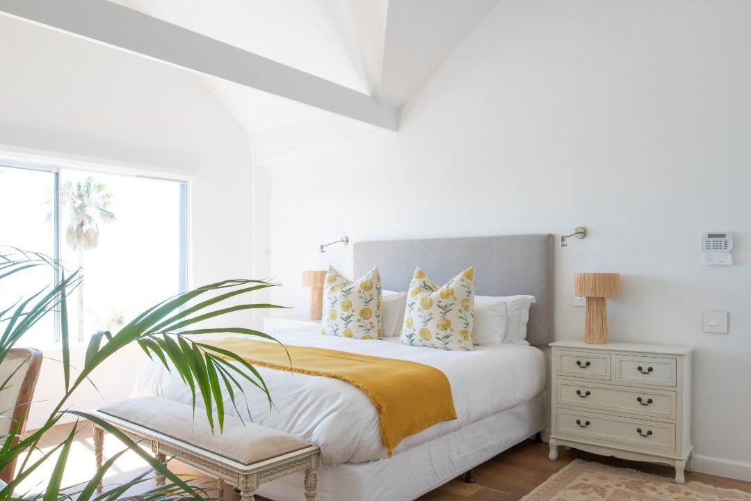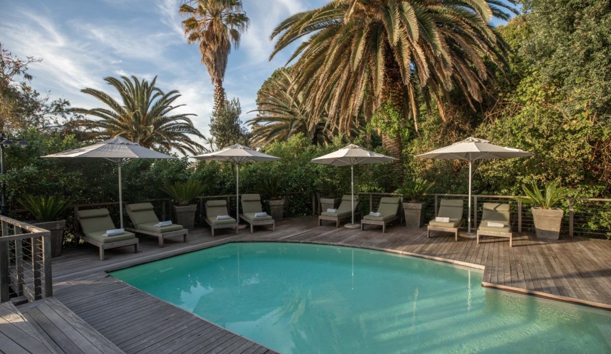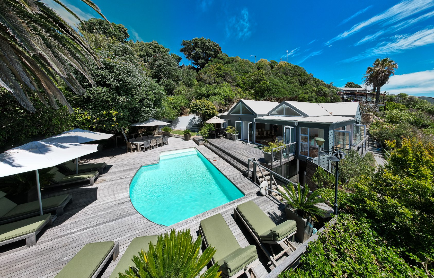 A sunny, open plan kitchen, extends to a dining area and open plan living space, which is complimented by roof trusses through which a marvellous view of Lion’s Head can be seen. This living area is surrounded by floor to ceiling stacking doors, opening over panoramic views of Clifton 3rd Beach to the front, where you can watch the amazing Cape Town sunsets and hear the crashing of the waves. The stacking doors to the side, open onto an expansive wooden deck and pool. The privacy of this entertainment area is enhanced by the surrounding trees and flora. A sauna below the pool deck, completes this entertainer’s dream. The bungalow has a private door that opens onto the steps of 3rd Beach, which is just a stone’s throw away.