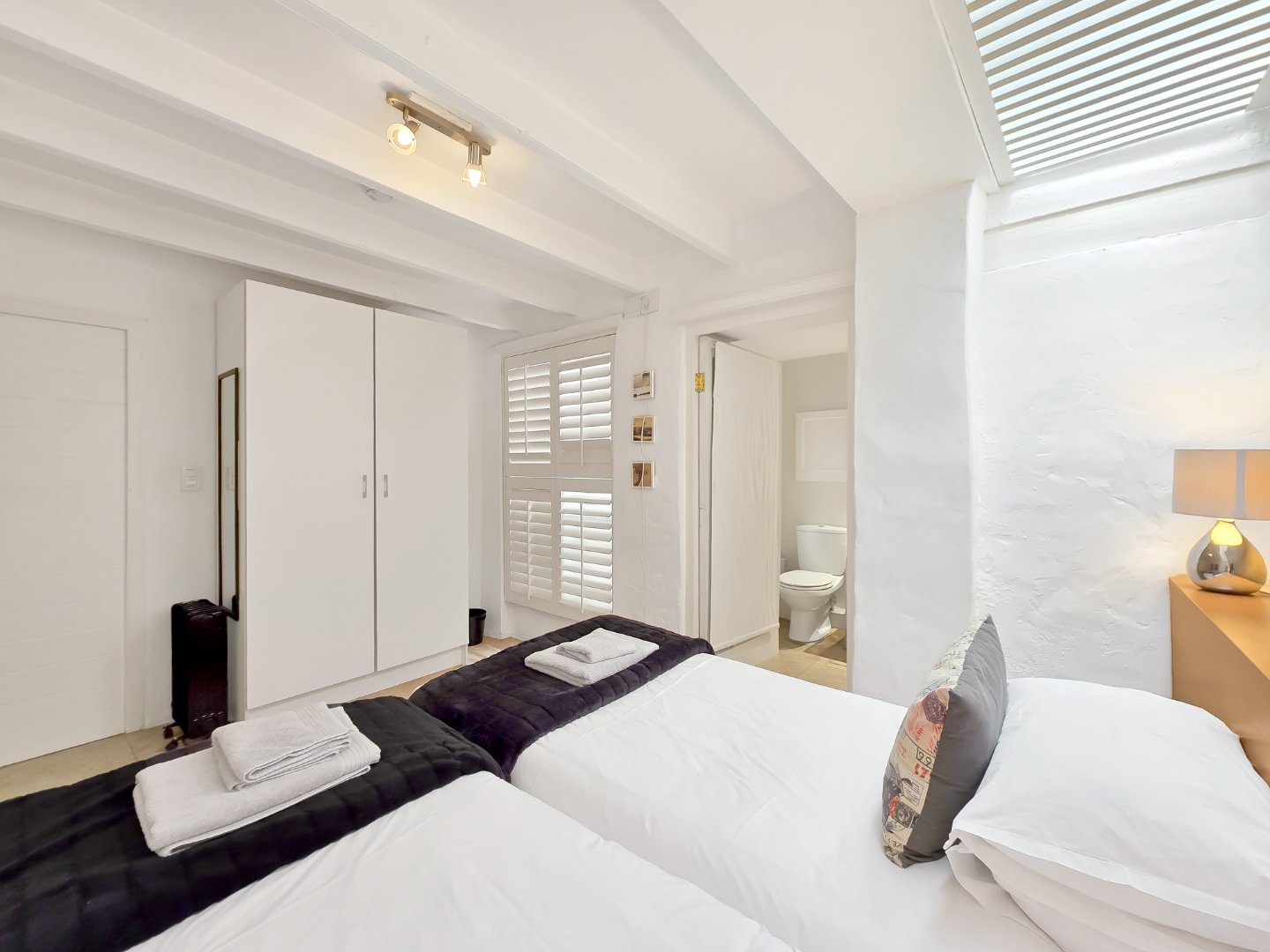 Also located on this level is a versatile bedroom fitted with two single beds which can be configured into a king-size bed if required. A bathroom with both bath and shower services this bedroom.