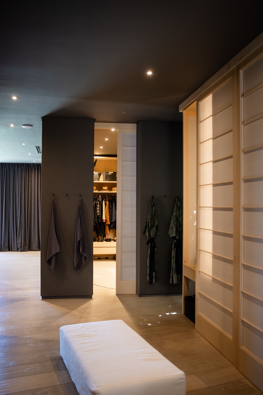 Spacious primary bedroom en suite that flows out onto a terrace with a Khoi pond, complete with his-and-hers dressing rooms, luxury double shower and an imported Japanese Oruro bath.