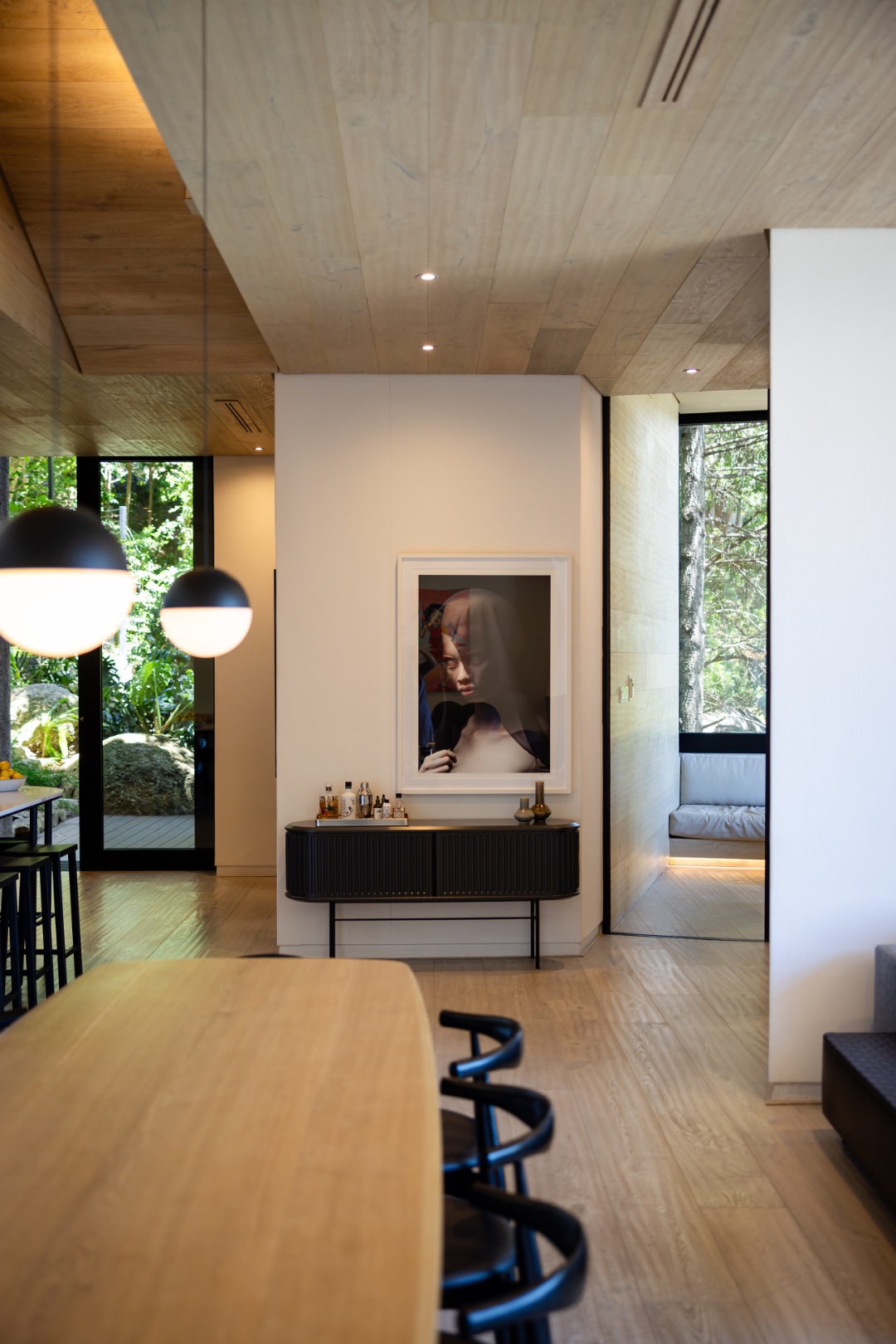 Large entertainment lounge, dining and open kitchen all leading outside amongst mature indigenous trees