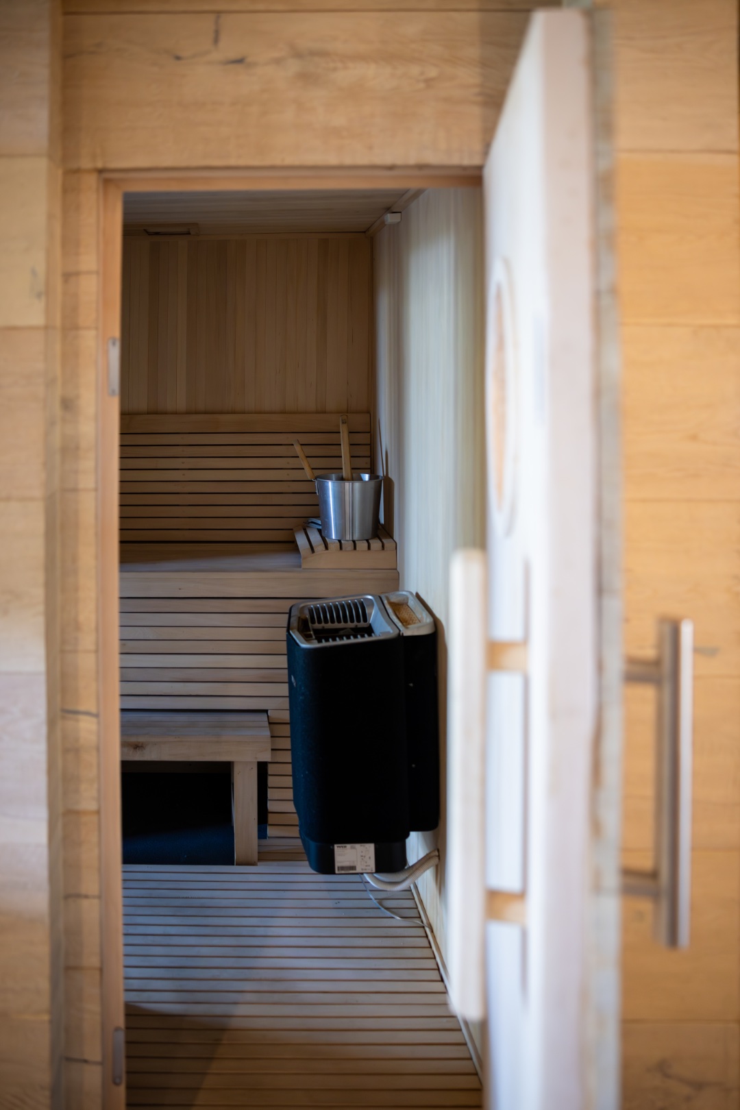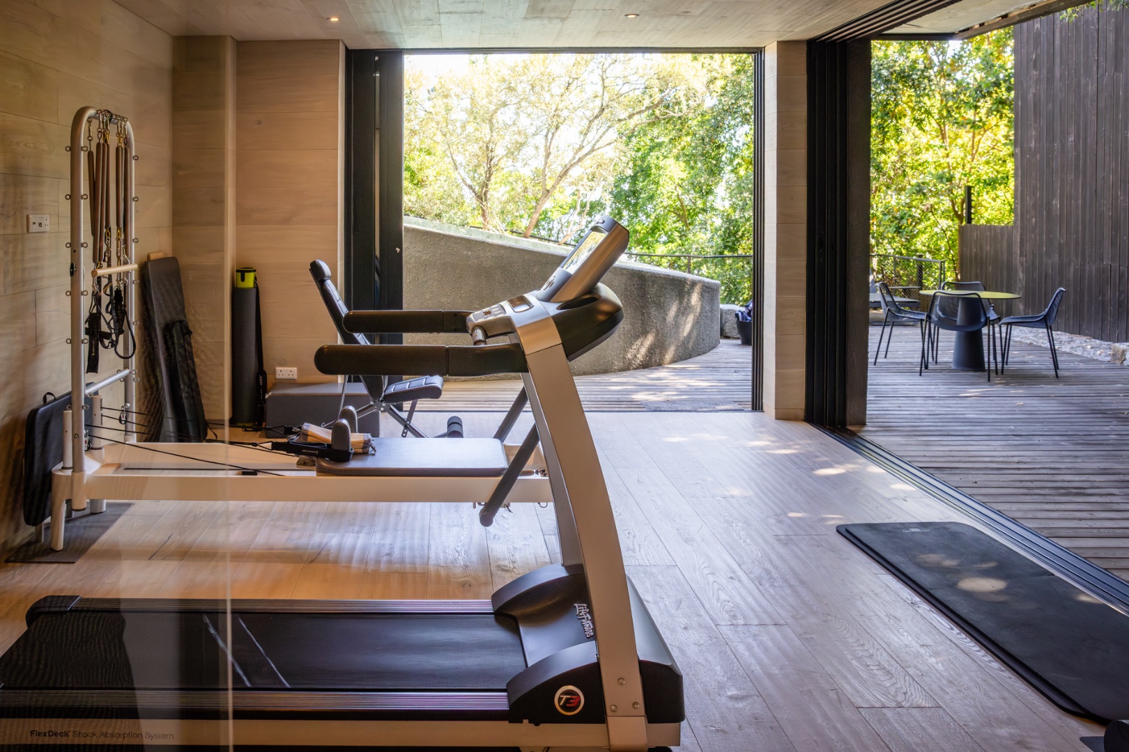 Private gym, Sauna and bathroom leading out to a round rock pool and an outdoor shower.