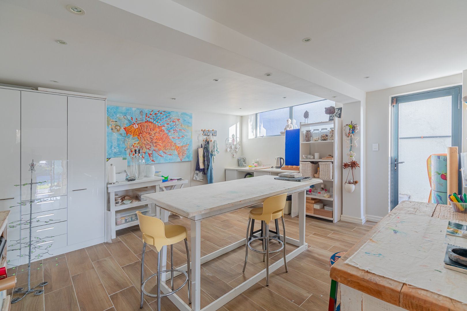 Downstairs leads to another two pristine and spacious 2nd and 3rd bedrooms en-suite, a huge studio/4th bedroom with its own bathroom, and an ample work-from-home study with a view over a huge family/entertainment/gym room towards the garden and sea beyond. This level leads out to a patio and barbeque area, overlooking a sparkling heated pool and an immaculate low-maintenance garden.