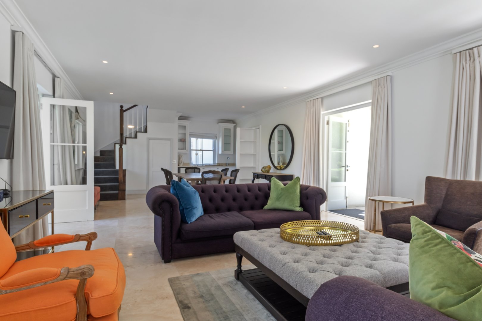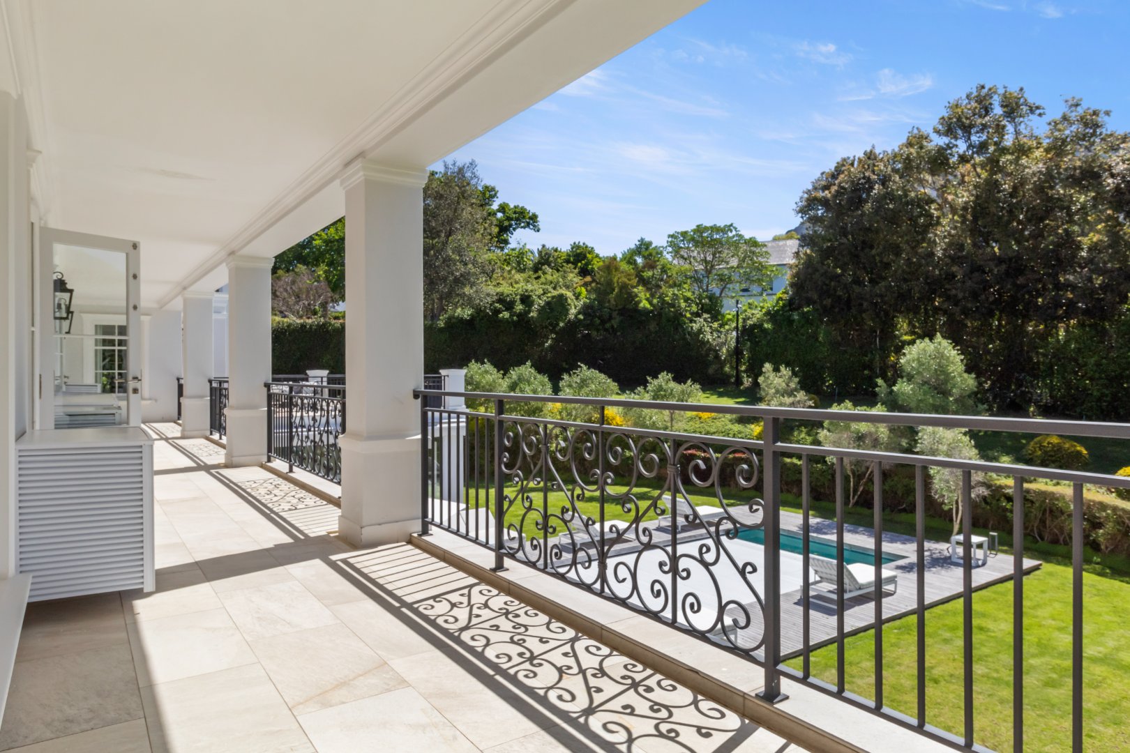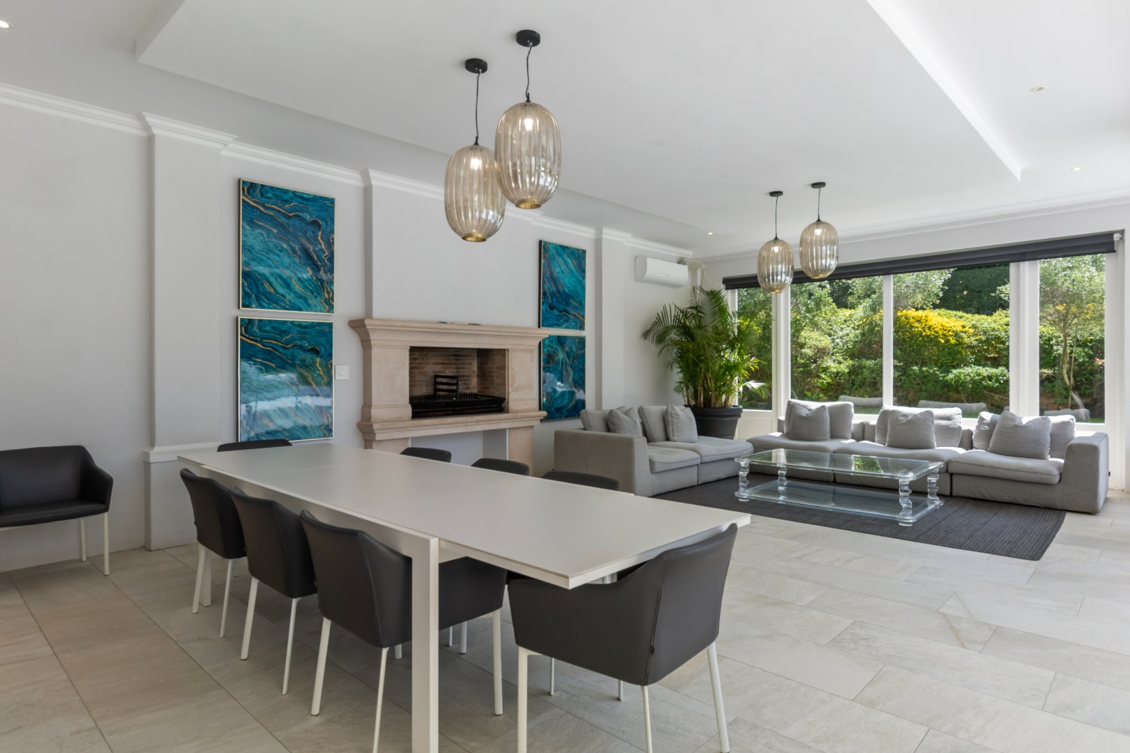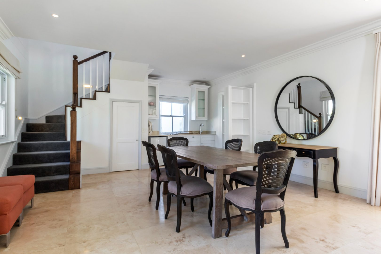Set in one of Constantia’s most prestigious avenues, this contemporary Georgian residence combines timeless elegance with modern functionality. A tranquil courtyard fountain greets you at the entrance, leading into a home defined by high ceilings, engineered wooden floors, sash windows, and French doors.