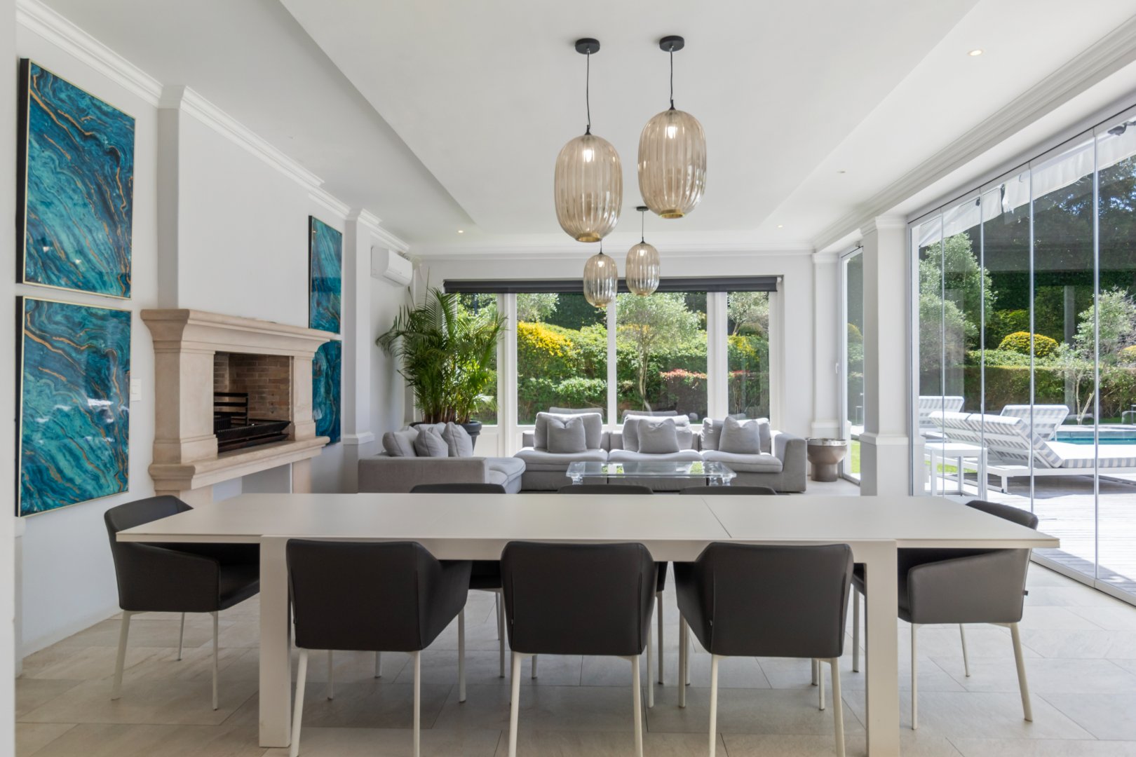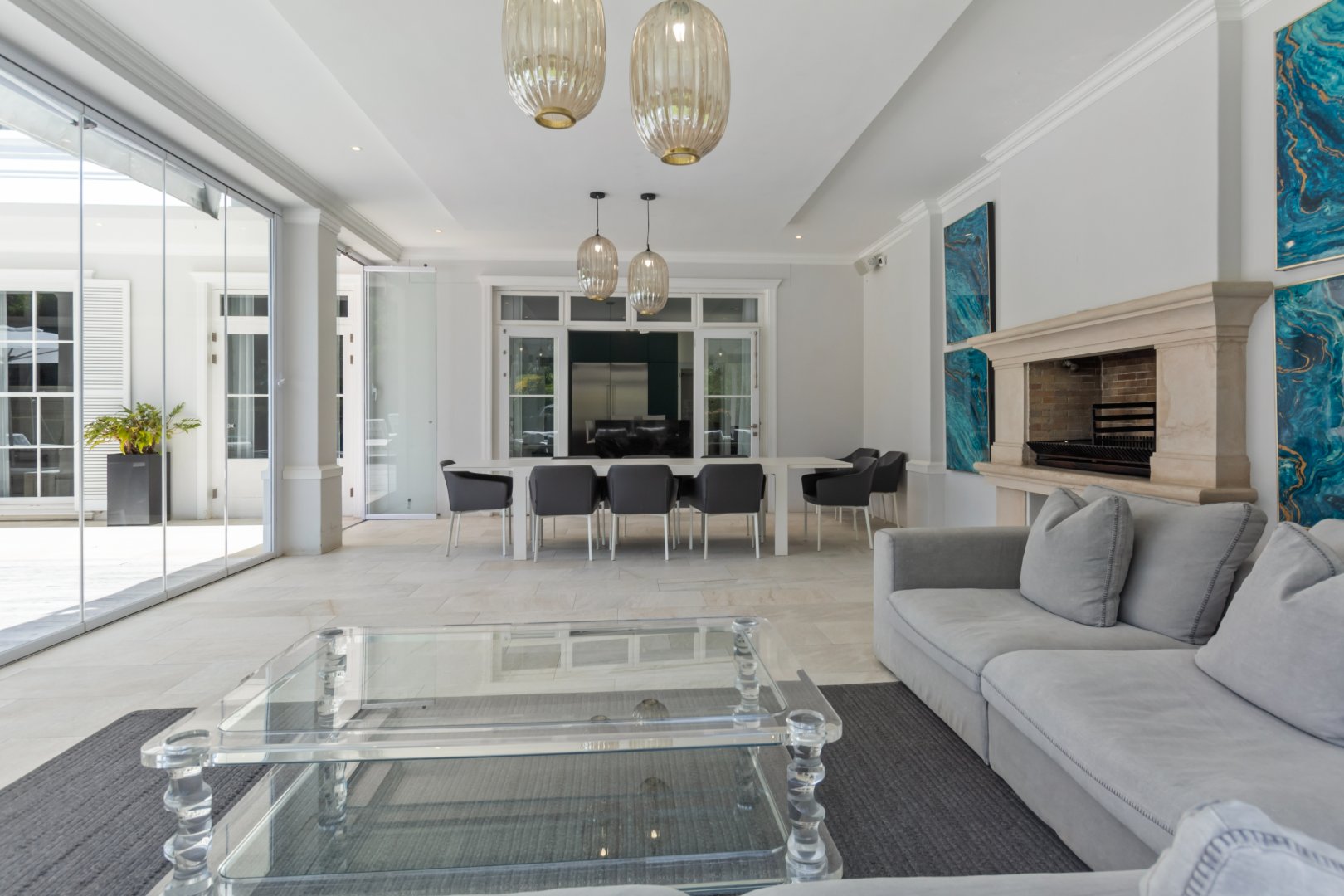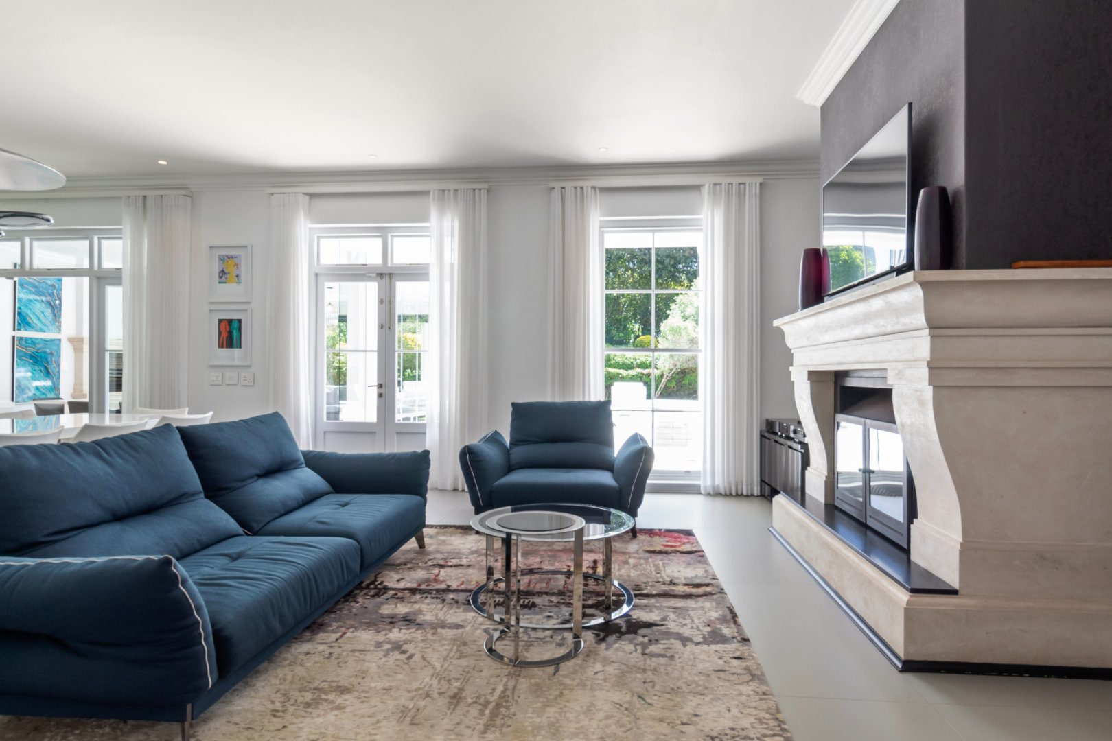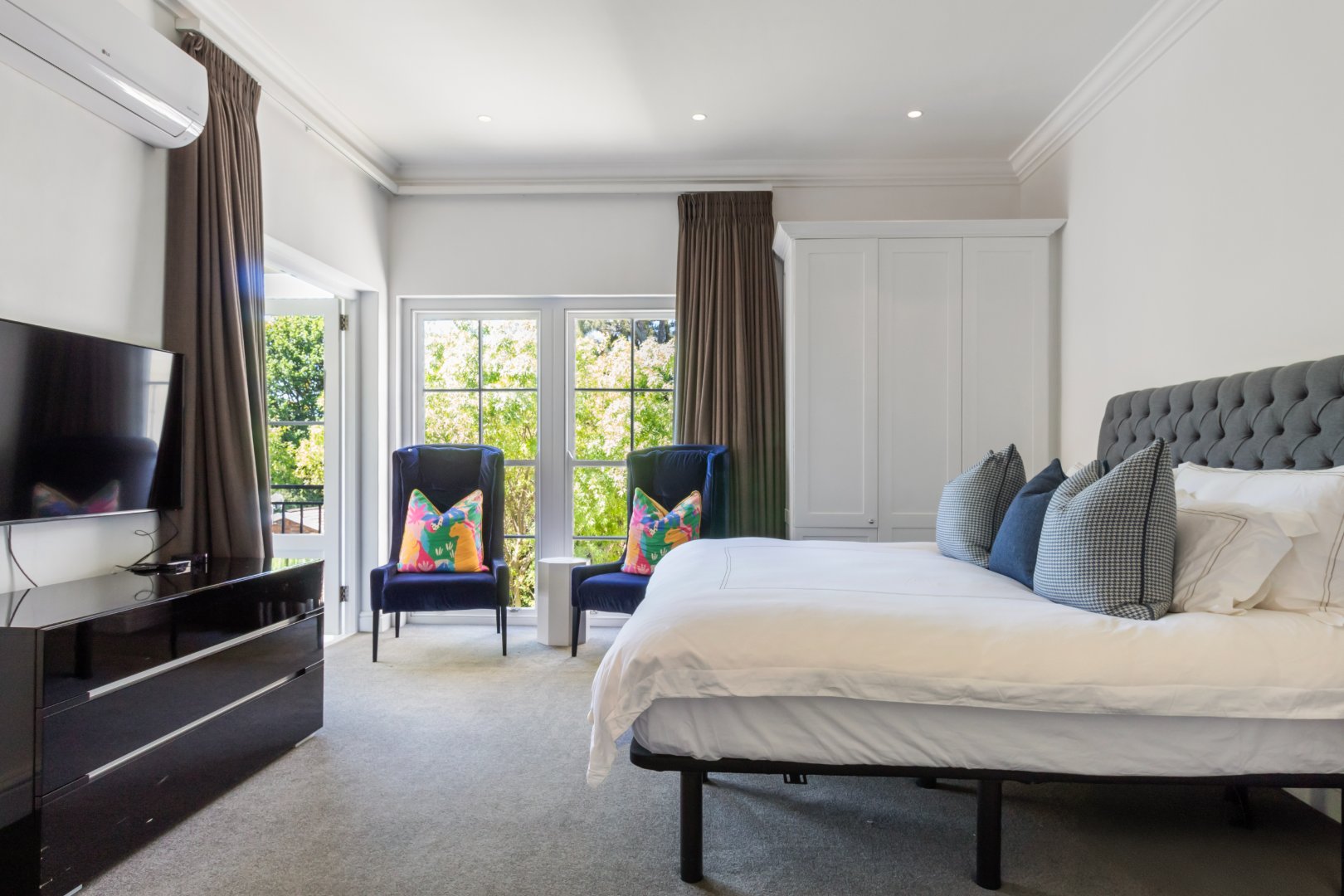 Set in one of Constantia’s most prestigious avenues, this contemporary Georgian residence combines timeless elegance with modern functionality. A tranquil courtyard fountain greets you at the entrance, leading into a home defined by high ceilings, engineered wooden floors, sash windows, and French doors.
