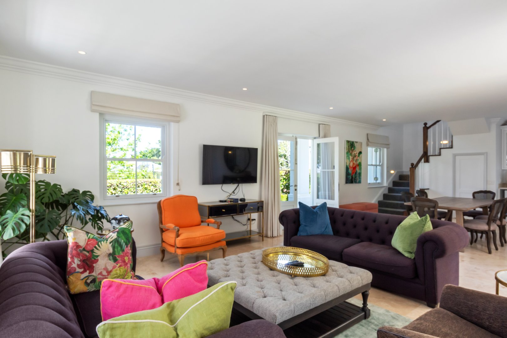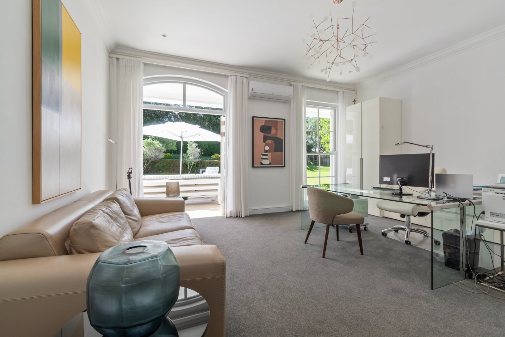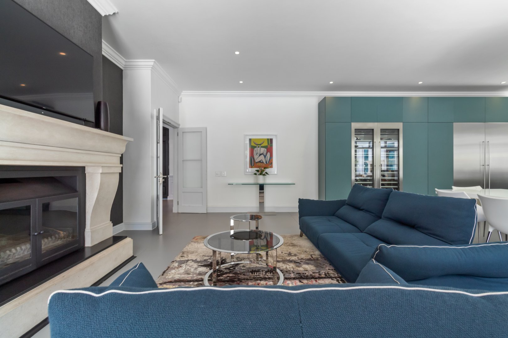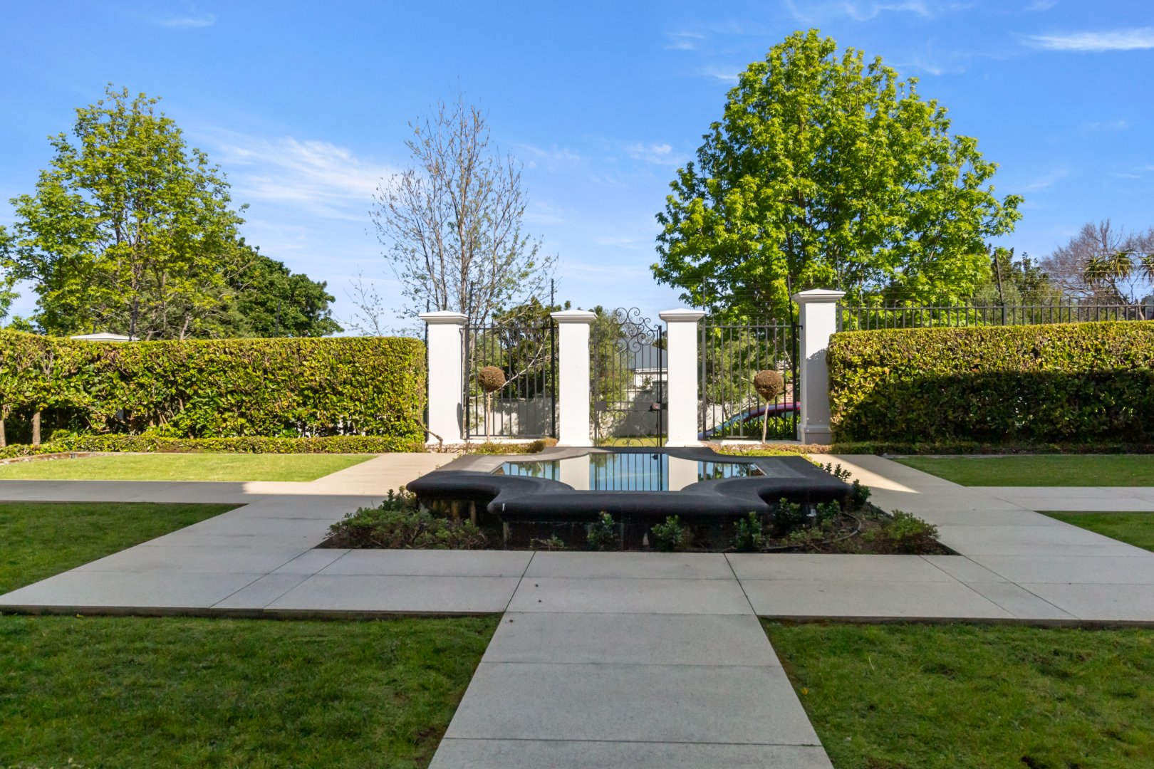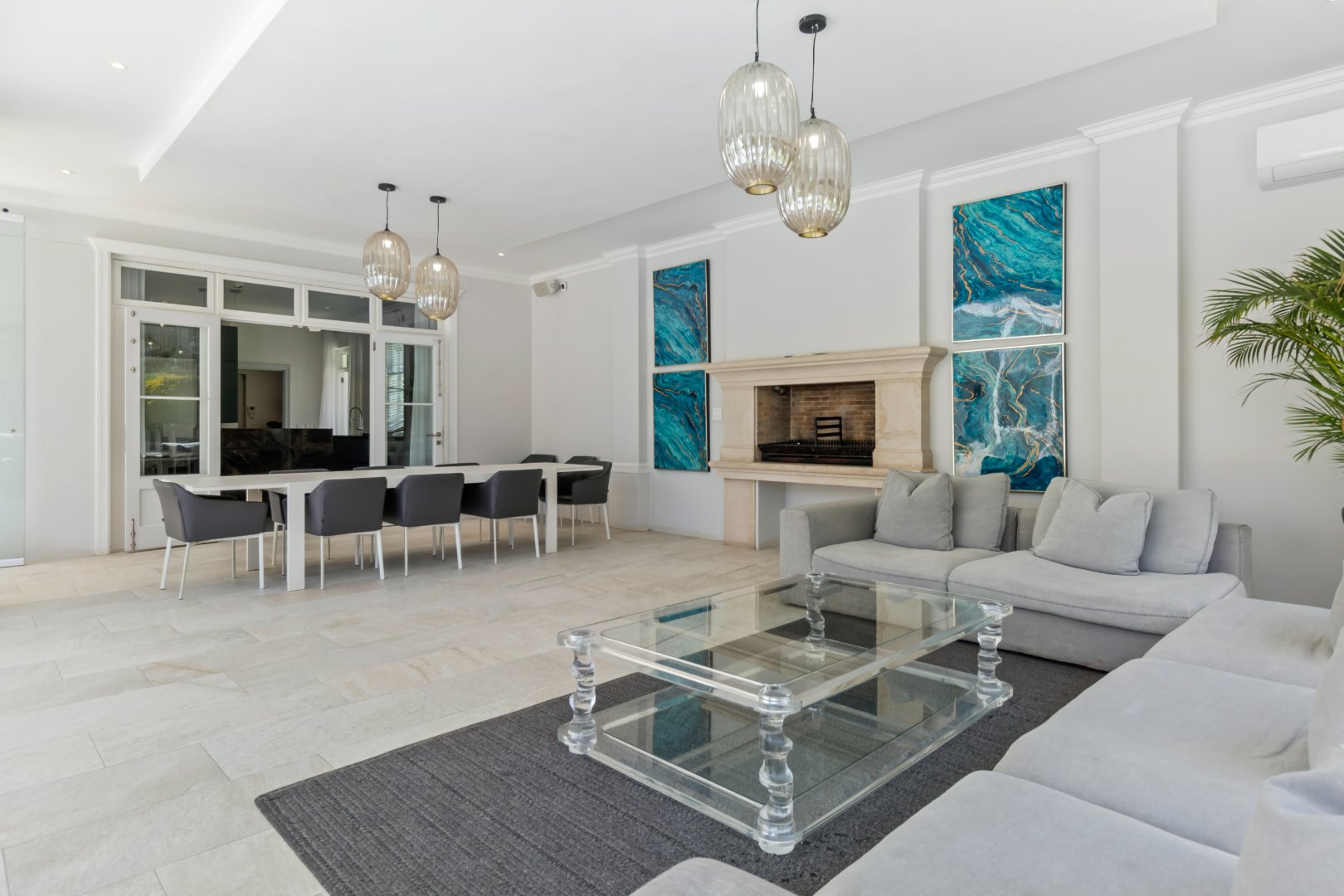 Set in one of Constantia’s most prestigious avenues, this contemporary Georgian residence combines timeless elegance with modern functionality. A tranquil courtyard fountain greets you at the entrance, leading into a home defined by high ceilings, engineered wooden floors, sash windows, and French doors.