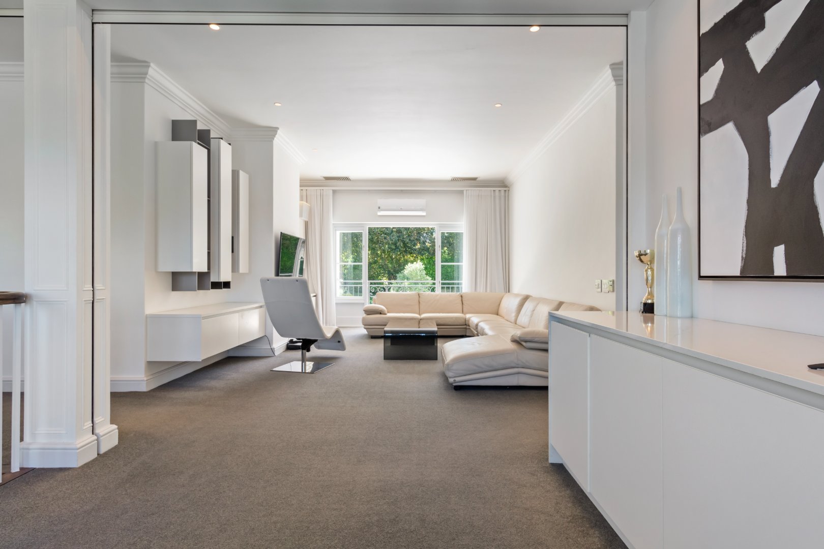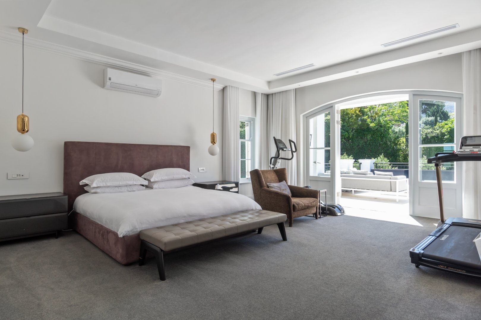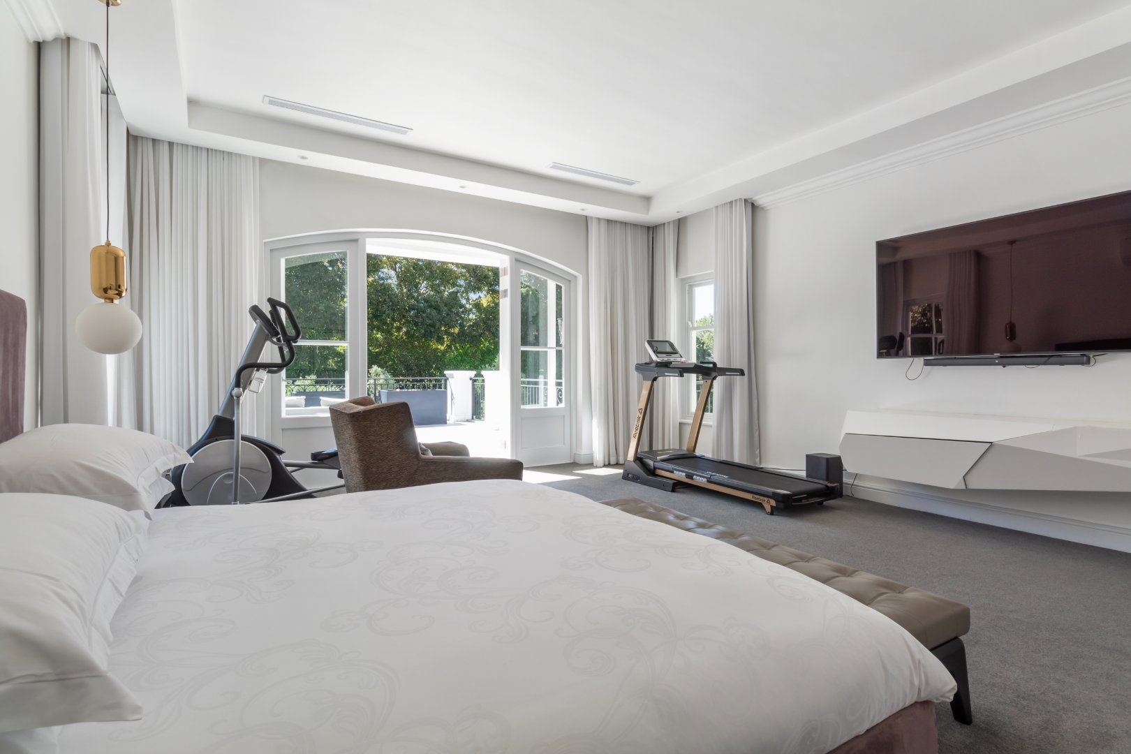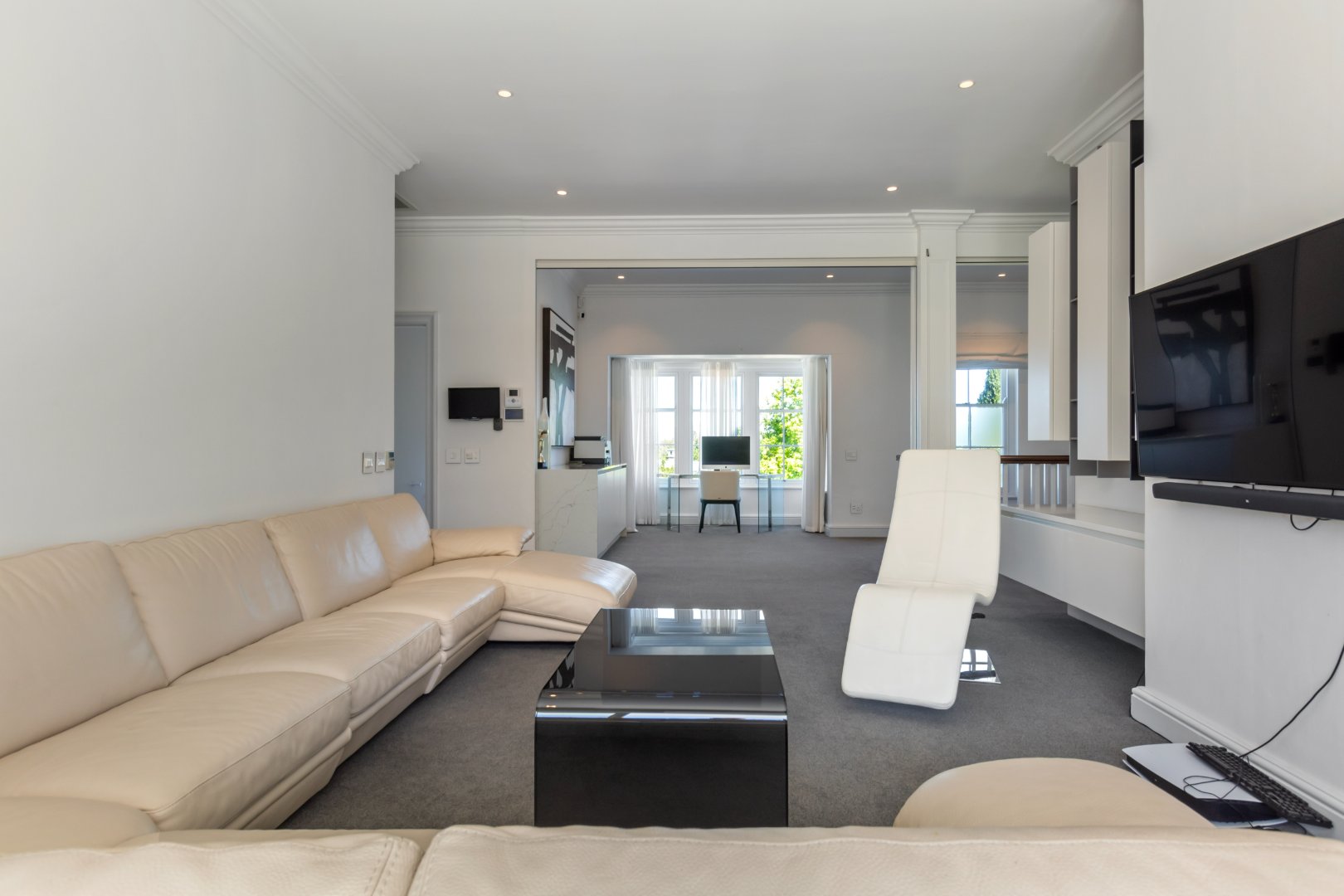 Set in one of Constantia’s most prestigious avenues, this contemporary Georgian residence combines timeless elegance with modern functionality. A tranquil courtyard fountain greets you at the entrance, leading into a home defined by high ceilings, engineered wooden floors, sash windows, and French doors.