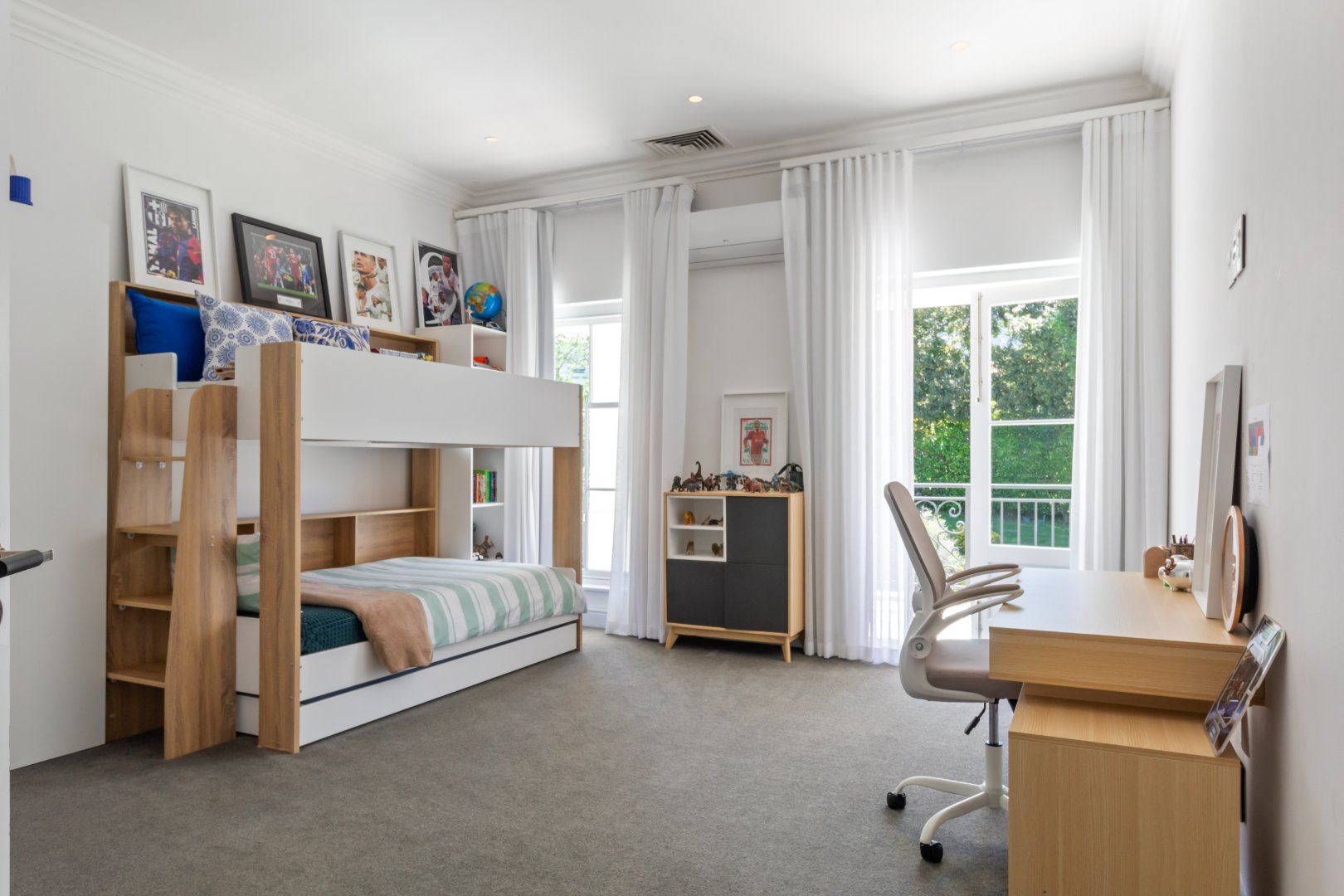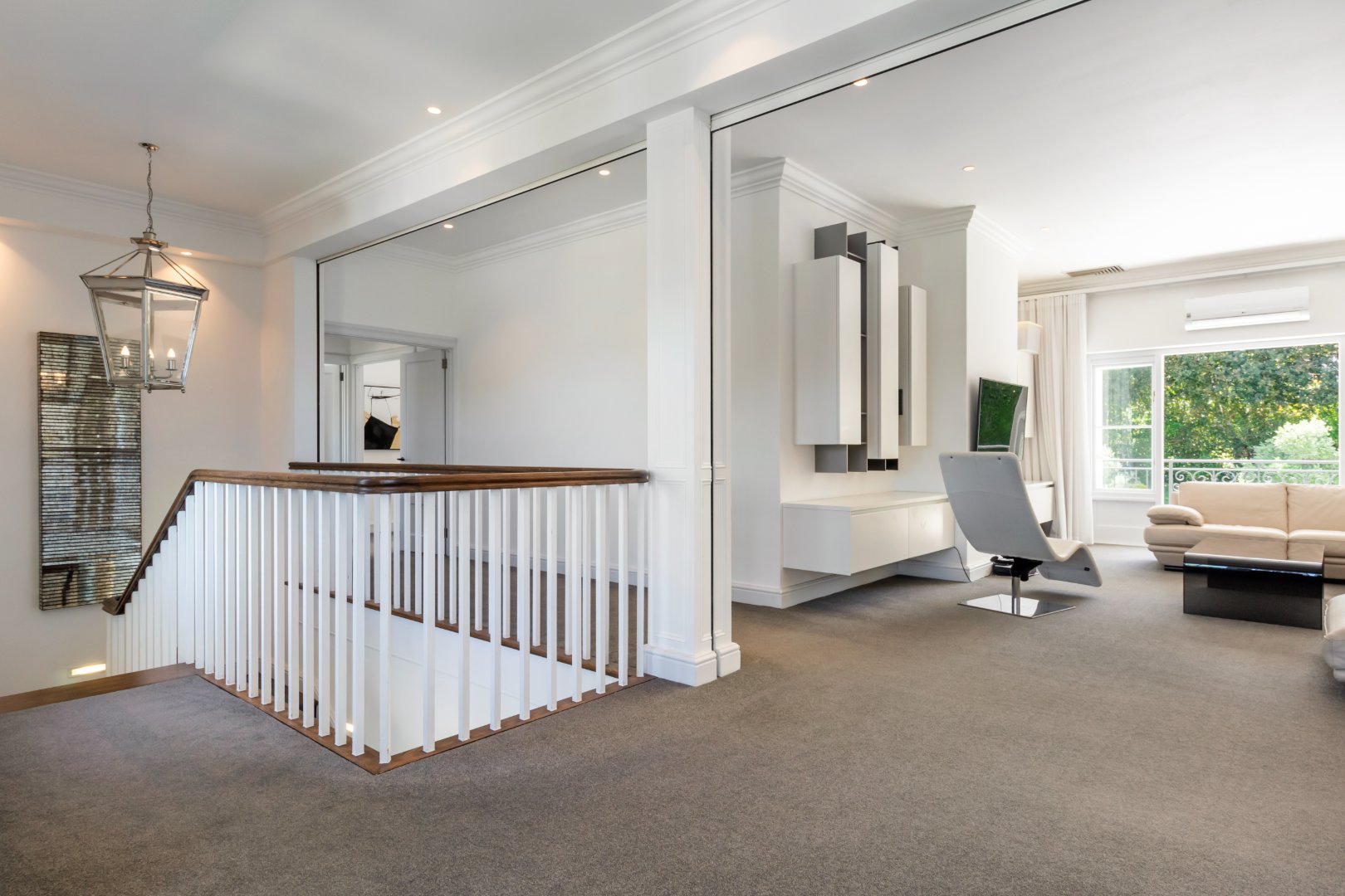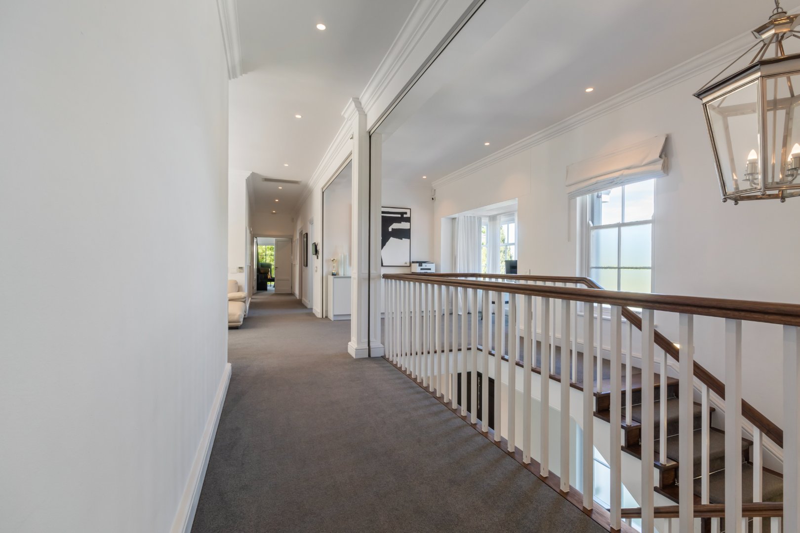 Designed for guests and extended family, the two-level guest wing features its own kitchen, living area, and two bedrooms, while the upper level of the main house includes a pyjama lounge, two sunny bedrooms, a family bathroom, and a third en-suite guest bedroom. The primary suite is a luxurious retreat with his-and-hers dressing rooms, a bespoke en-suite bathroom, and a private balcony.