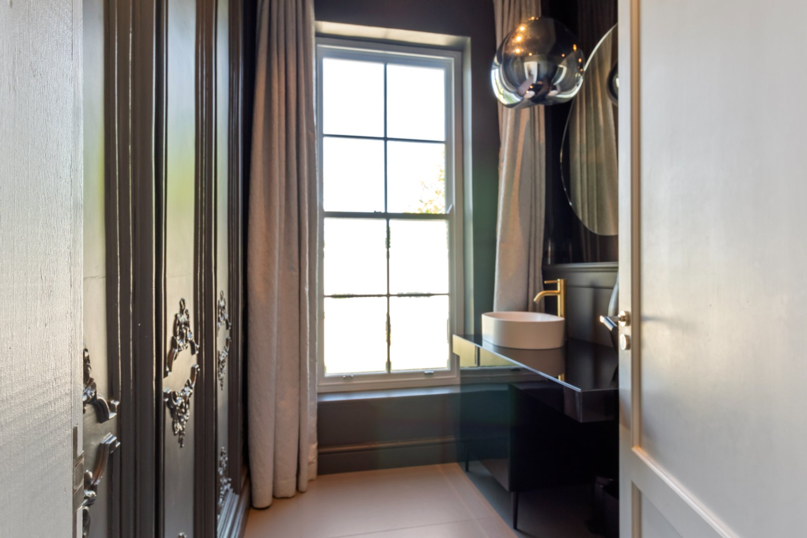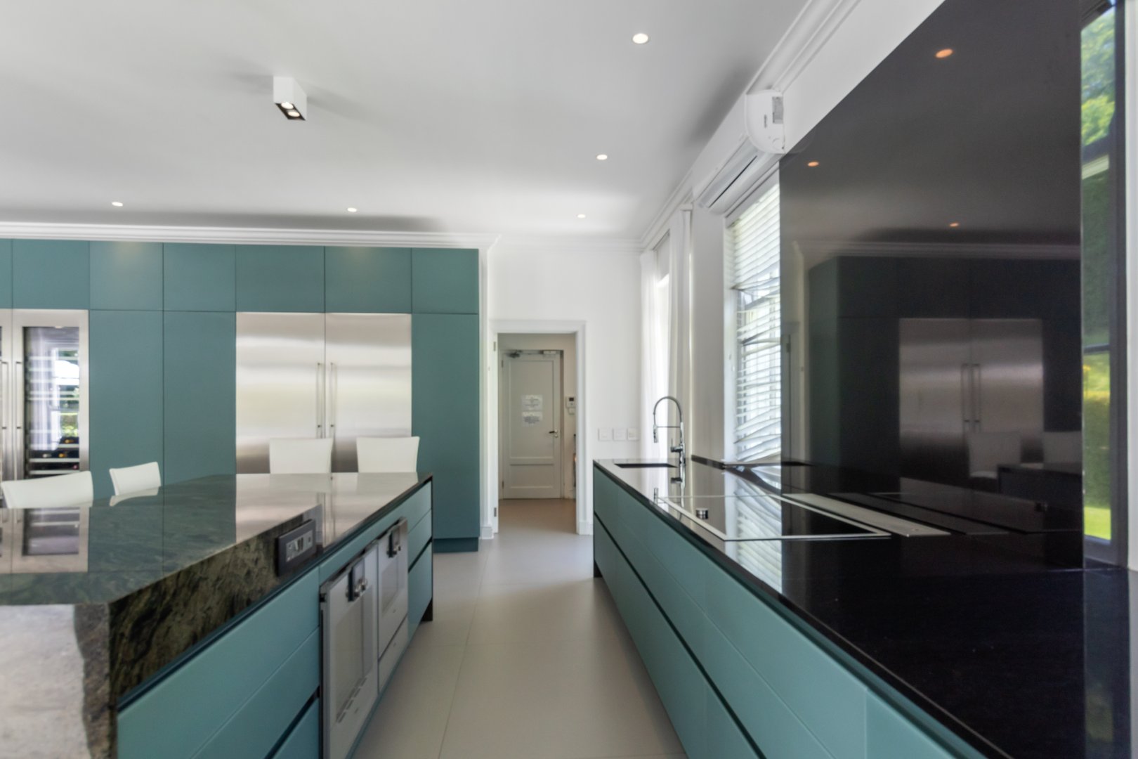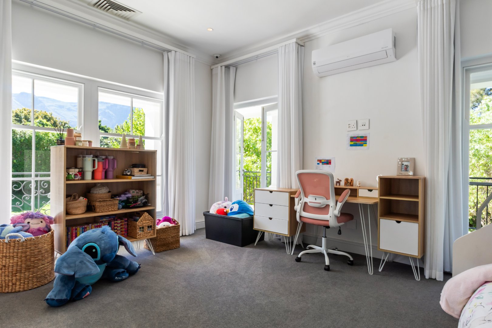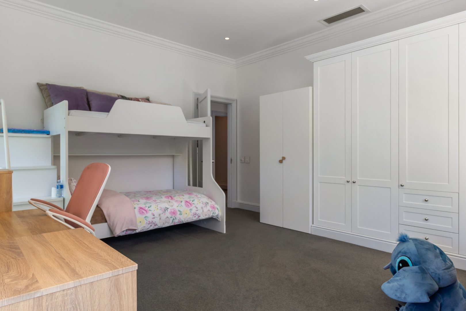 Designed for guests and extended family, the two-level guest wing features its own kitchen, living area, and two bedrooms, while the upper level of the main house includes a pyjama lounge, two sunny bedrooms, a family bathroom, and a third en-suite guest bedroom. The primary suite is a luxurious retreat with his-and-hers dressing rooms, a bespoke en-suite bathroom, and a private balcony.