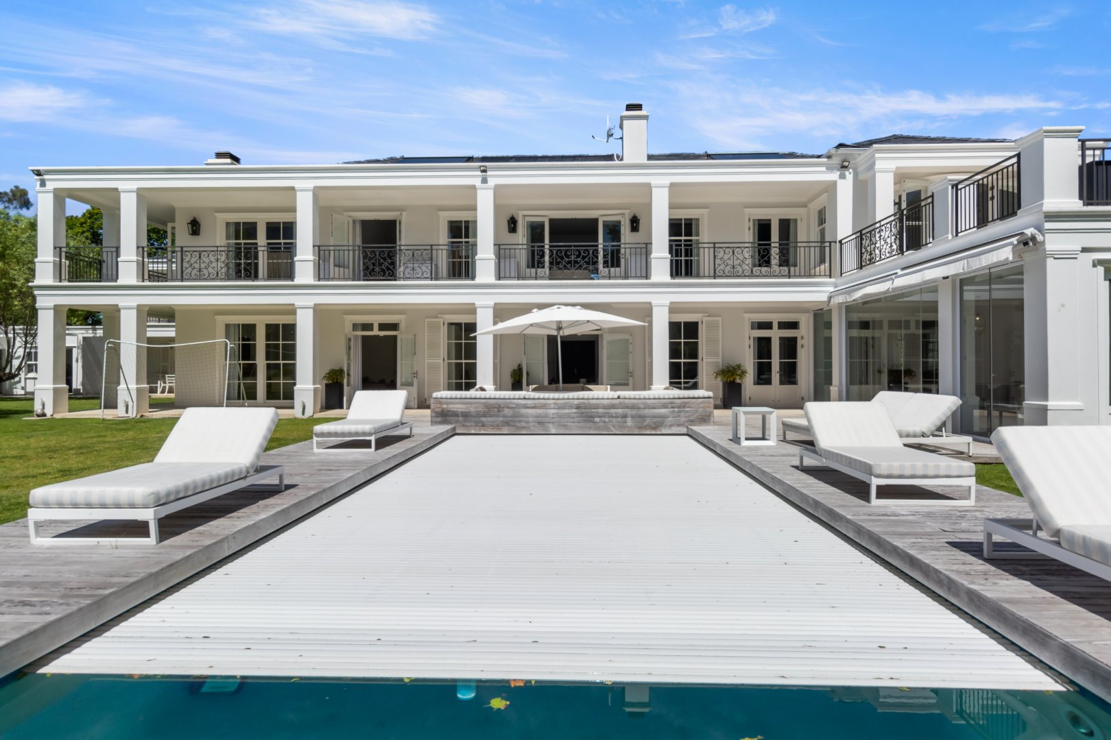 Additional features include staff accommodation, underfloor heating, lift access, inverter and generator, borehole with irrigation, pool heat pump and solar panels, and state-of-the-art security.