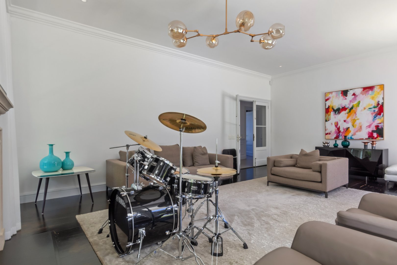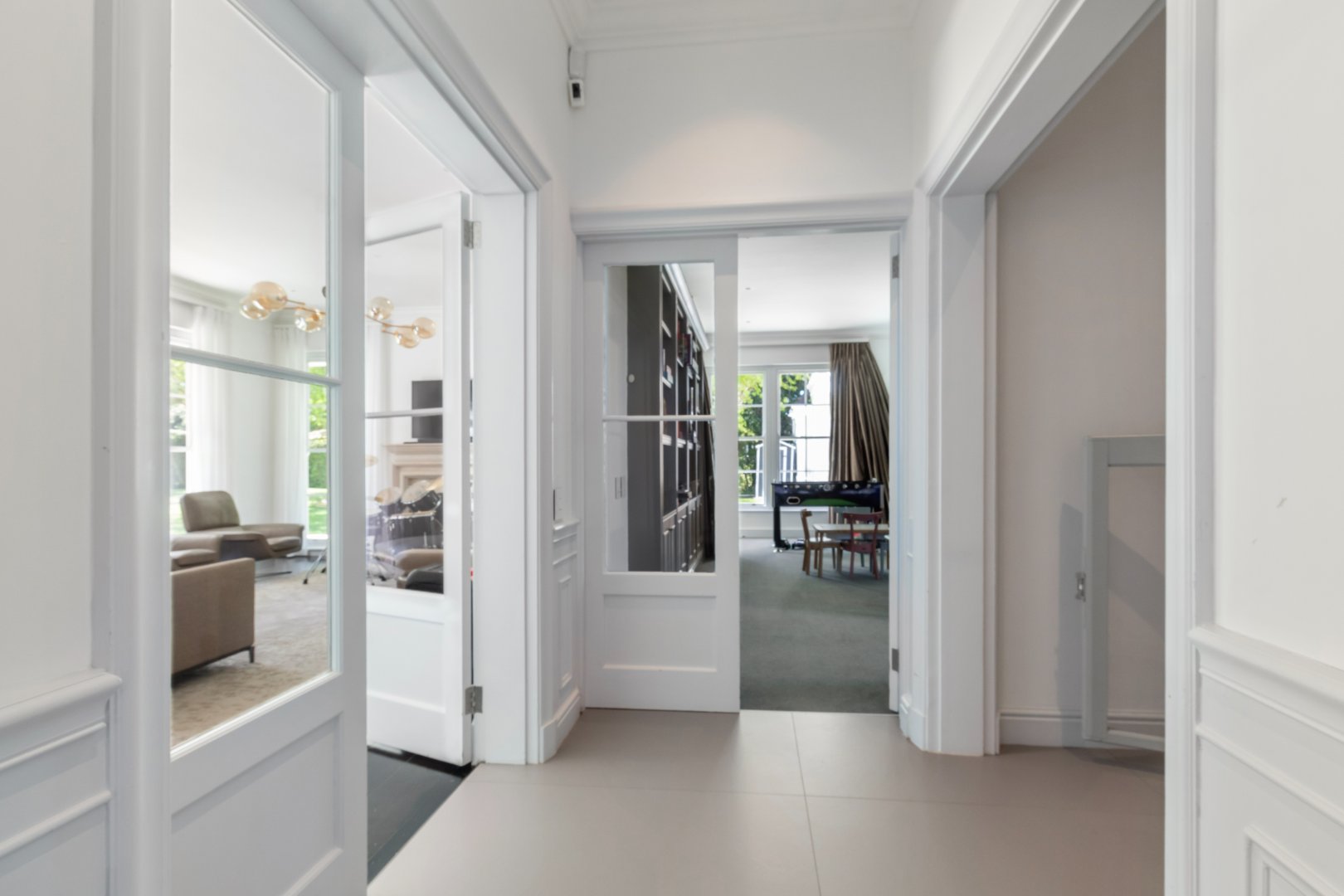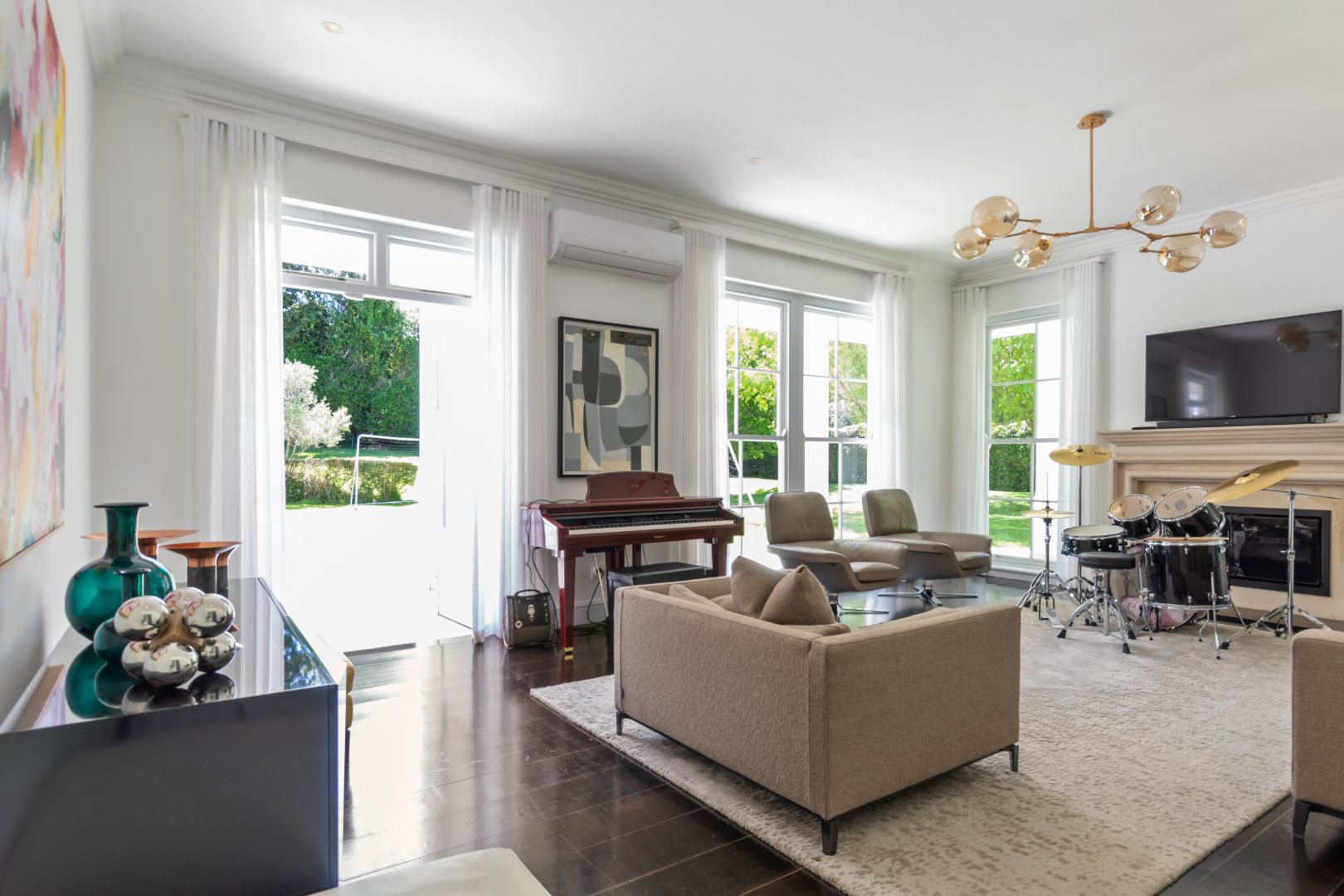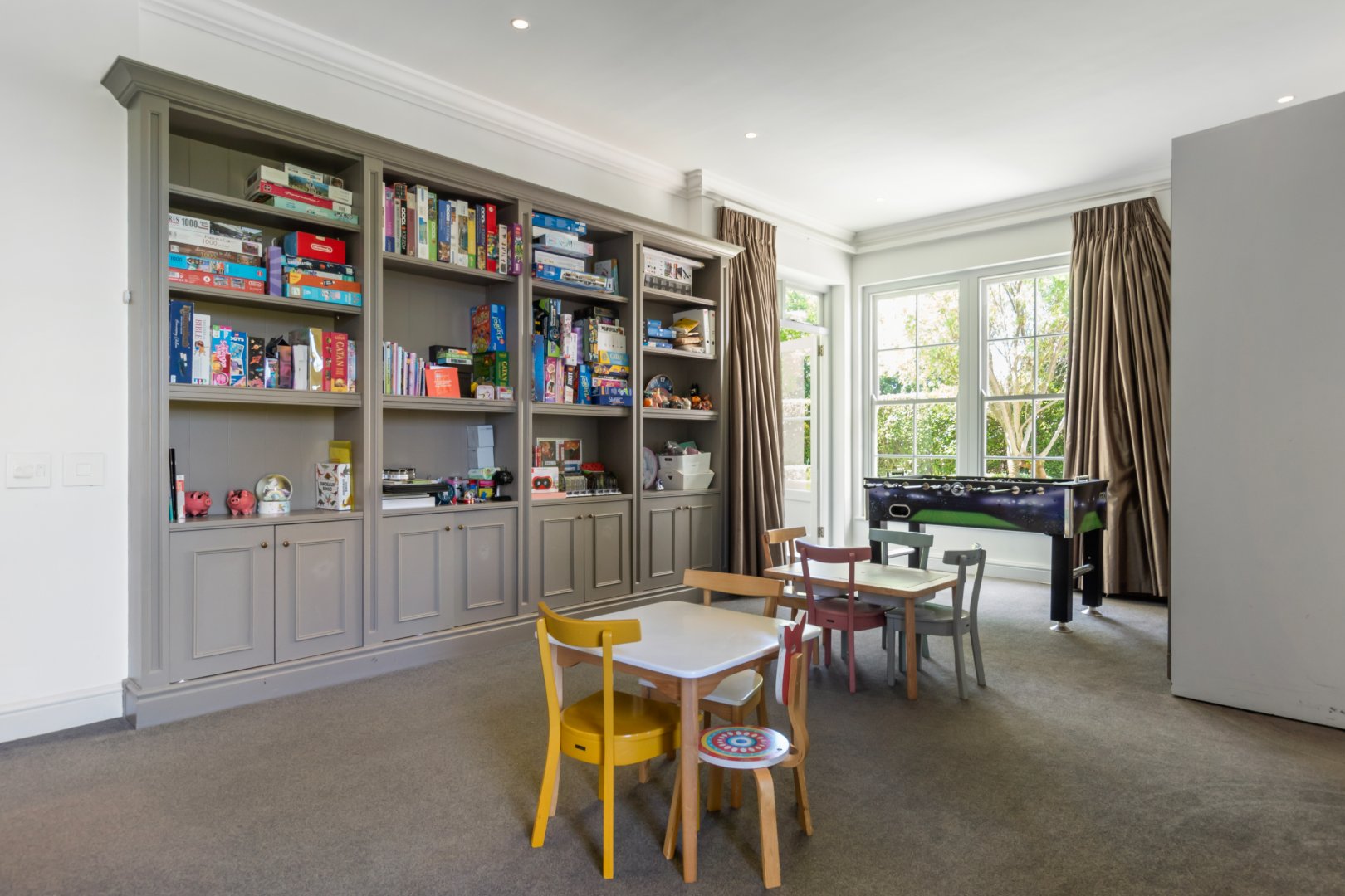 The grand entrance hall opens to expansive living spaces perfect for family life and entertaining. The kitchen, fitted with premium Gaggenhau appliances, flows seamlessly into an open-plan dining area with a wood-burning fireplace, while an adjacent scullery and laundry offer practical convenience. Additional spaces include a study, living/music room, and a children’s playroom.