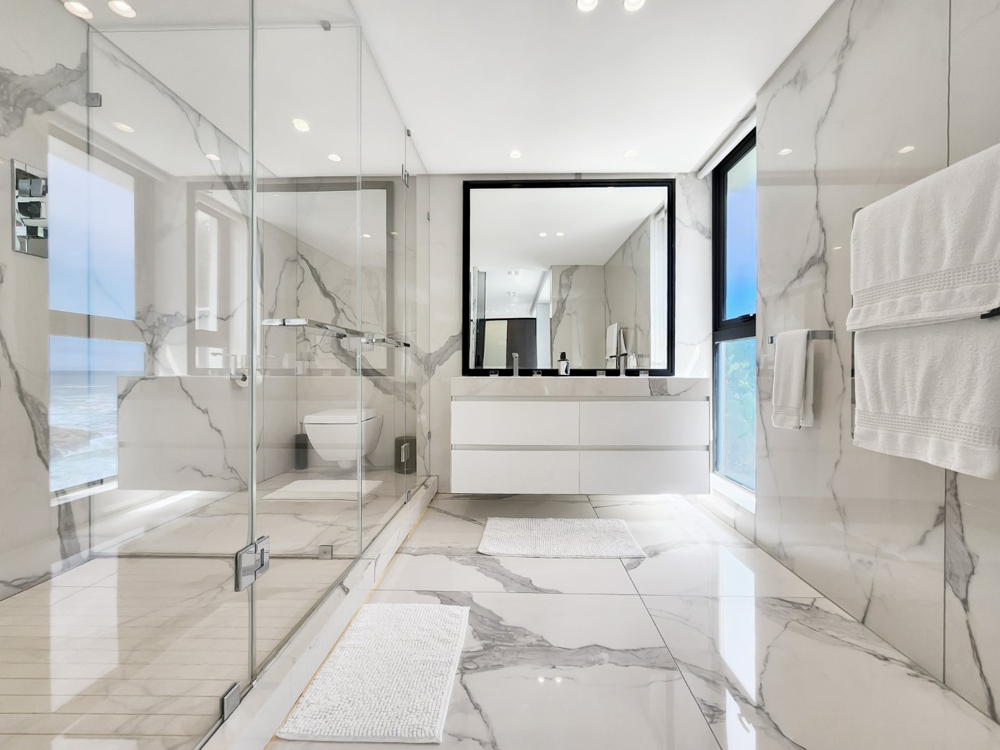 This sophisticated residence unfolds over multiple levels and features five luxurious bedroom suites, each one designed as a private retreat where comfort and style converge. Floor-to-ceiling glass doors invite natural light and ocean vistas into every room, while generous proportions and bespoke finishes create a timeless sense of refinement.