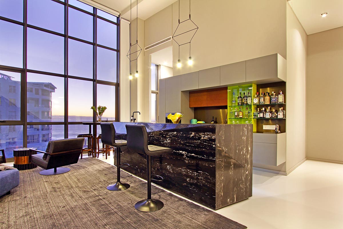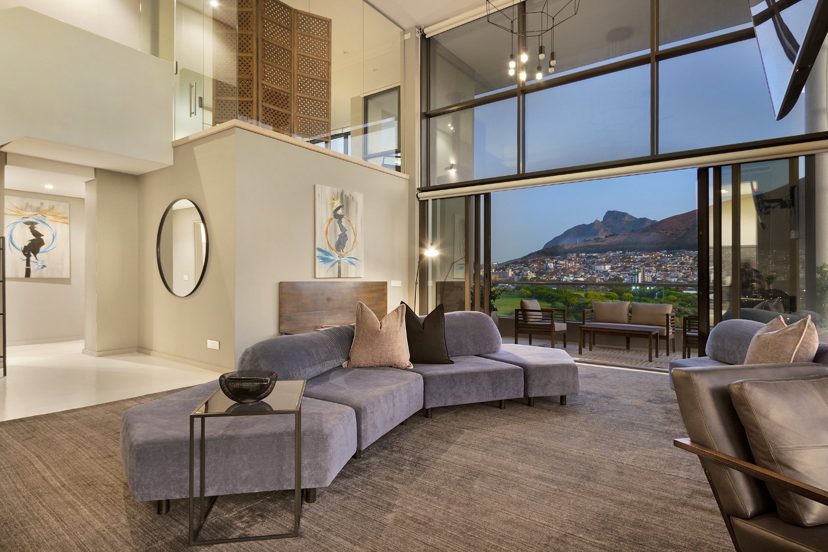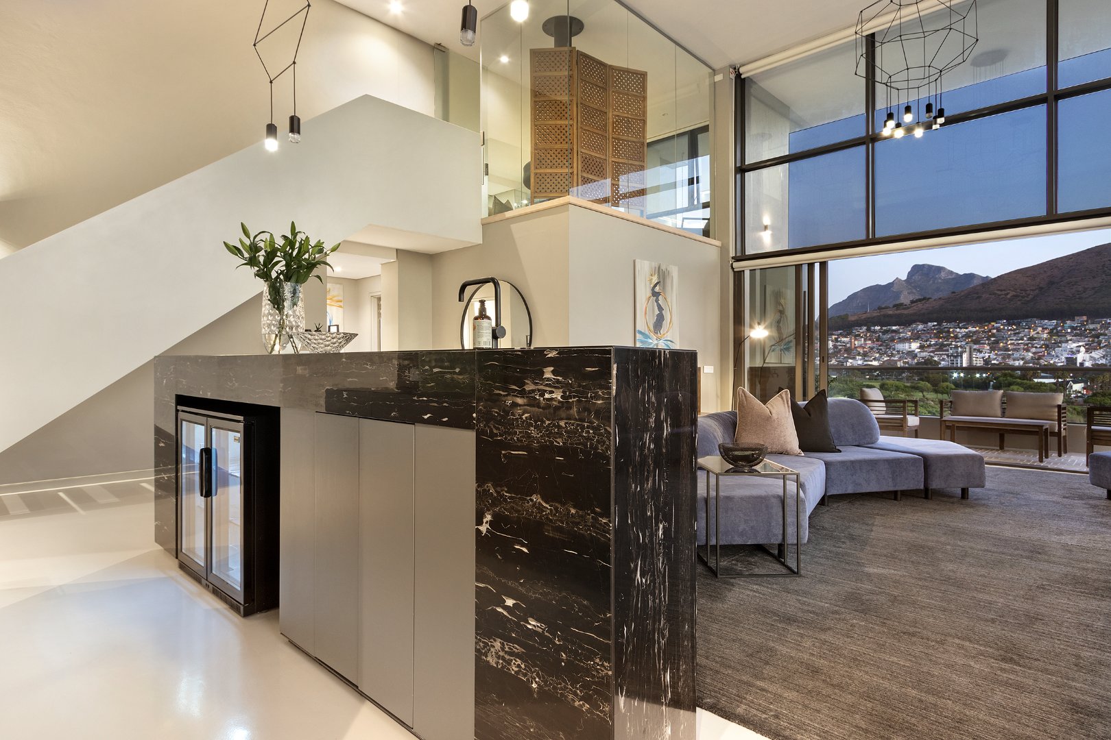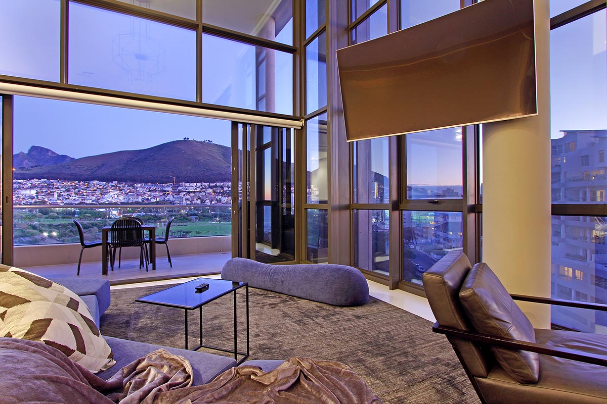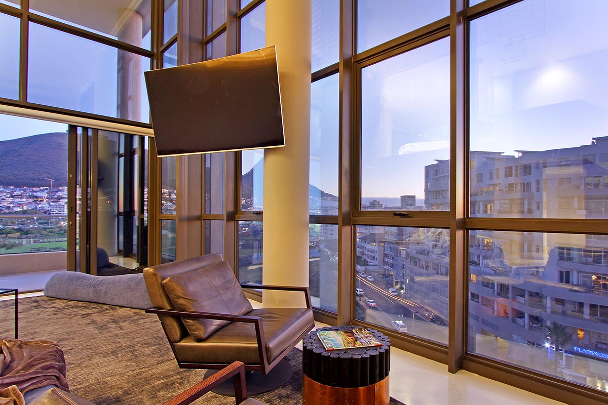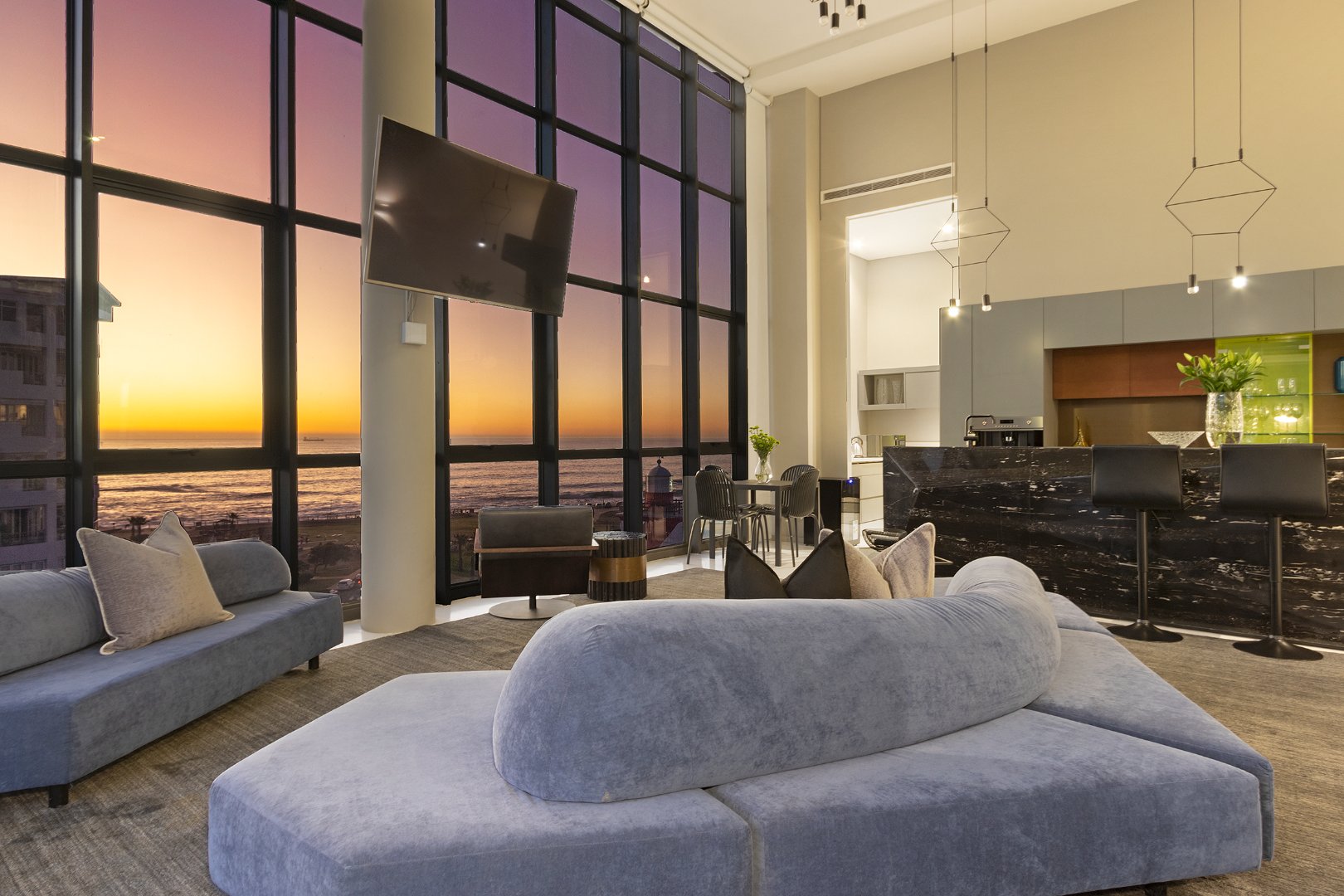 Flooded with natural light, the apartment boasts breathtaking panoramic views of the ocean, mountains, golf course, and city skyline. The spacious double-volume design enhances the sense of openness, creating a sophisticated yet comfortable retreat ideal for holidaymakers or business travellers.