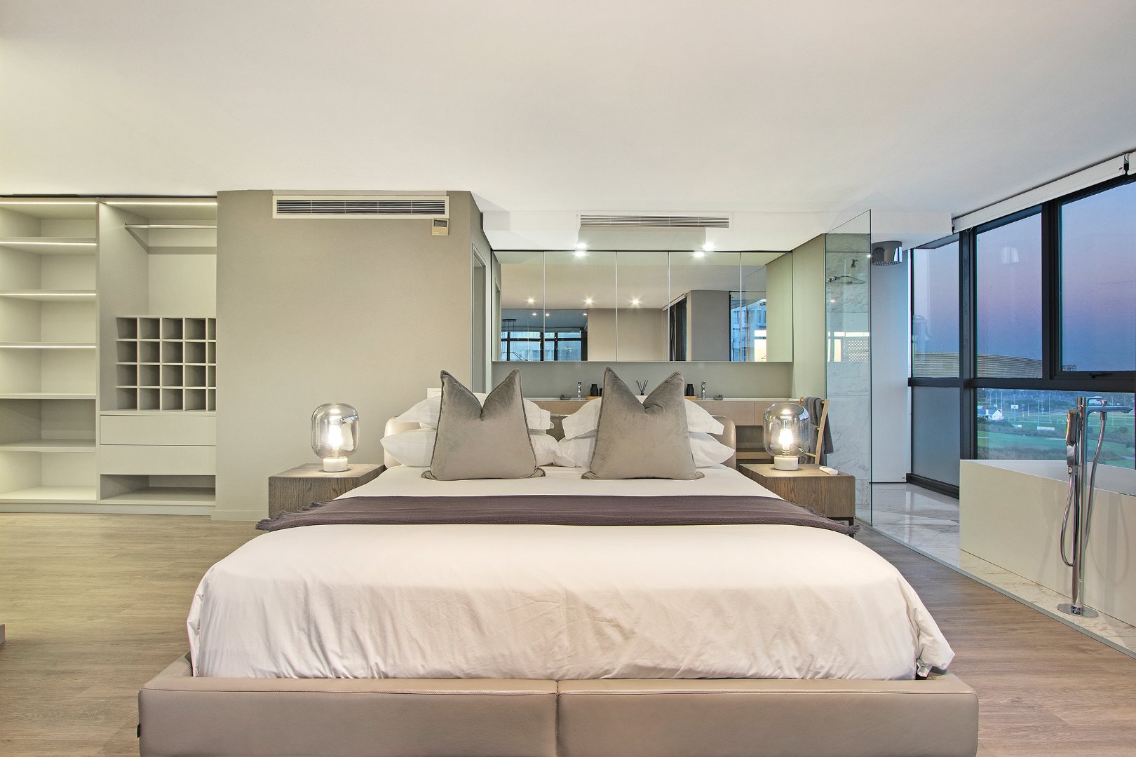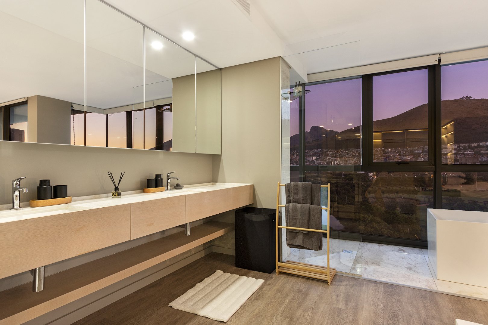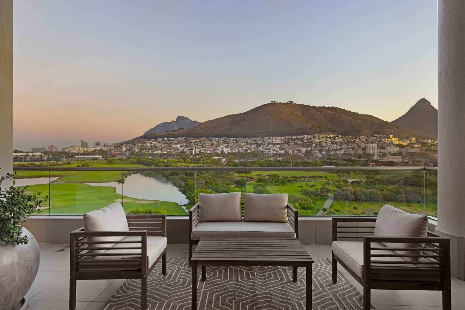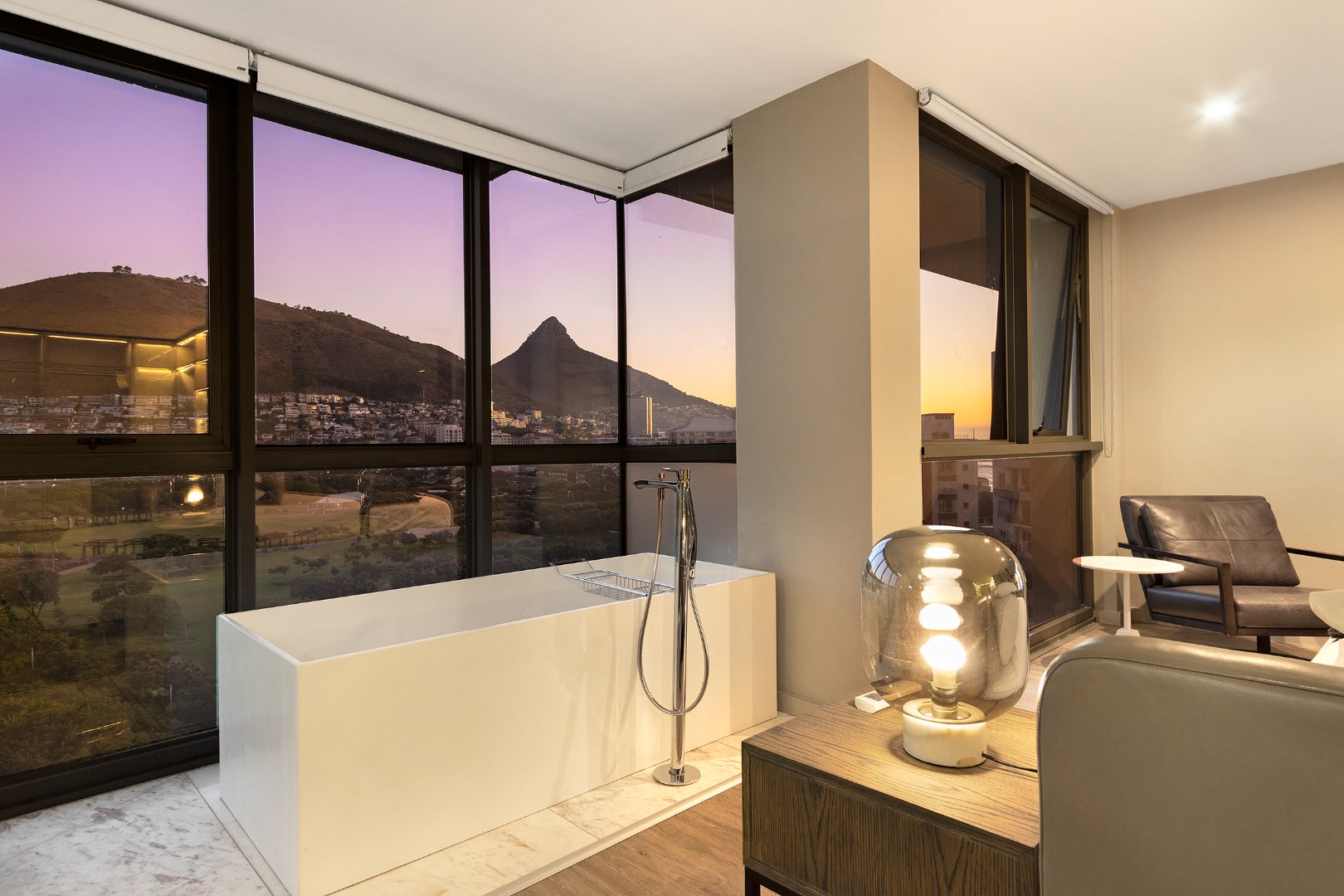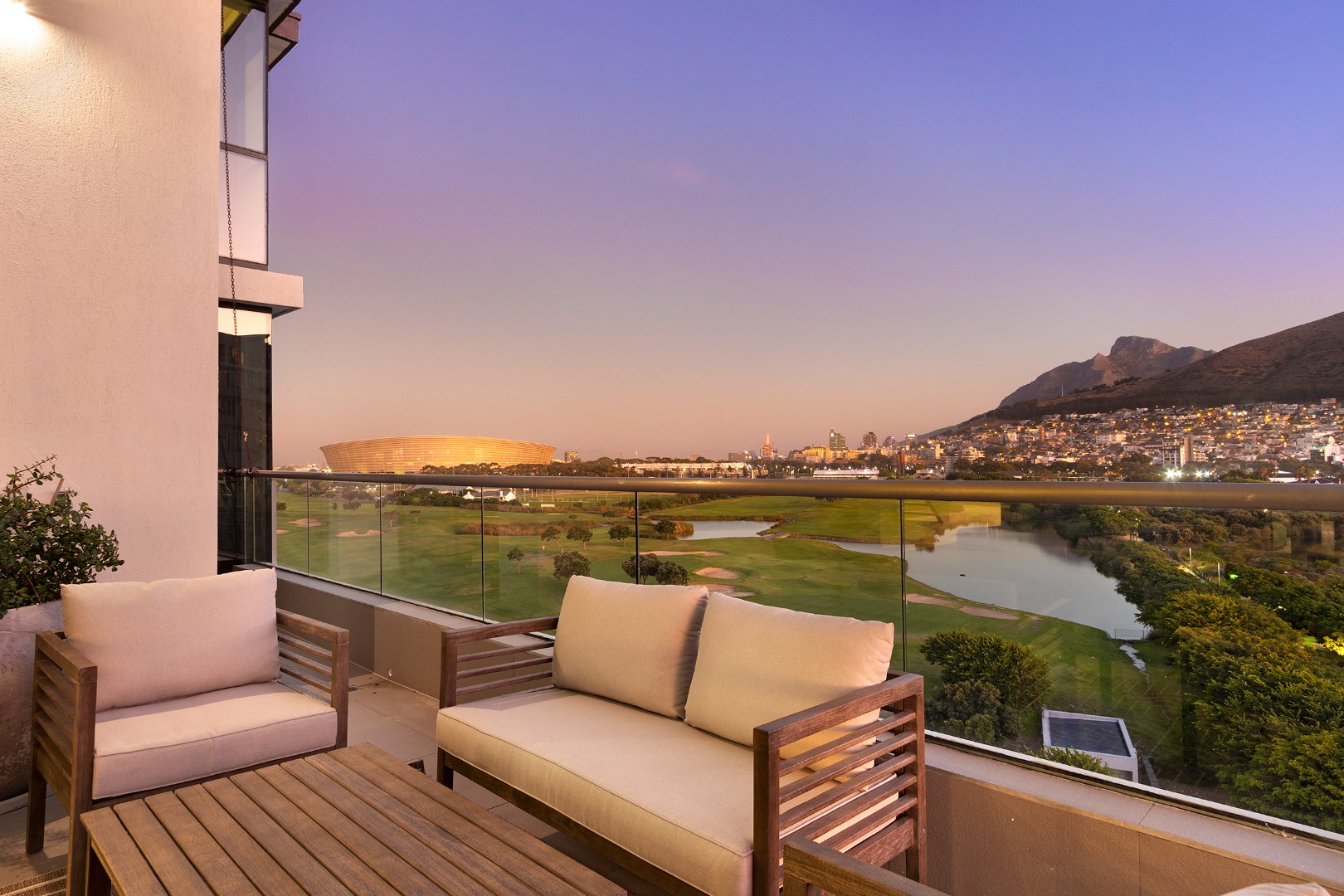 Flooded with natural light, the apartment boasts breathtaking panoramic views of the ocean, mountains, golf course, and city skyline. The spacious double-volume design enhances the sense of openness, creating a sophisticated yet comfortable retreat ideal for holidaymakers or business travellers.