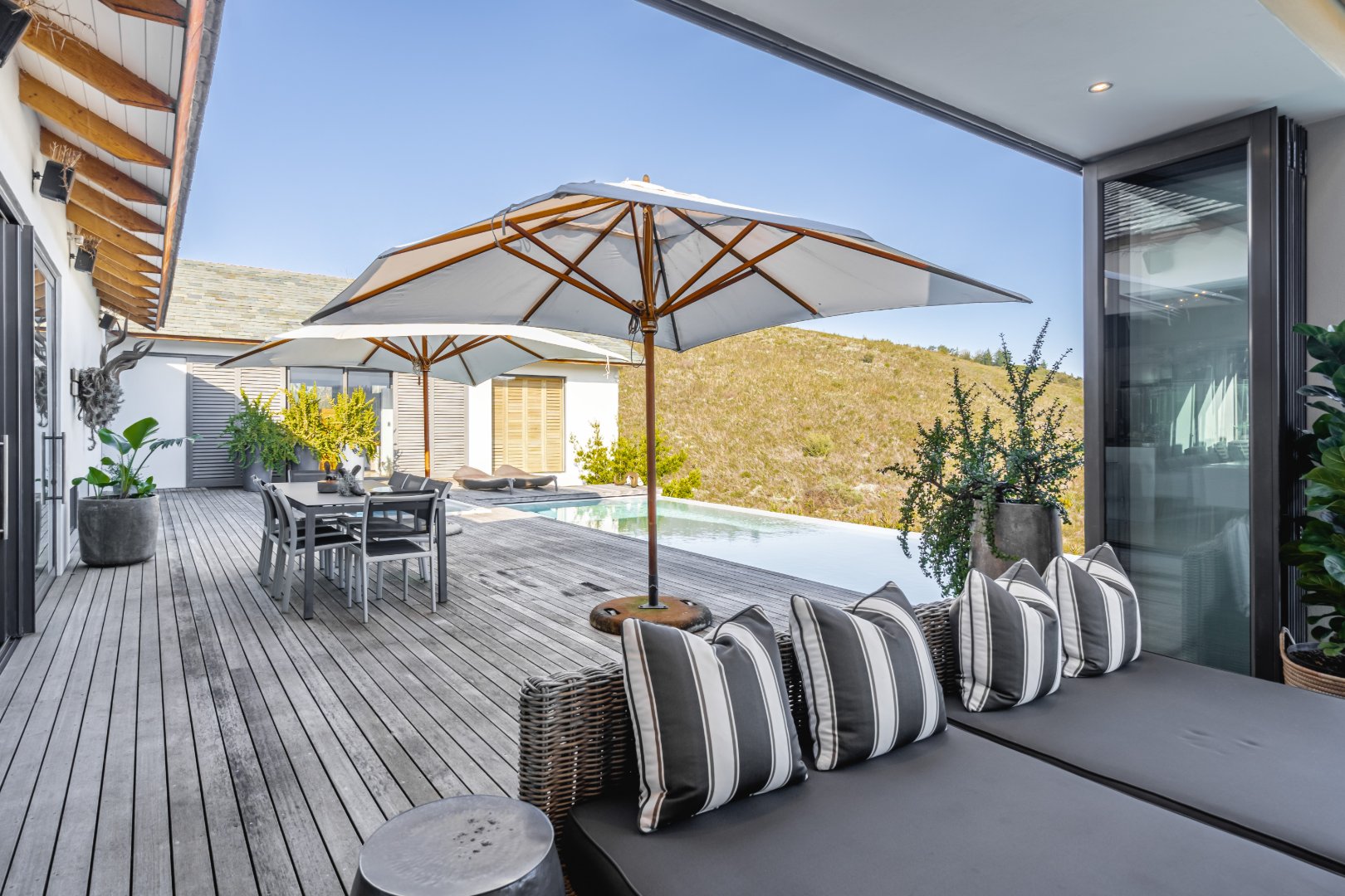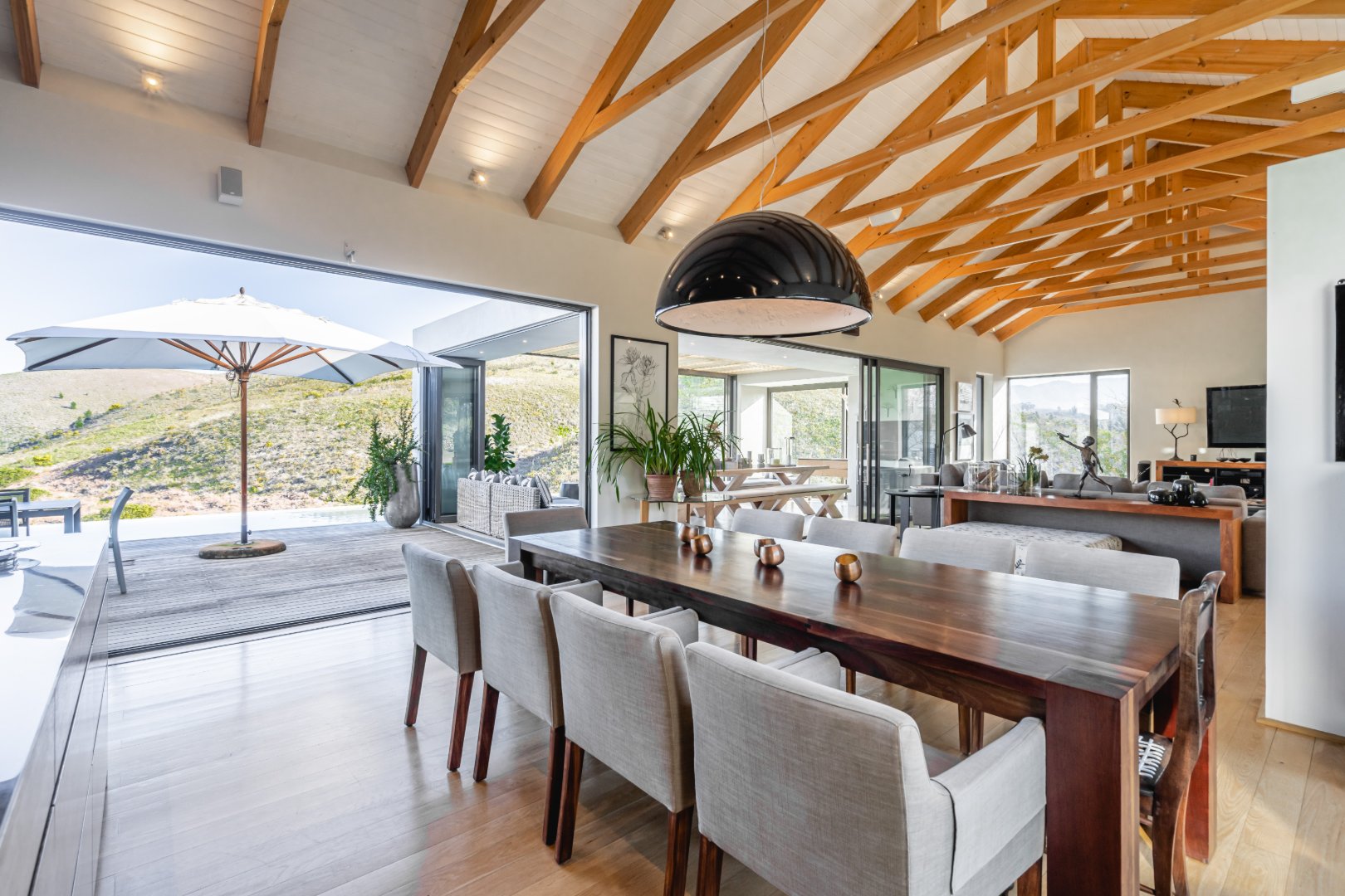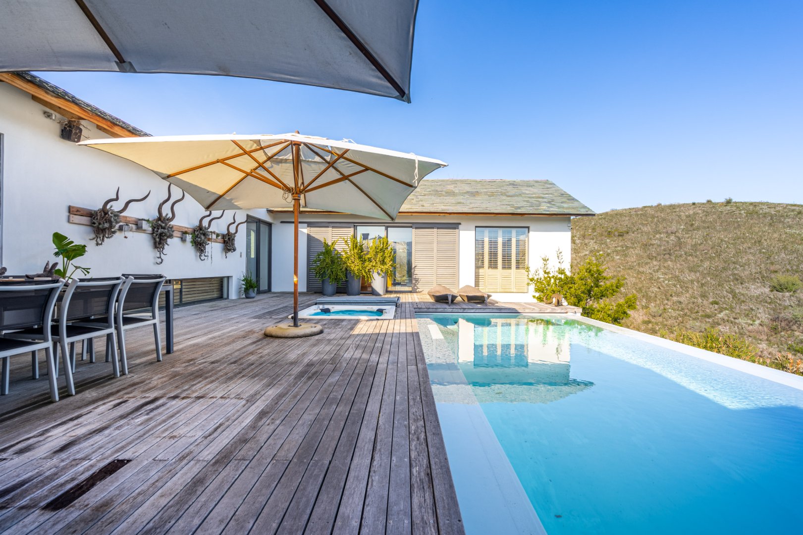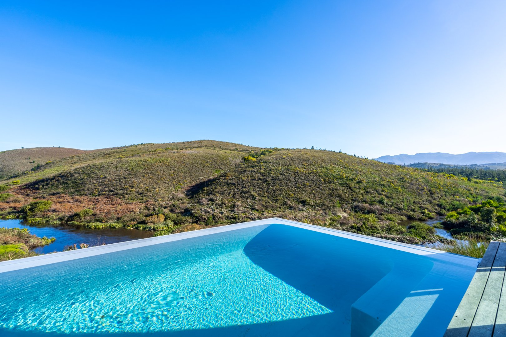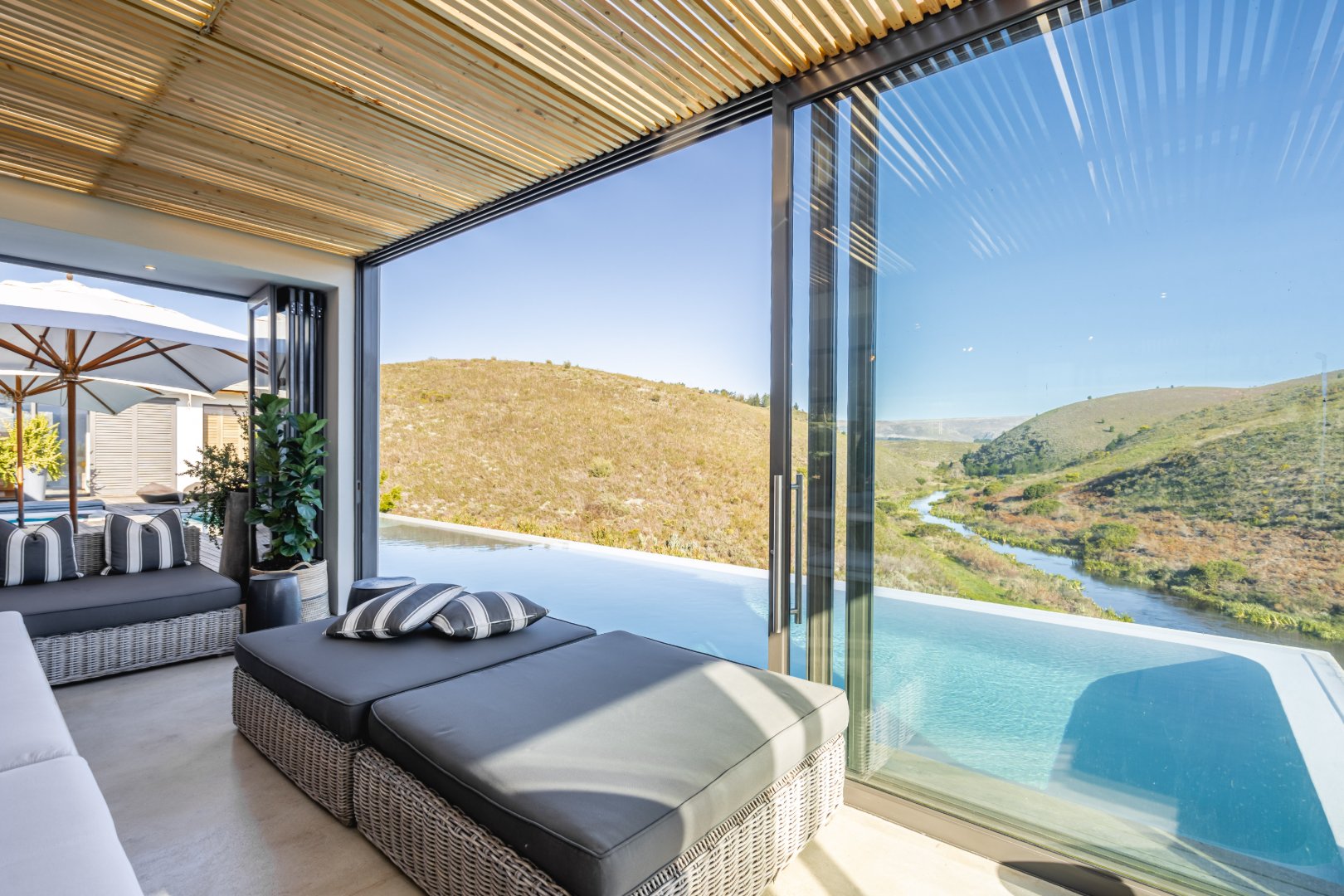 The outdoor living experience is simply spectacular. A striking pool and hot tub terrace overlook the winding Palmiet River, creating an idyllic setting for sunset gatherings, alfresco dining, or quiet moments immersed in the serenity of the surrounding landscape.