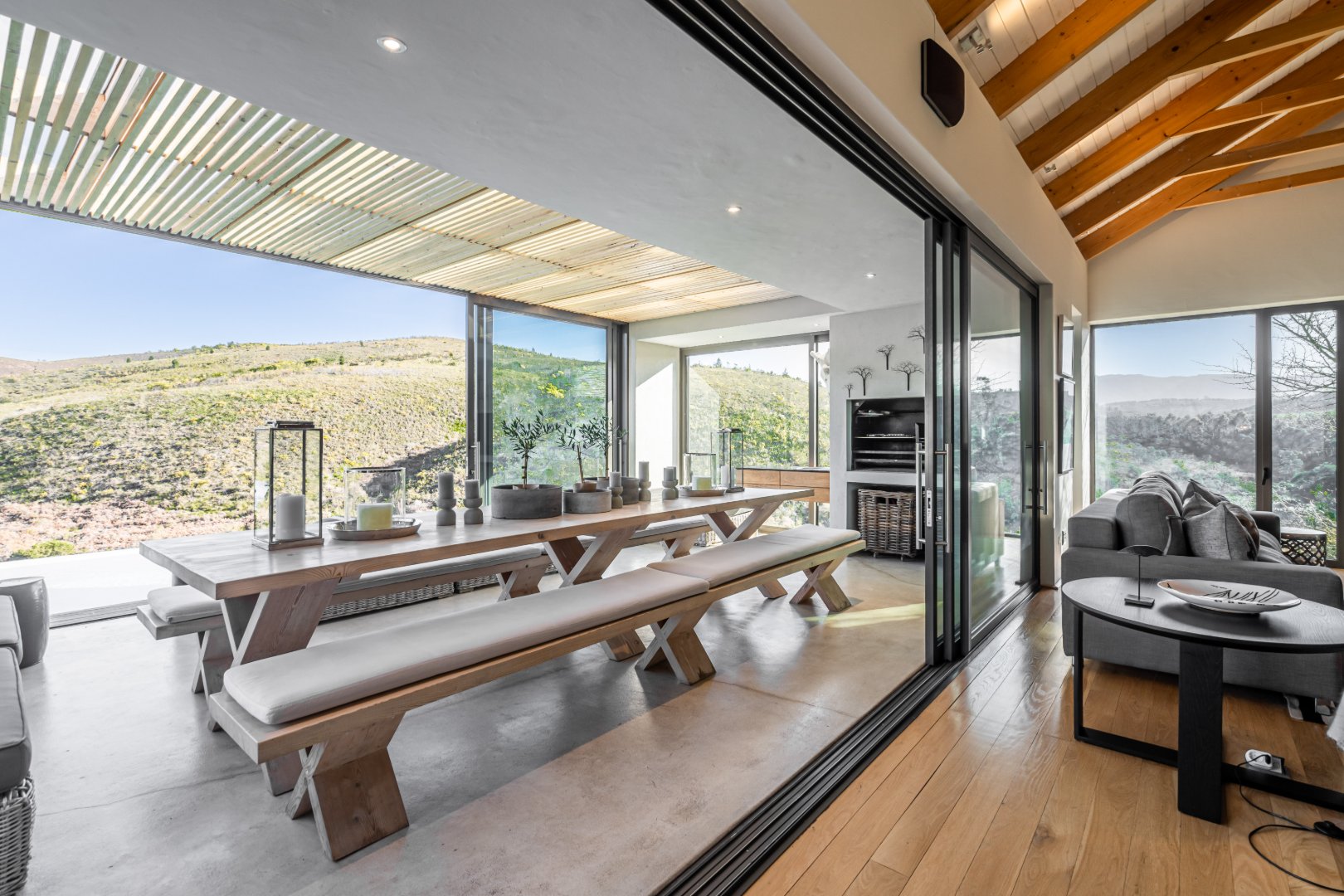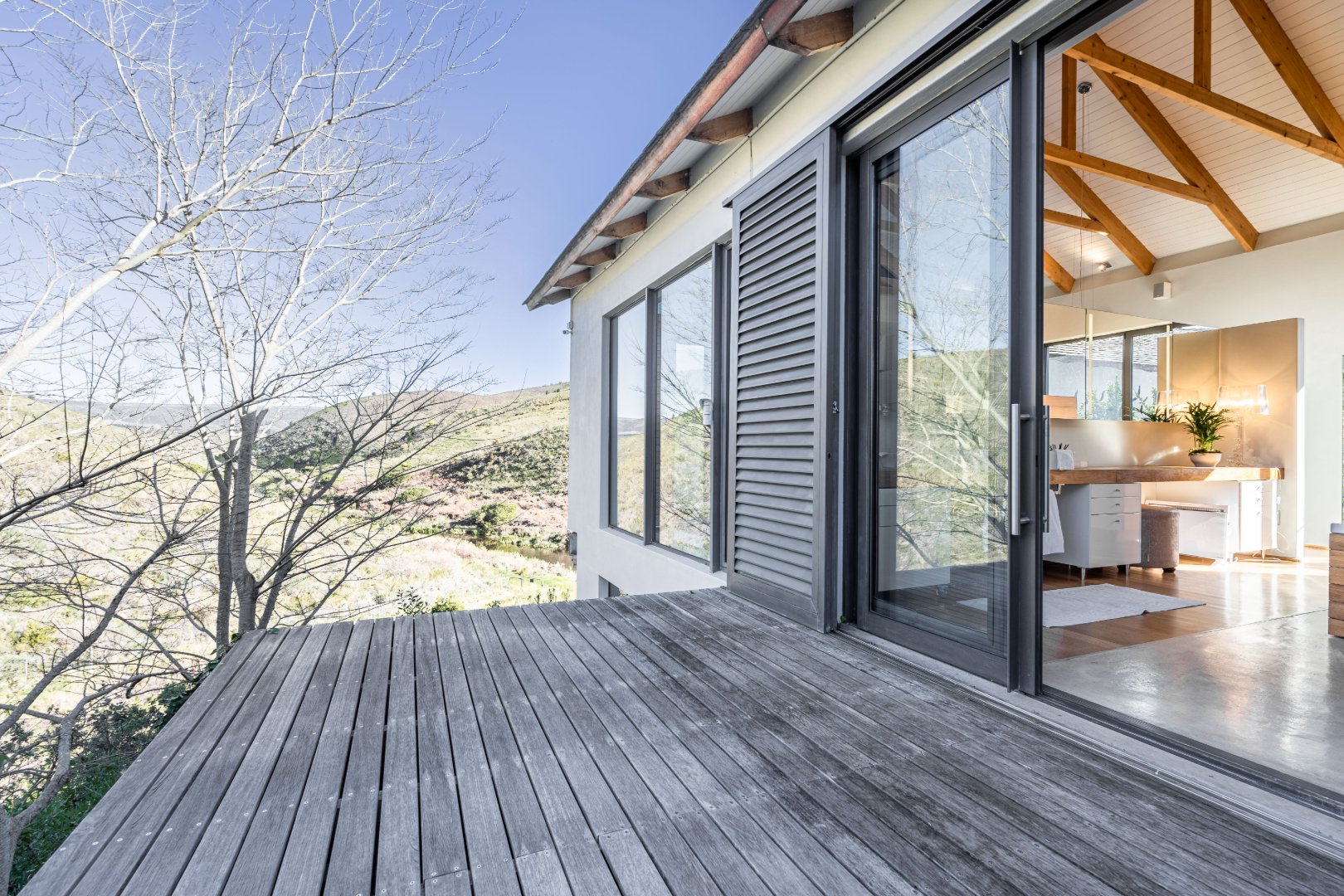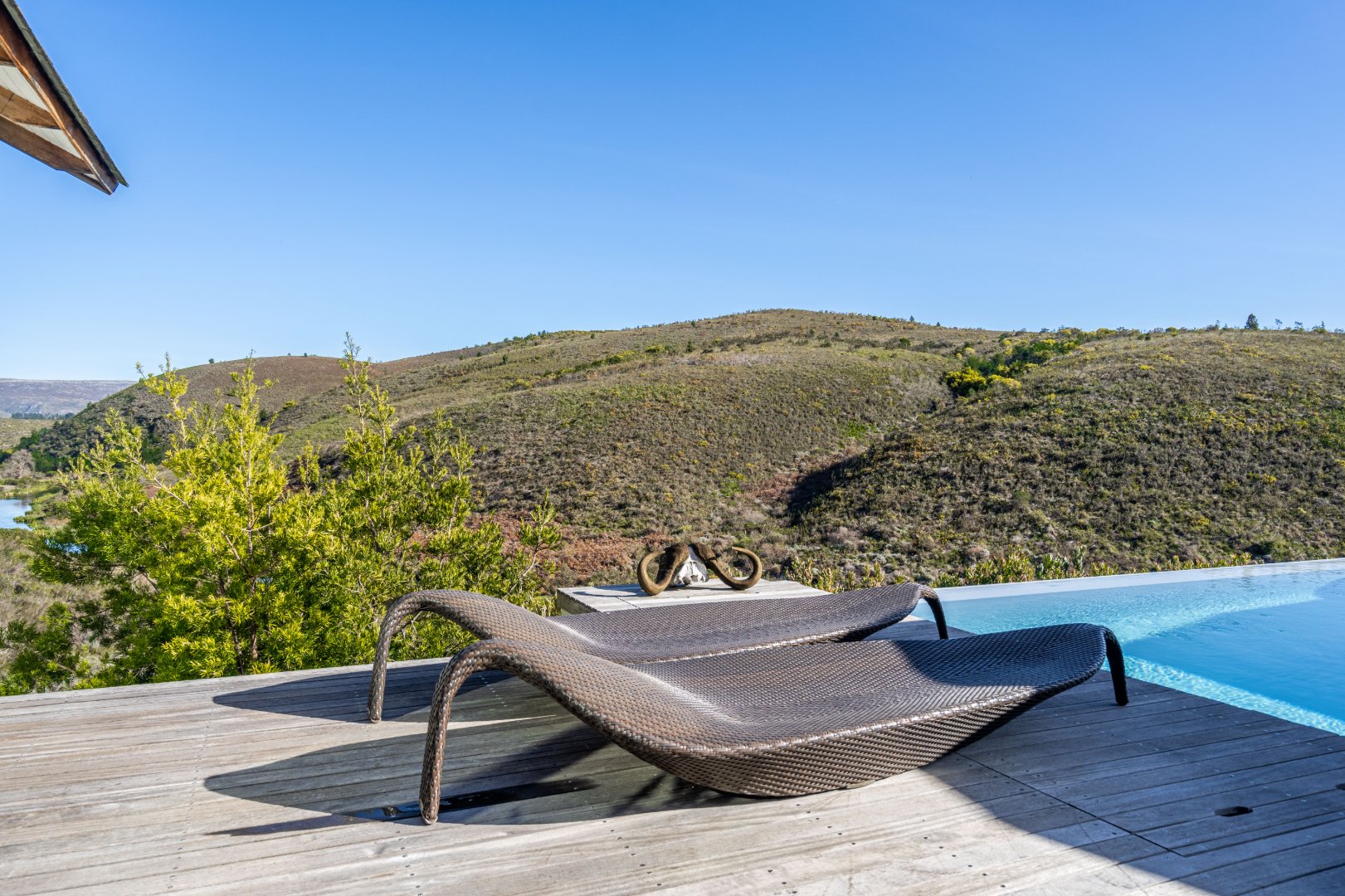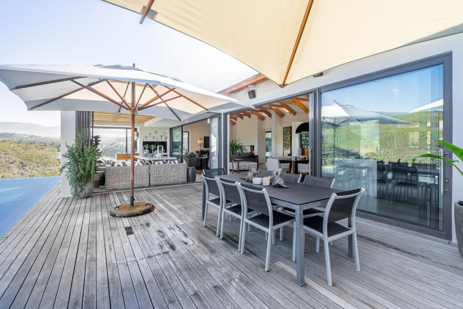The outdoor living experience is simply spectacular. A striking pool and hot tub terrace overlook the winding Palmiet River, creating an idyllic setting for sunset gatherings, alfresco dining, or quiet moments immersed in the serenity of the surrounding landscape.