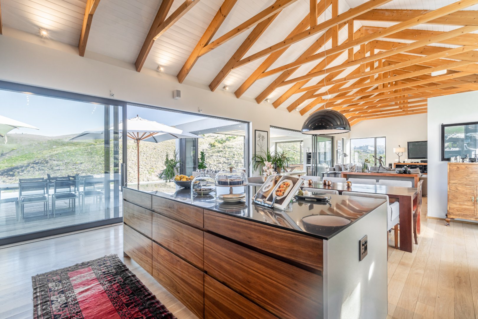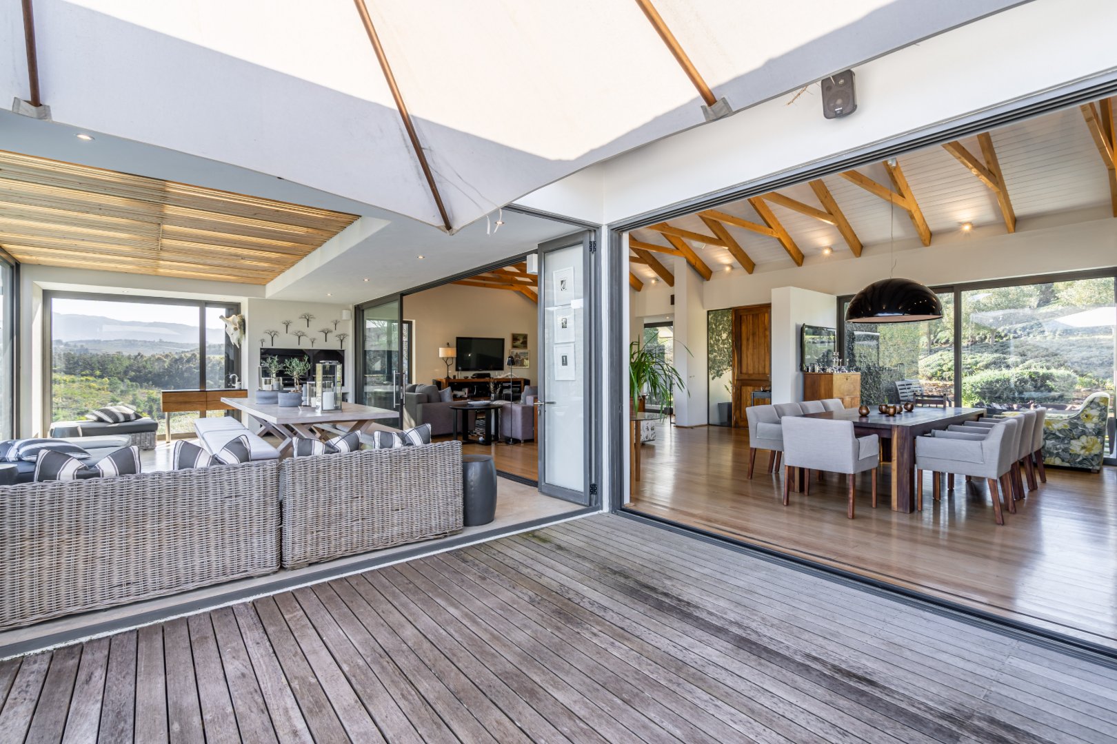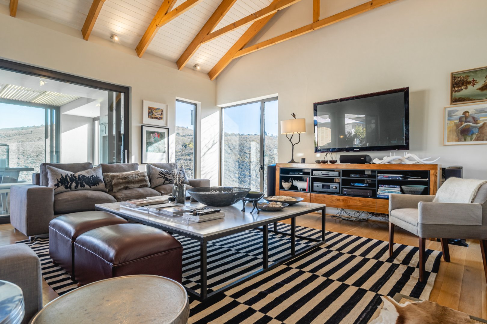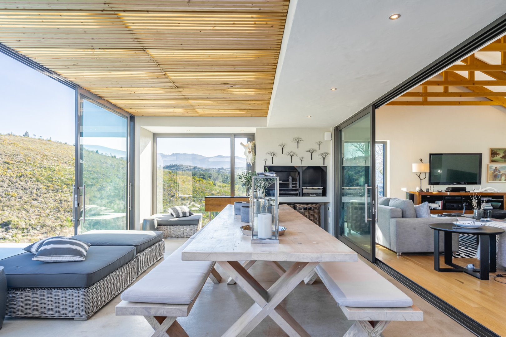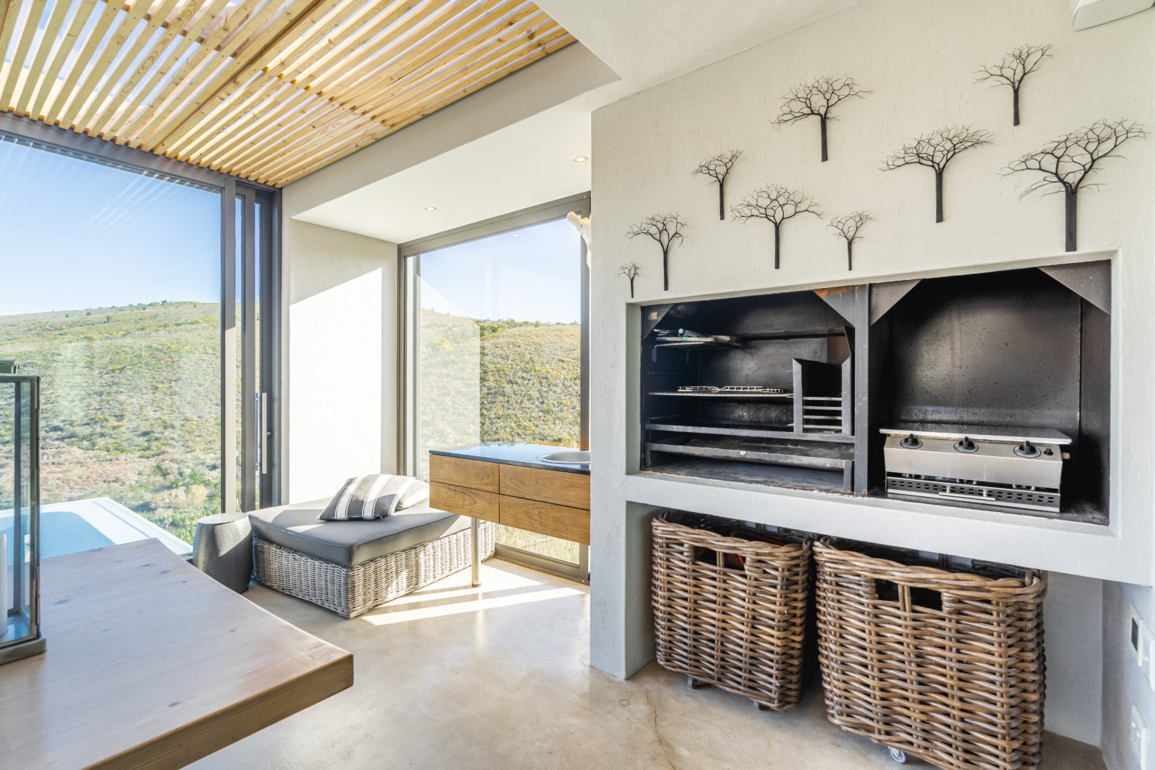 The outdoor living experience is simply spectacular. A striking pool and hot tub terrace overlook the winding Palmiet River, creating an idyllic setting for sunset gatherings, alfresco dining, or quiet moments immersed in the serenity of the surrounding landscape.