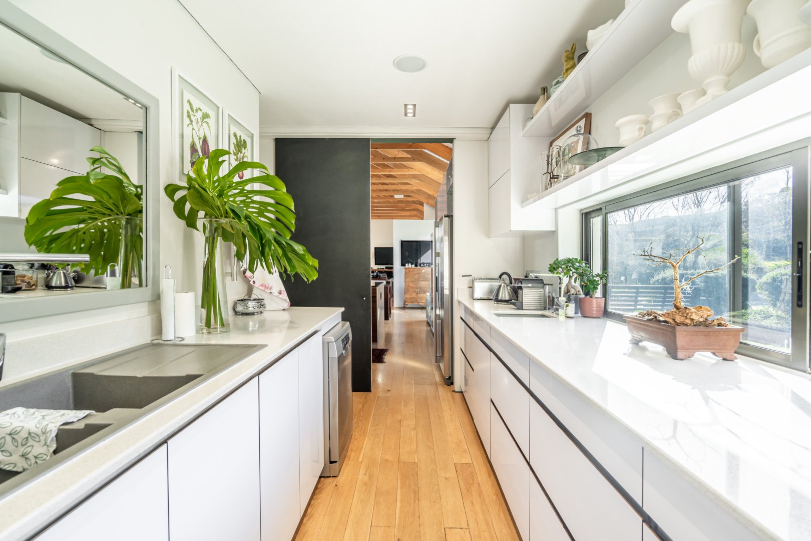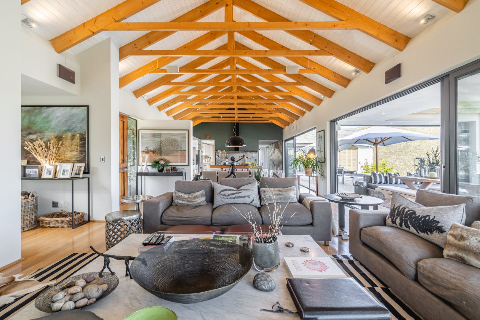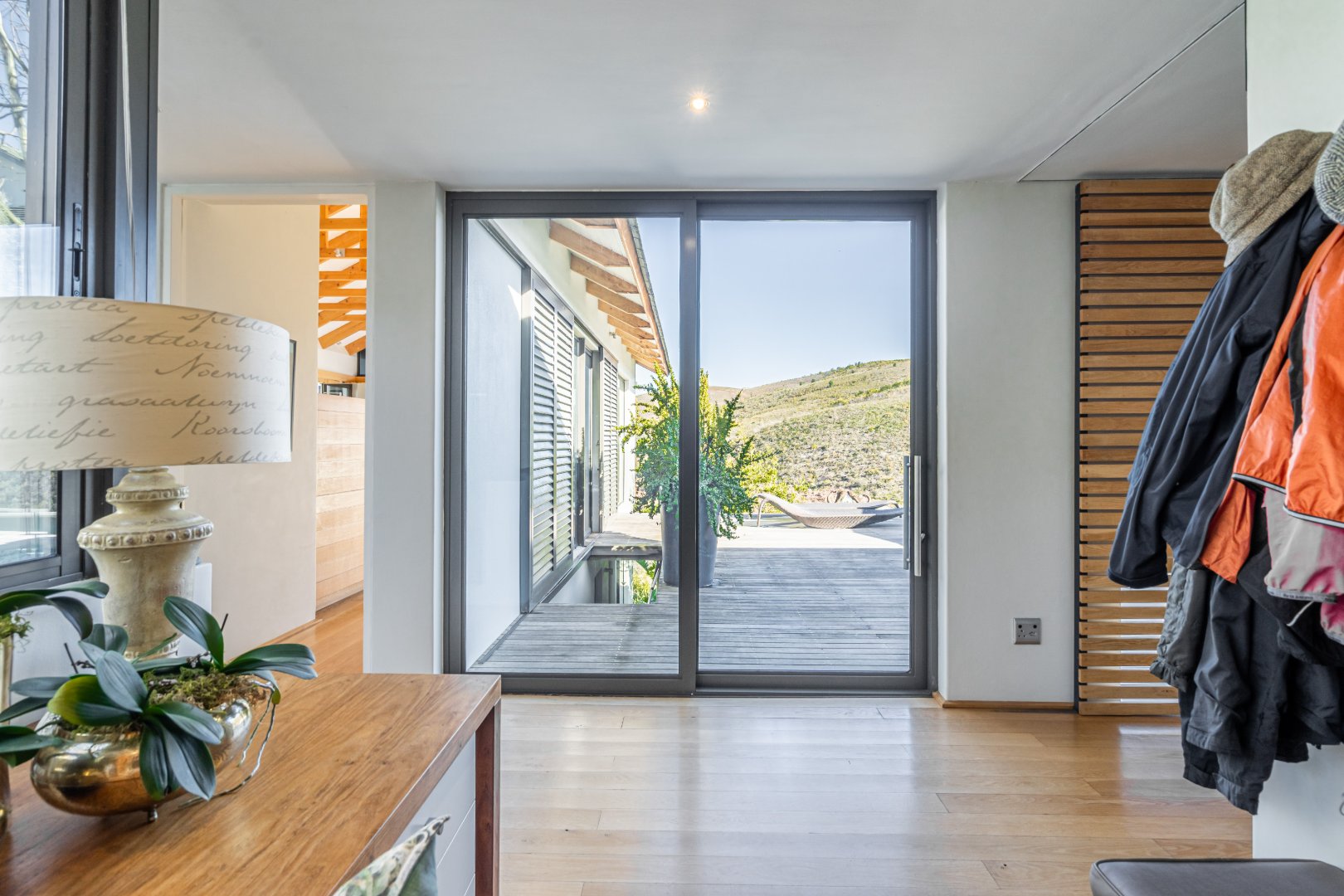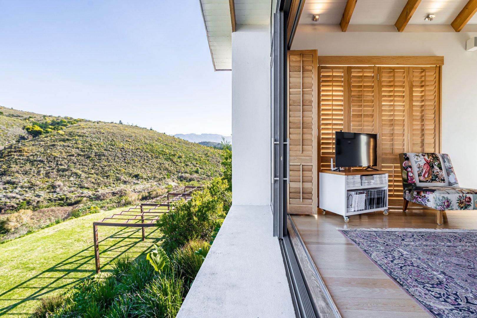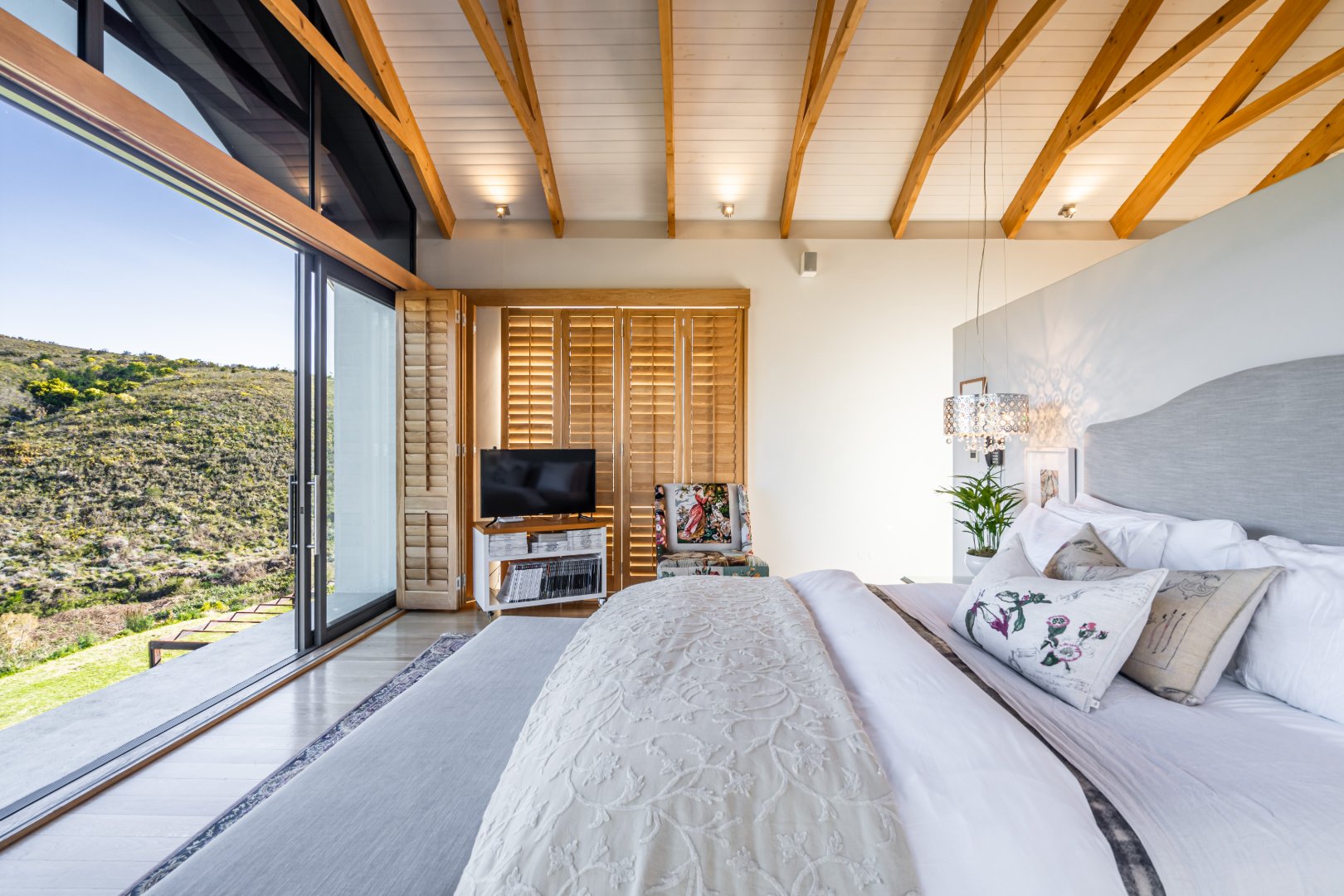 The outdoor living experience is simply spectacular. A striking pool and hot tub terrace overlook the winding Palmiet River, creating an idyllic setting for sunset gatherings, alfresco dining, or quiet moments immersed in the serenity of the surrounding landscape.