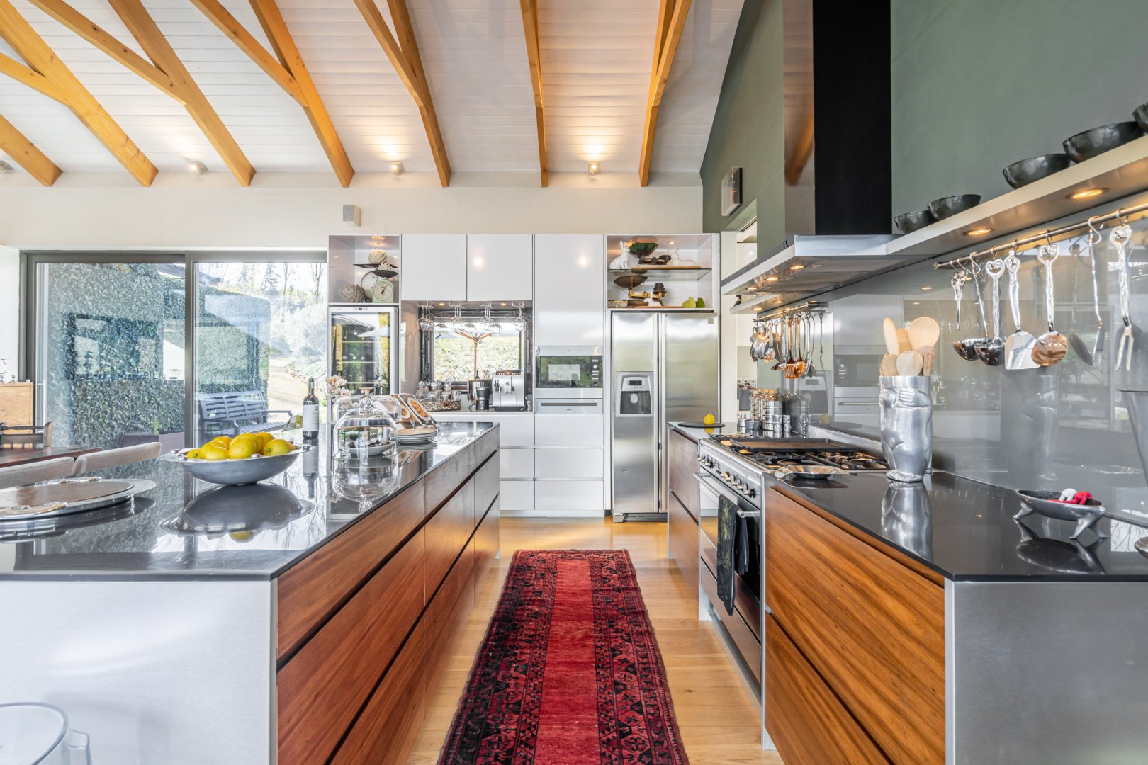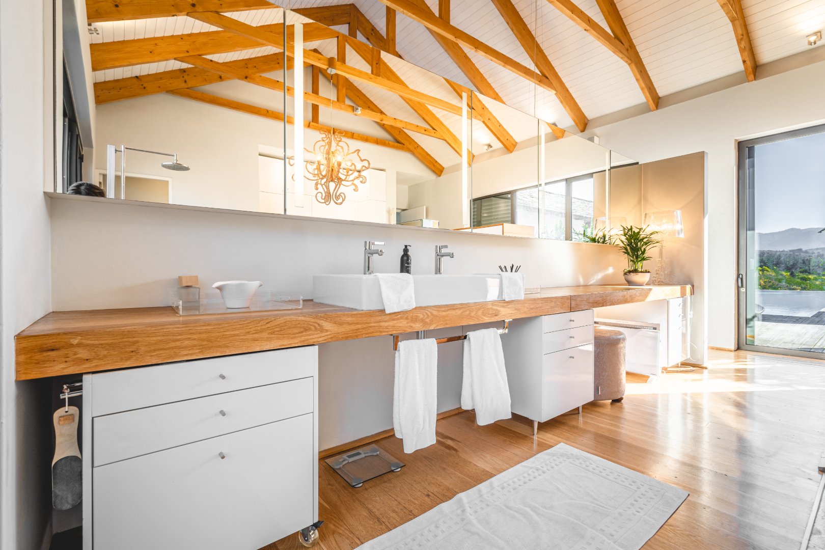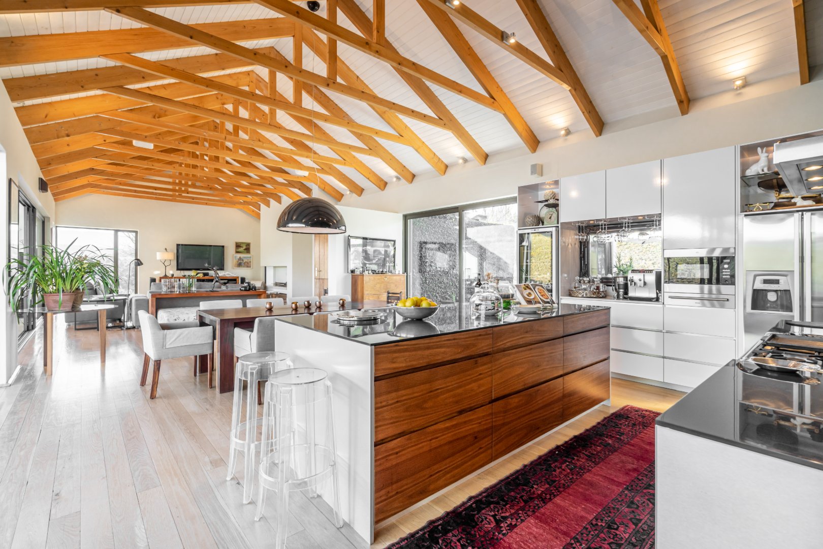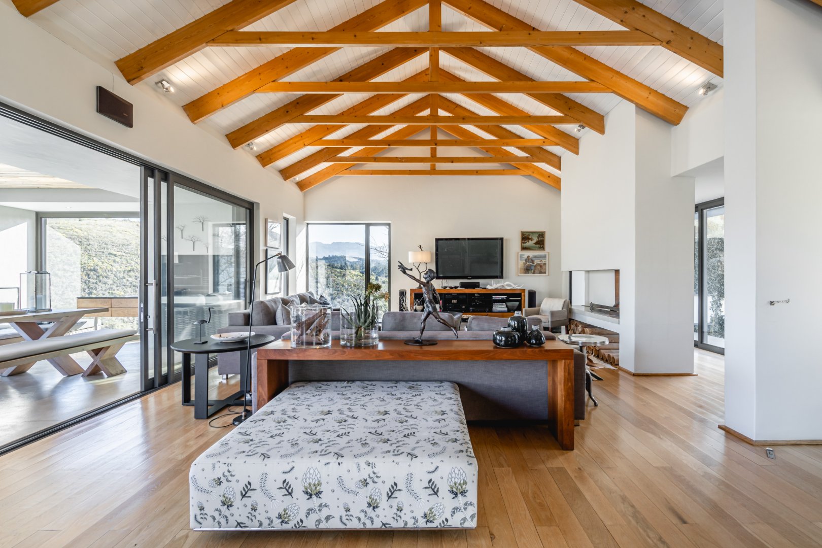 Designed for both elegant living and world-class entertaining, the home unfolds through expansive open-plan living spaces that seamlessly extend onto panoramic terraces overlooking the river and surrounding mountains. Large glass openings frame the ever-changing landscape, inviting natural light and breathtaking views into every corner of the home while creating a harmonious indoor–outdoor flow.