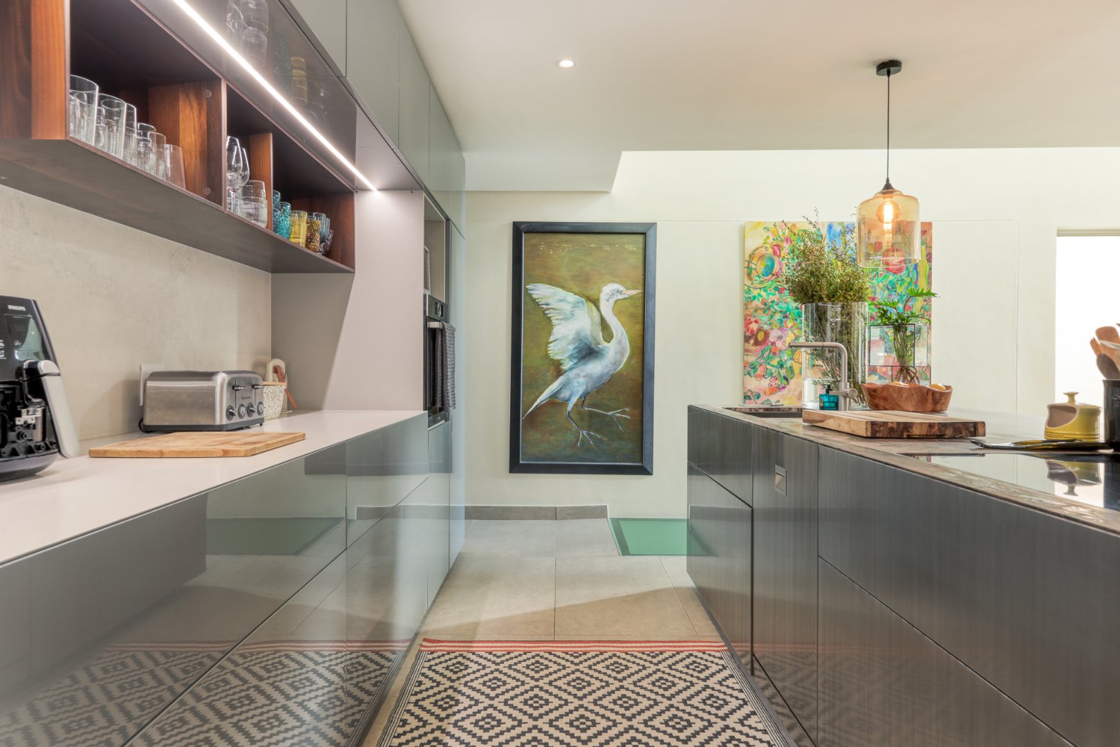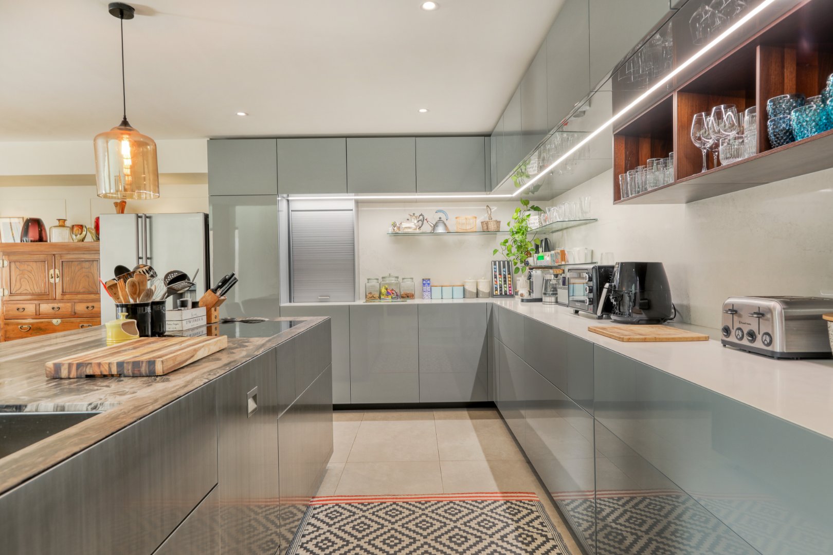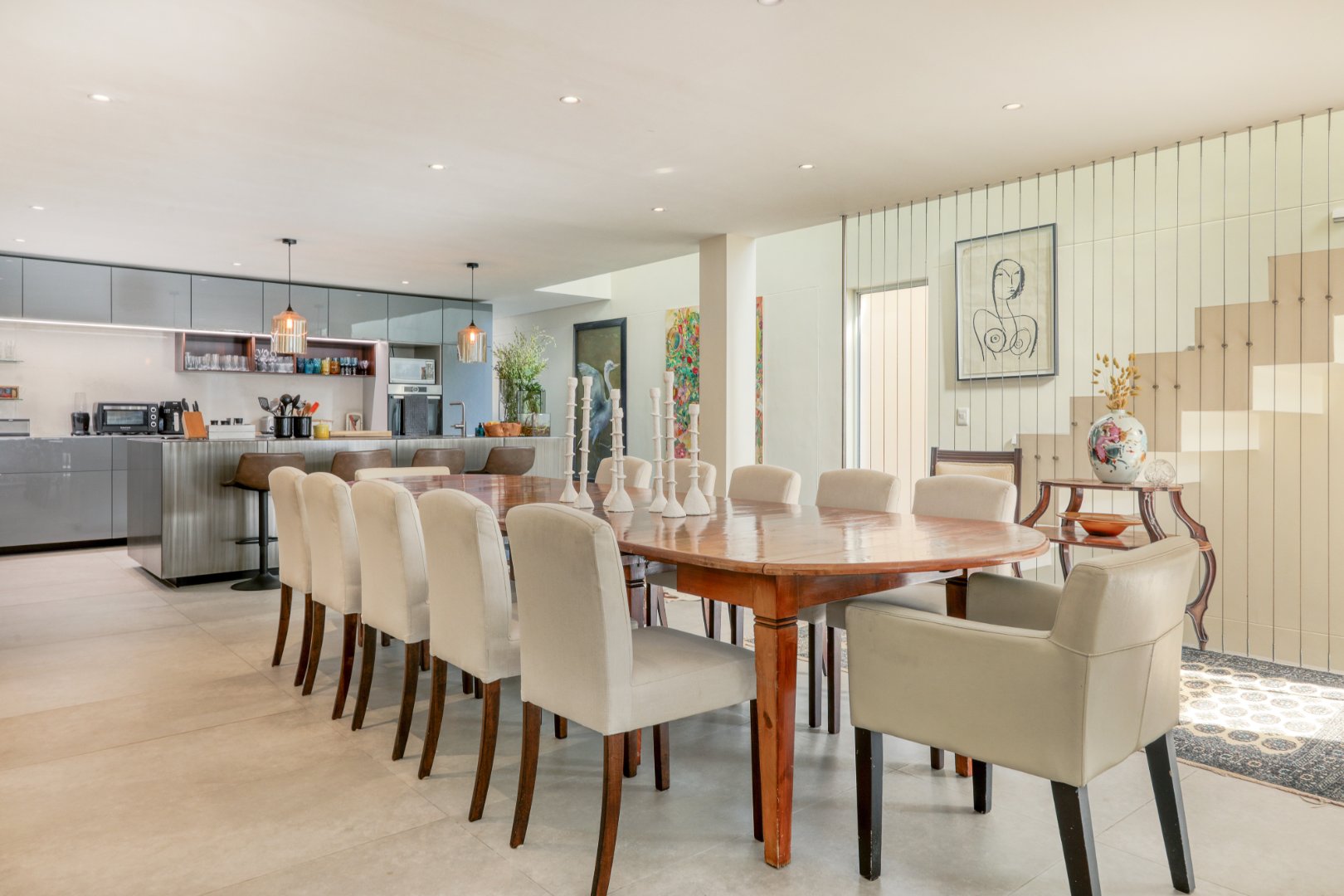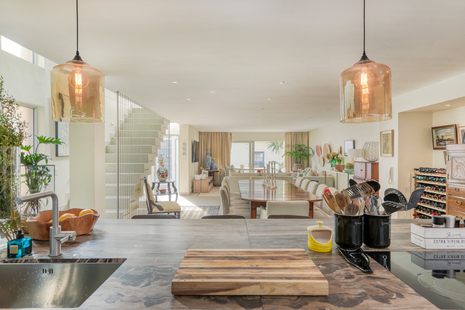 The heart of the home is an expansive open-plan living area with a beautifully designed Italian kitchen, dining space, and lounge that flow effortlessly onto a covered terrace overlooking the pool. The terrace features a 10-seater dining table and gas barbecue for alfresco entertaining.