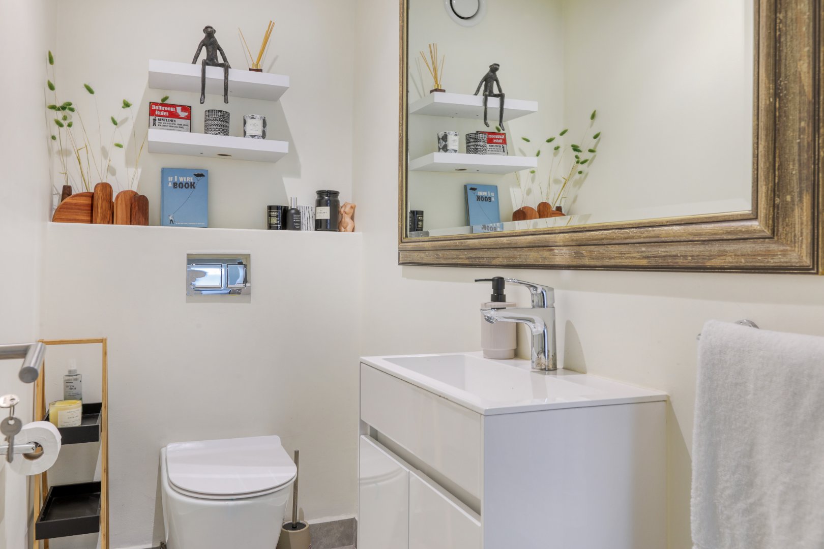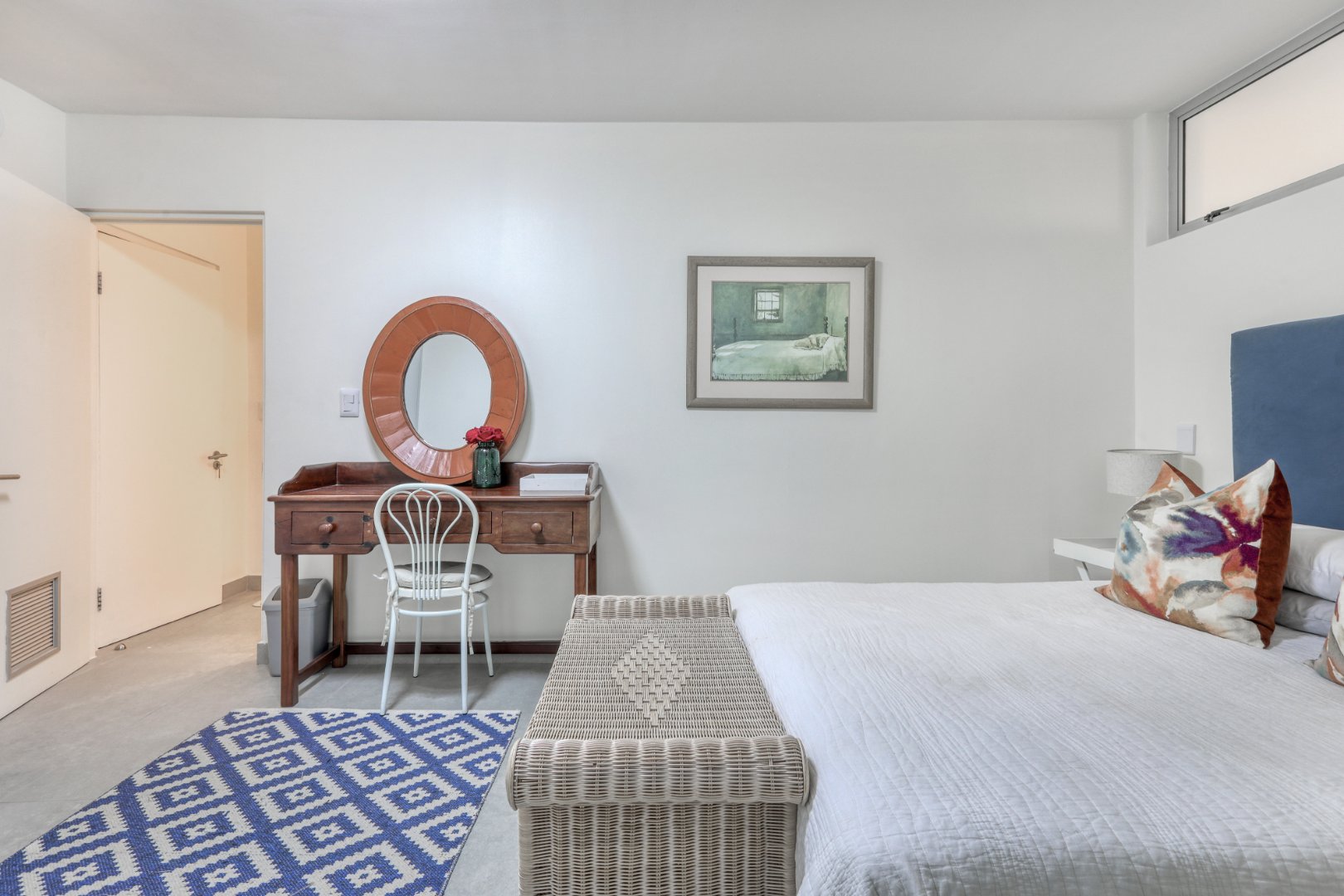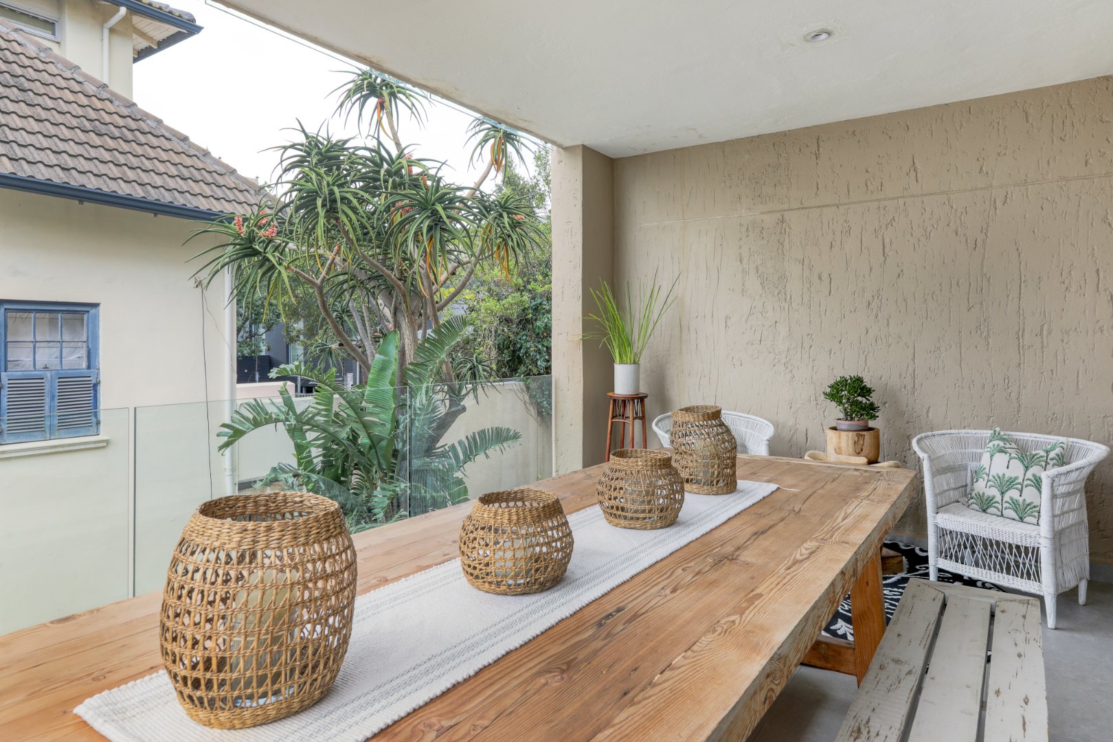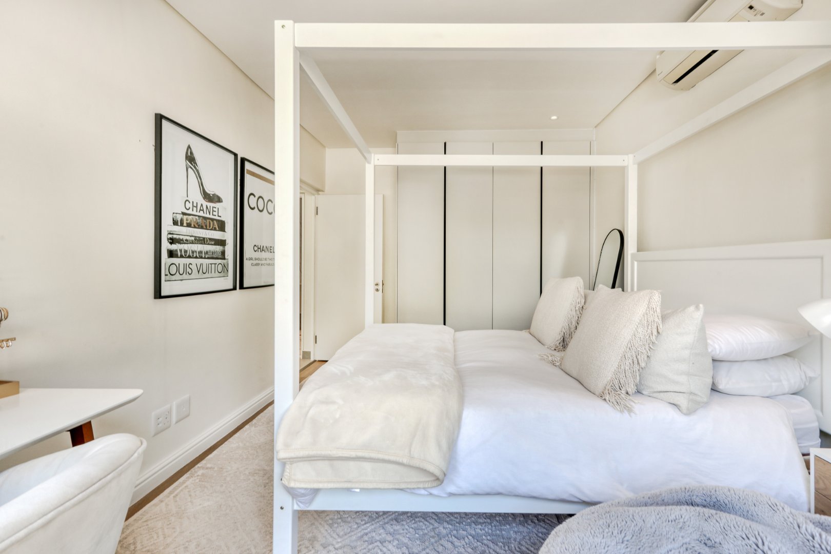 Two additional queen bedrooms—one with a romantic four-poster bed—share a stylish bathroom, and all rooms are air-conditioned and elegantly furnished.
