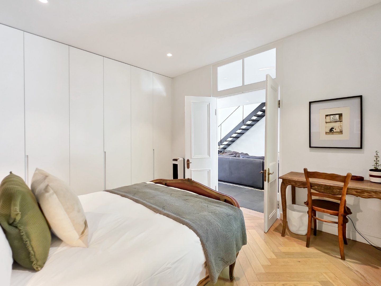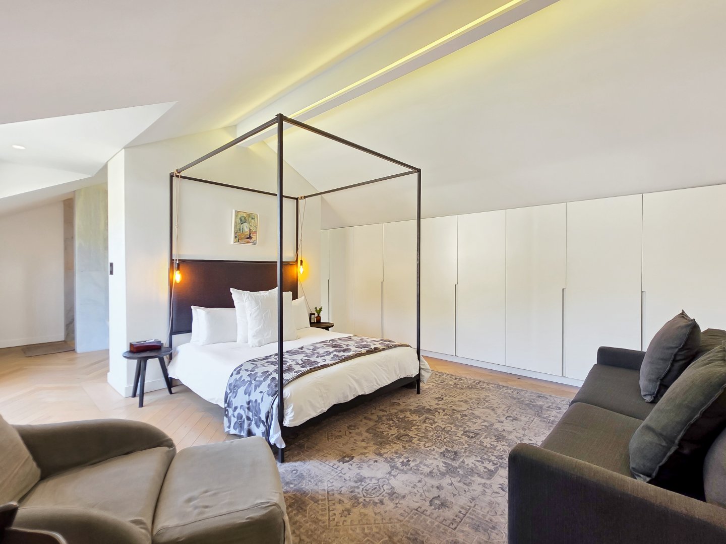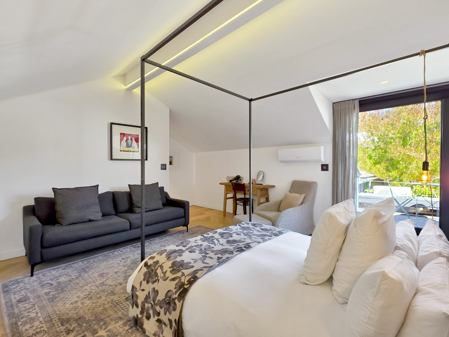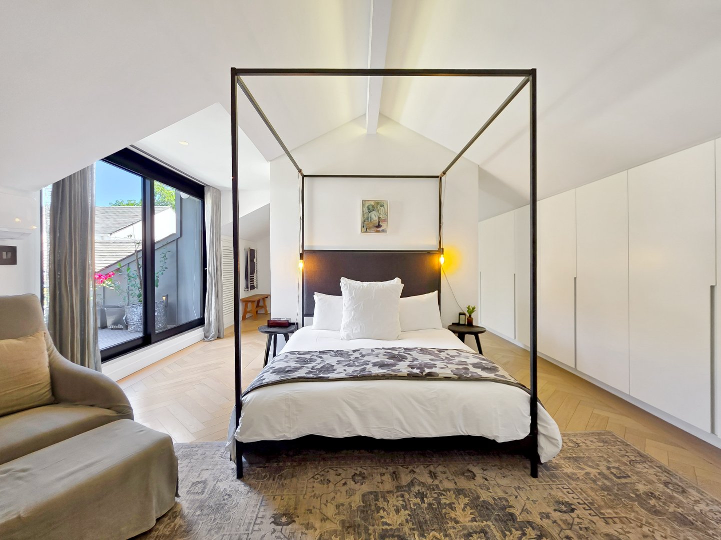 Up a striking black steel staircase is the main loft bedroom suite, positioned amongst the rooftops and opening onto a private dormer balcony. This spacious suite features a luxurious bathroom with a freestanding bath, double vanity, and marble finishes.