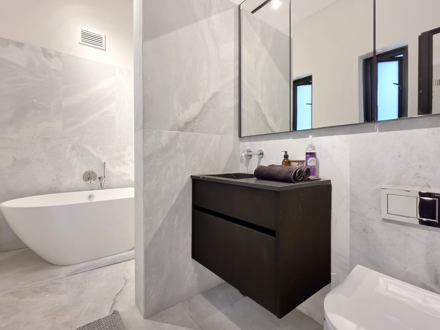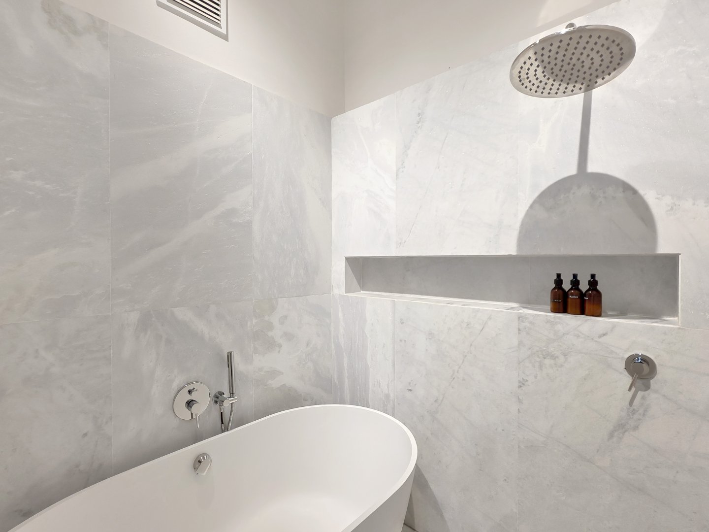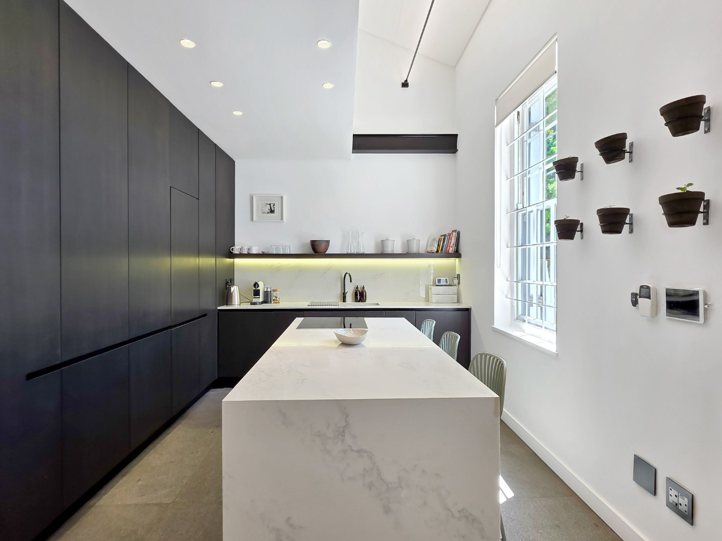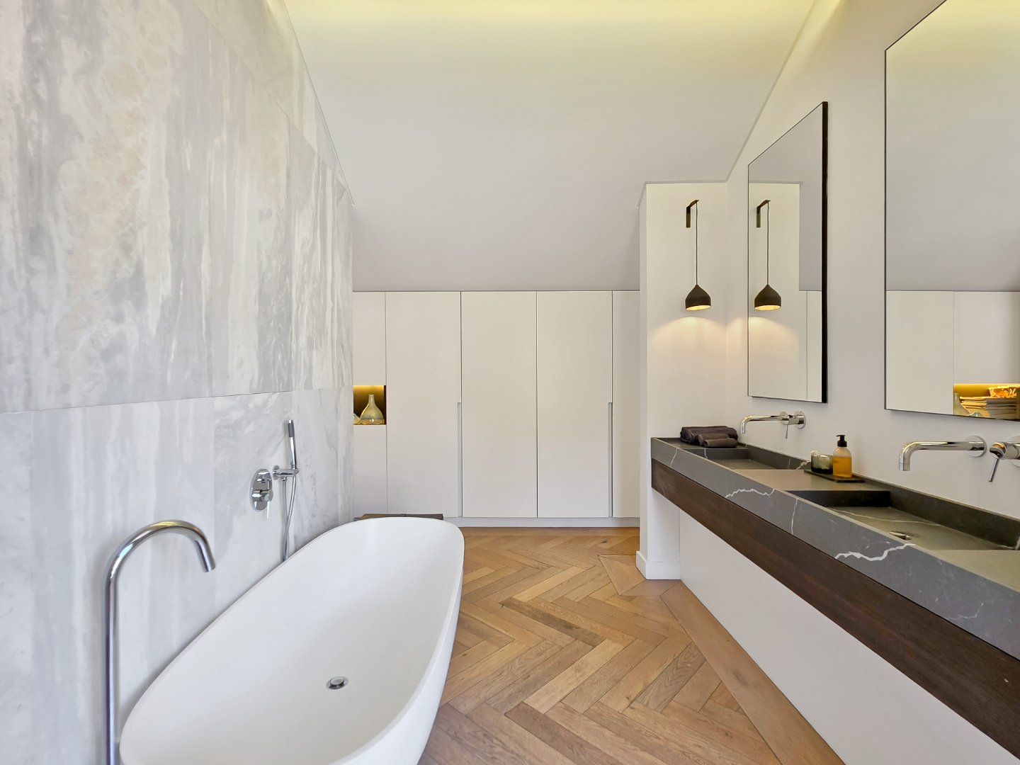 Up a striking black steel staircase is the main loft bedroom suite, positioned amongst the rooftops and opening onto a private dormer balcony. This spacious suite features a luxurious bathroom with a freestanding bath, double vanity, and marble finishes.
