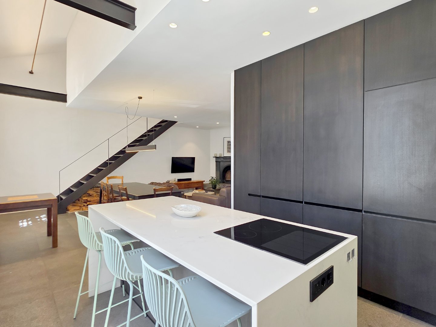 The fully equipped kitchen includes integrated appliances such as a dishwasher, washer-dryer, induction stove, and convection oven/microwave – perfect for easy everyday living.
