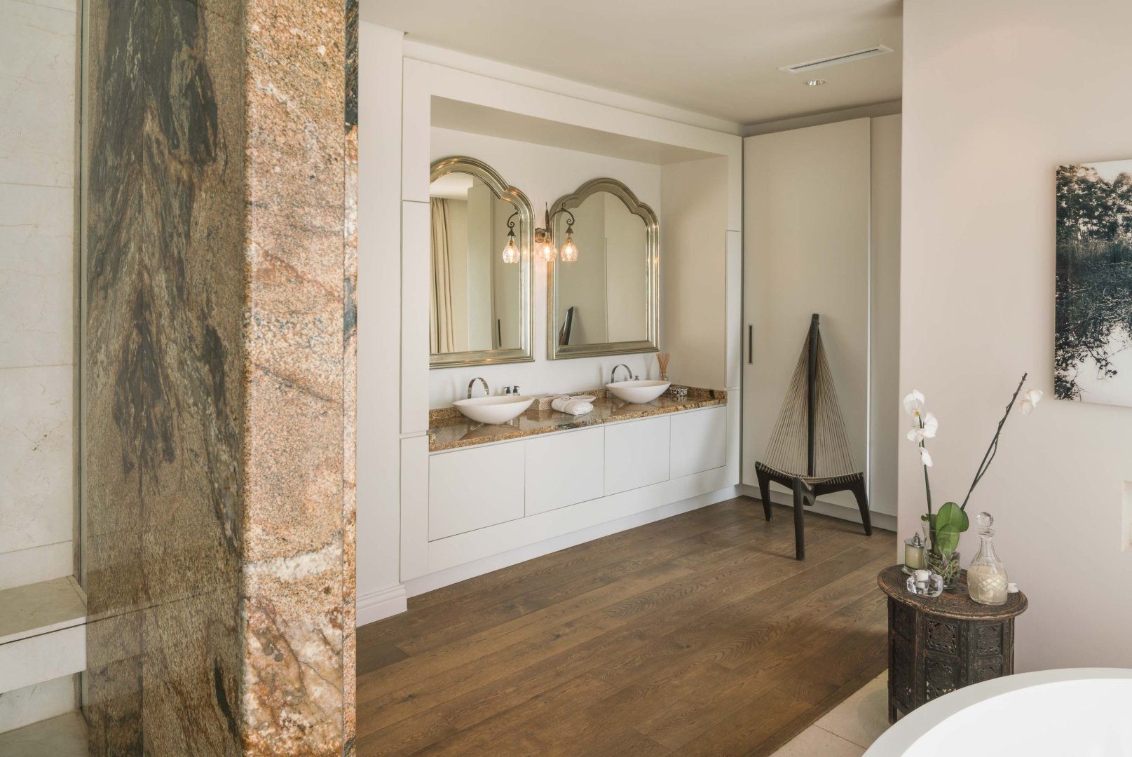 The spacious master suite is located on the next level and comprises of ample living space built-in walk-in cupboards, a large double vanity bathroom equipped with Victorian stand-alone bath and steam shower. The master suite features a study / lounge which opens onto a balcony with beautiful vistas.