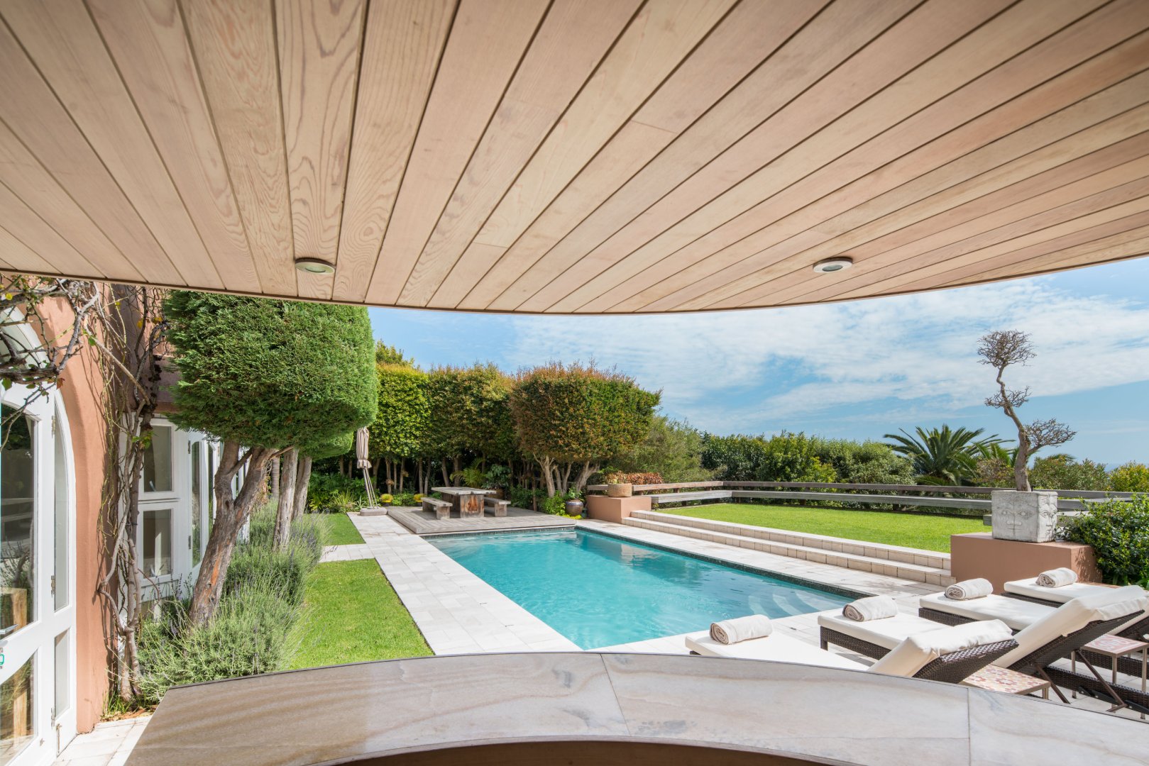 There is a large entrance featuring beautiful Balinese wood finishing’s located on the next level which whisks you into the formal and informal, open plan lounge spaces, there is a separate TV lounge for lazy days. Located off the formal lounge one finds the bespoke wine cellar noted as the best in the country.