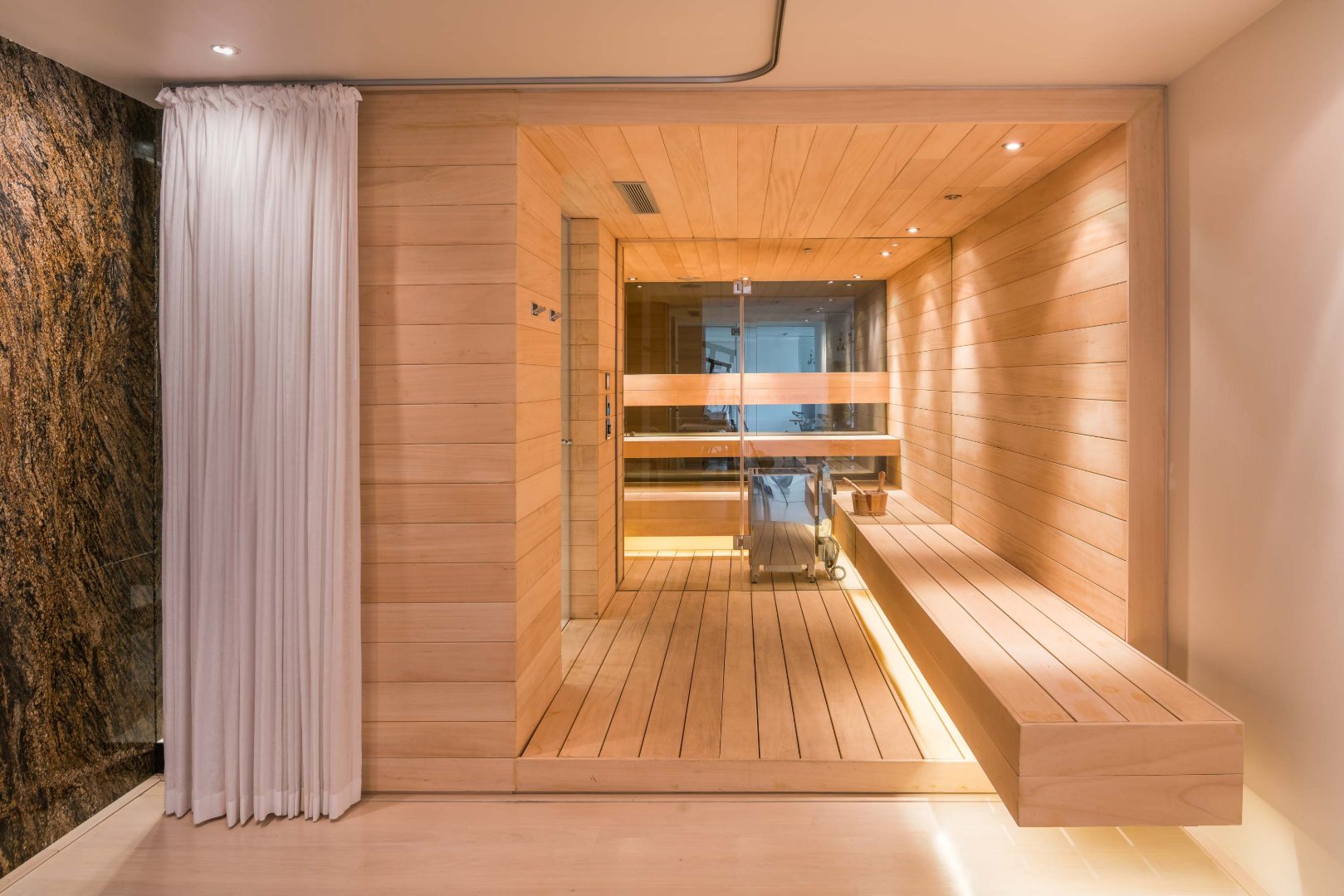 One then takes a short stroll and finds a playroom / poolside storeroom, bedroom six en suite with a shower is located adjacent to the swimming pool and its doors open out to the water. This level also is home to the gym / massage room – fitted with sauna and steam room, and an outside bar entertainment space, and around the next corner is bedroom seven, fitted with a shower.