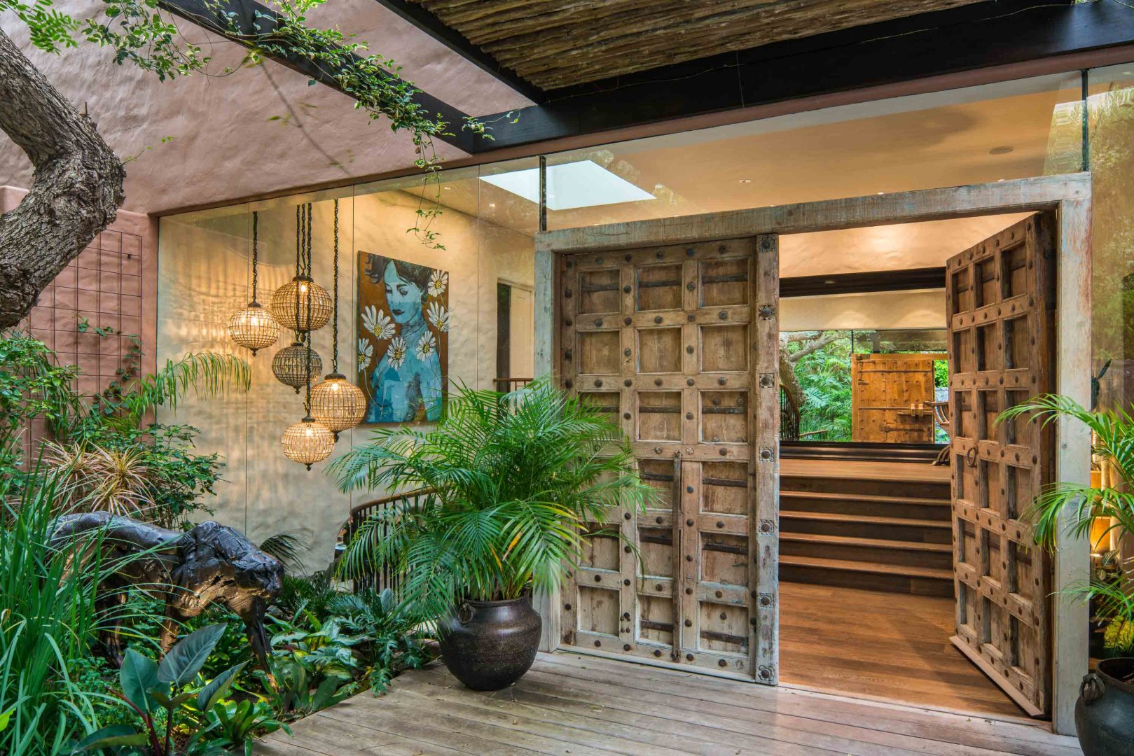 This unique property designed by Marvin Farr architects, takes you on a visual journey from the minute you pass the guard house, as the gates open you are transported into a Balinese style jungle, complete with lush greenery and a water feature.