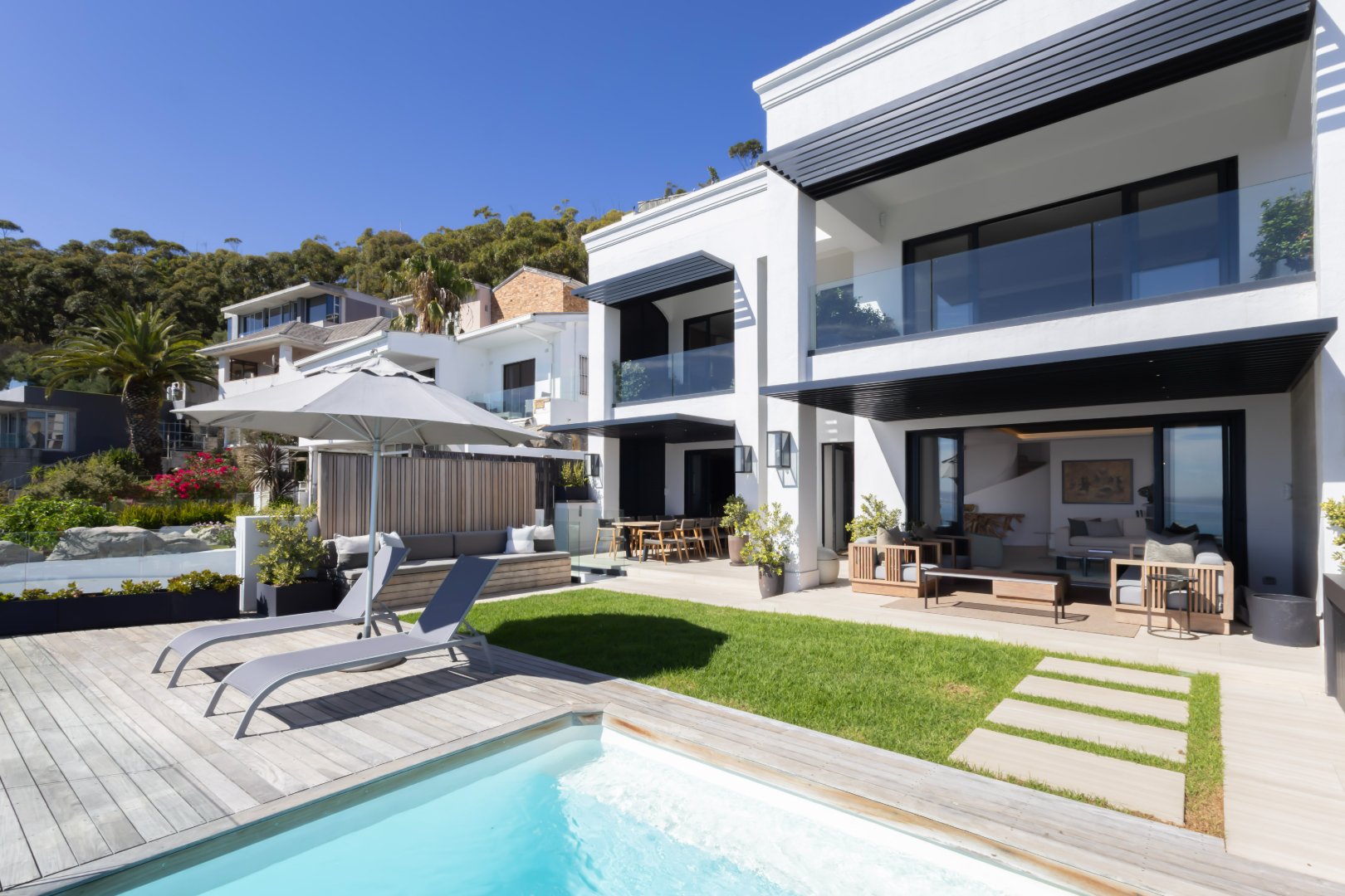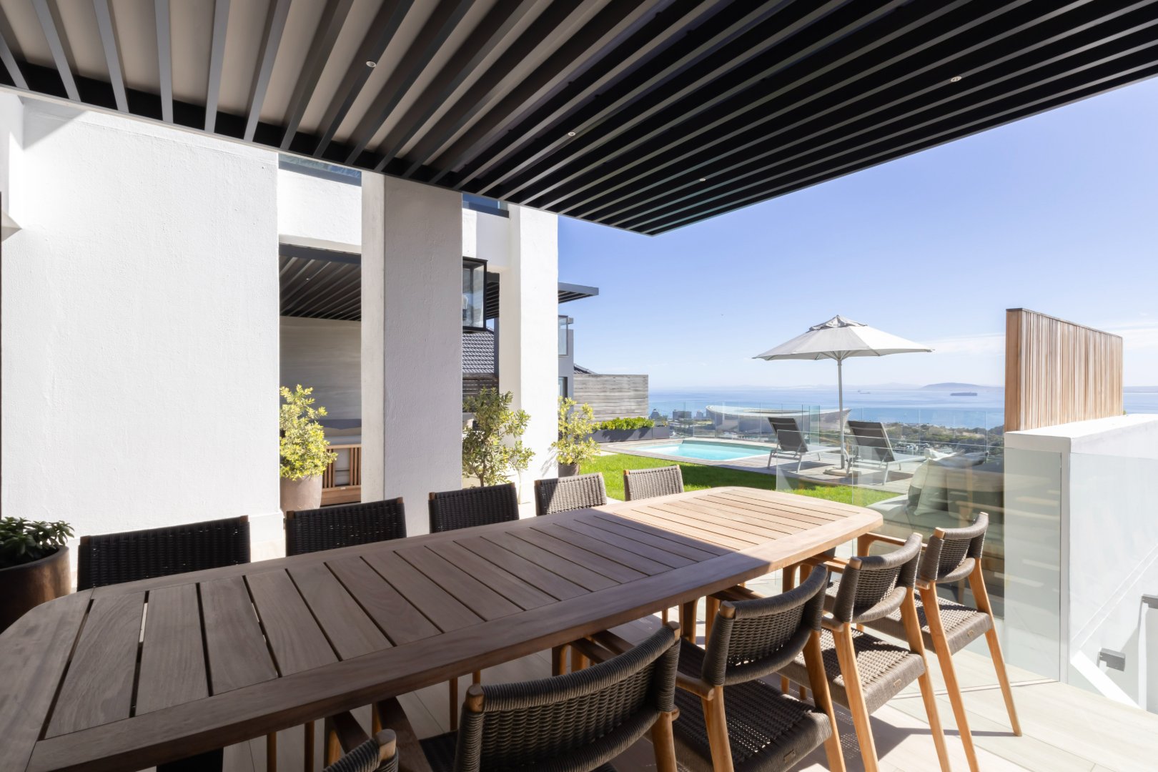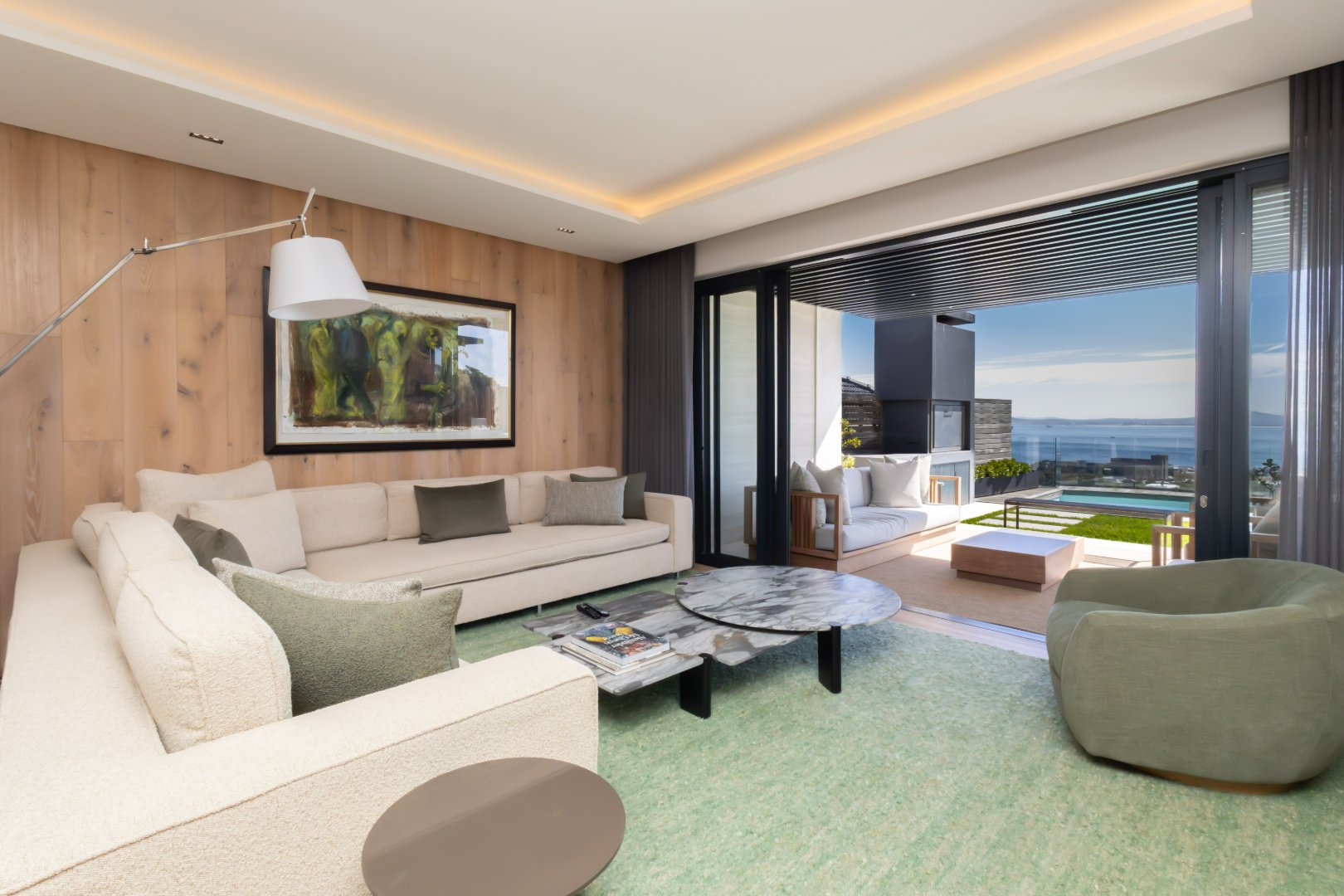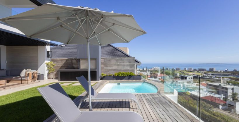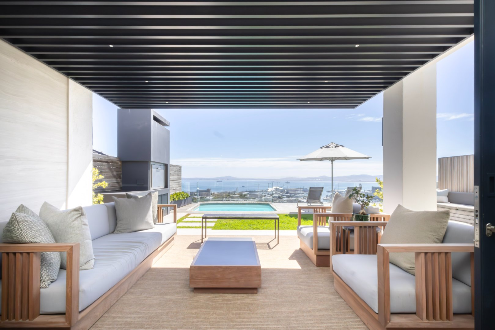 Floor-to-ceiling sliding doors open onto a covered terrace lounge overlooking the pool deck and manicured garden, creating a private oasis with breathtaking ocean and city views. The outdoor area includes a swimming pool, sun deck, and multiple seating areas designed to take full advantage of Cape Town’s outdoor lifestyle and spectacular sunsets.