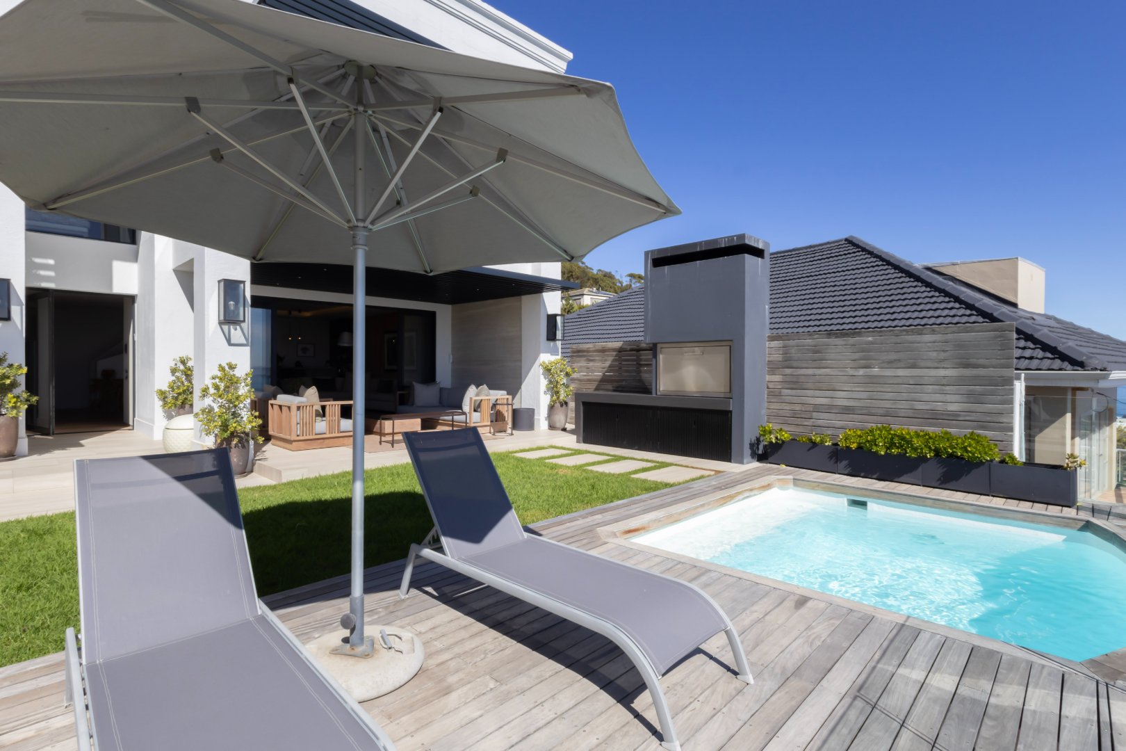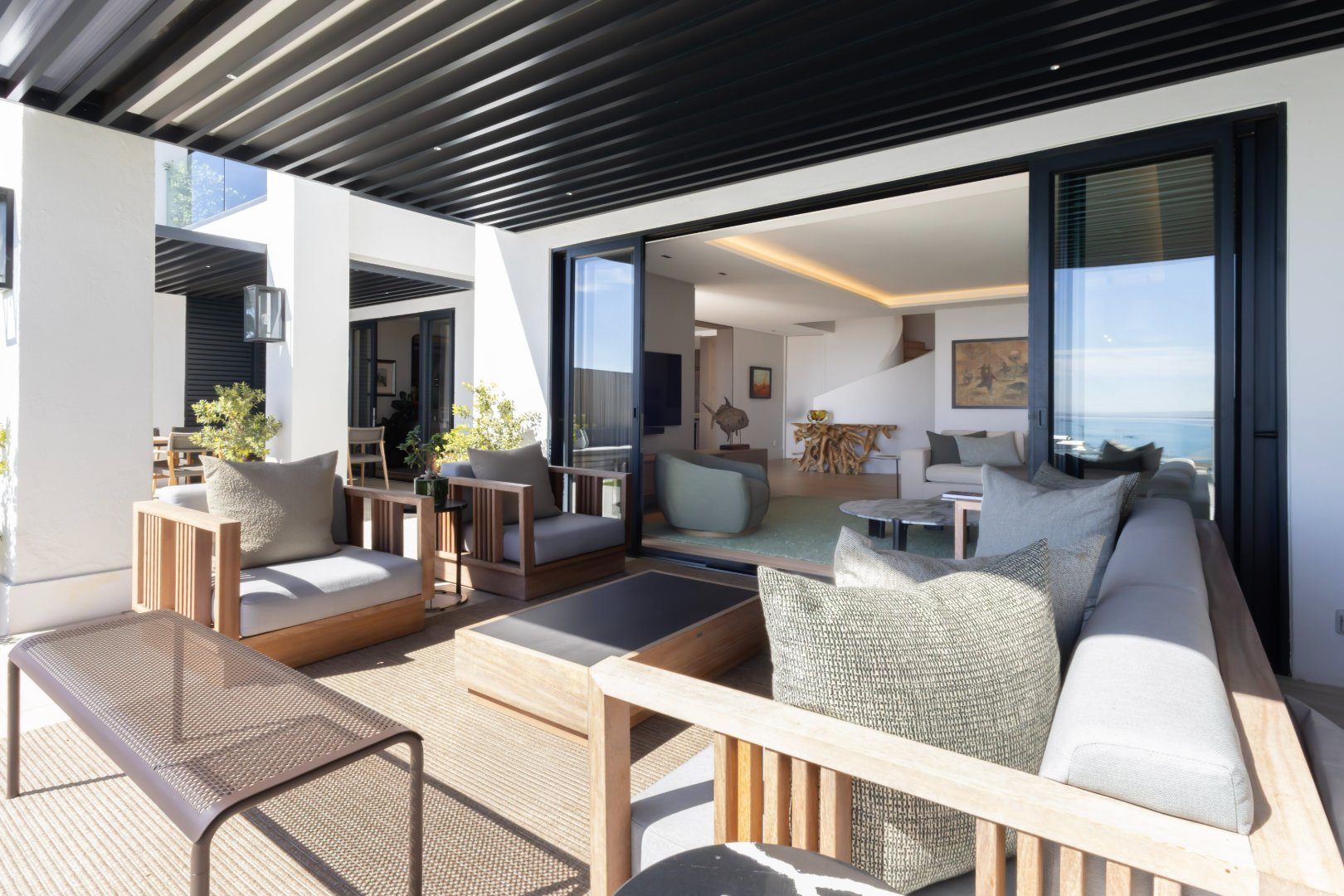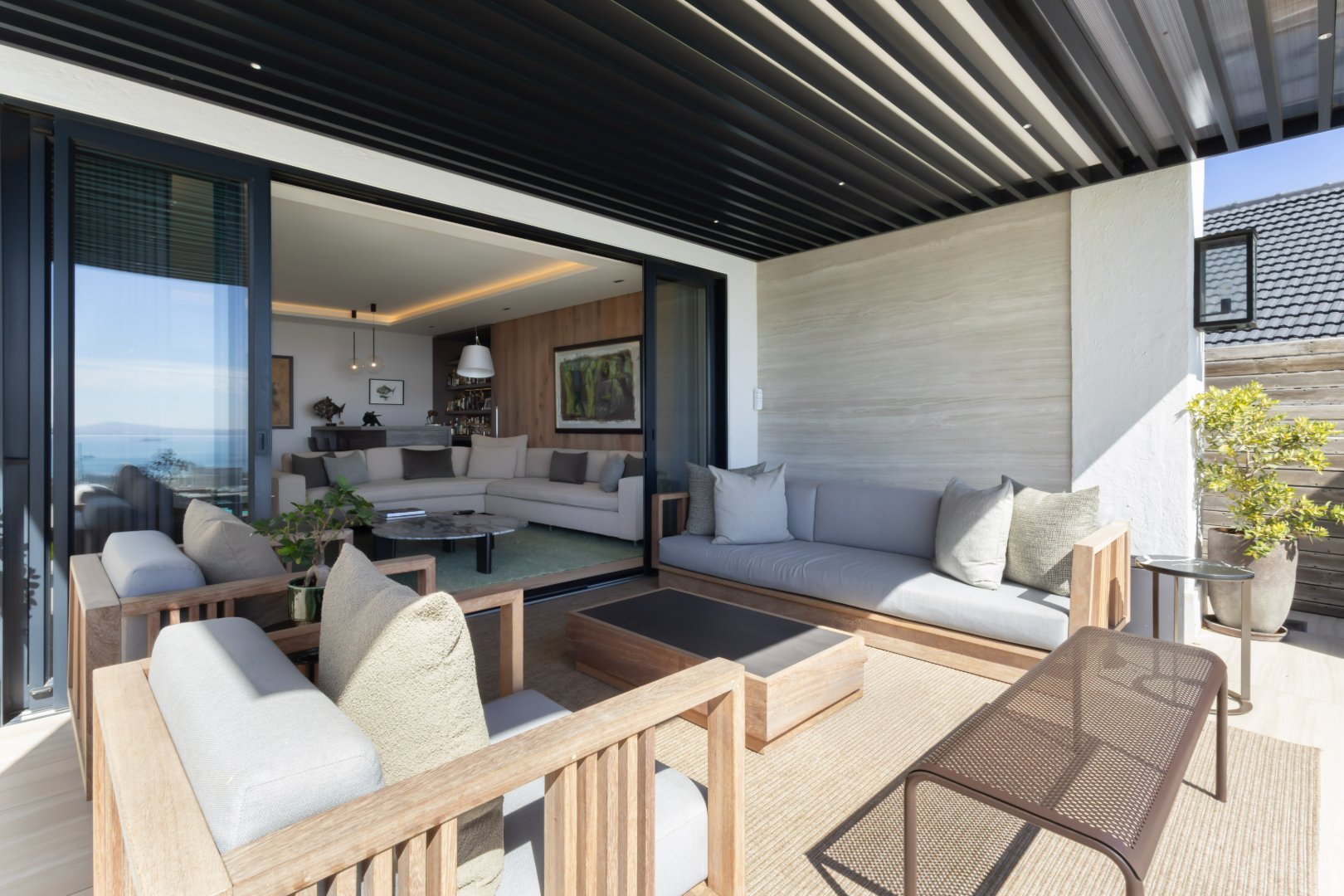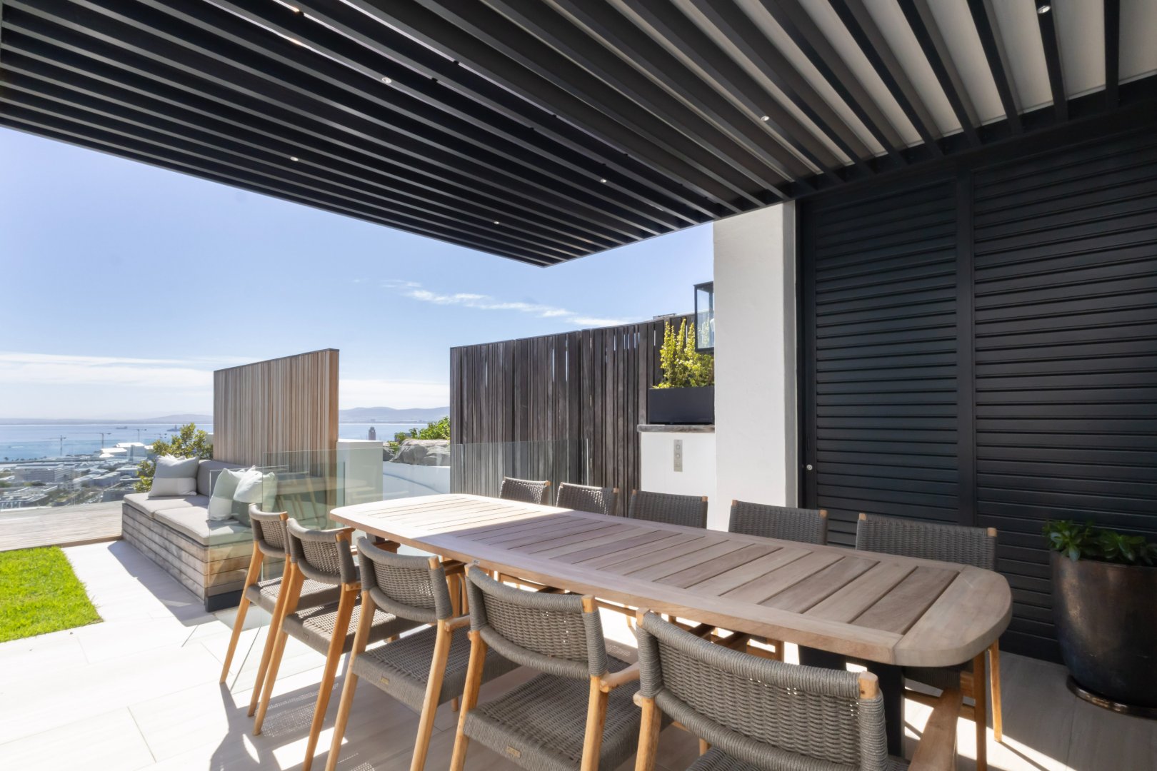 Floor-to-ceiling sliding doors open onto a covered terrace lounge overlooking the pool deck and manicured garden, creating a private oasis with breathtaking ocean and city views. The outdoor area includes a swimming pool, sun deck, and multiple seating areas designed to take full advantage of Cape Town’s outdoor lifestyle and spectacular sunsets.