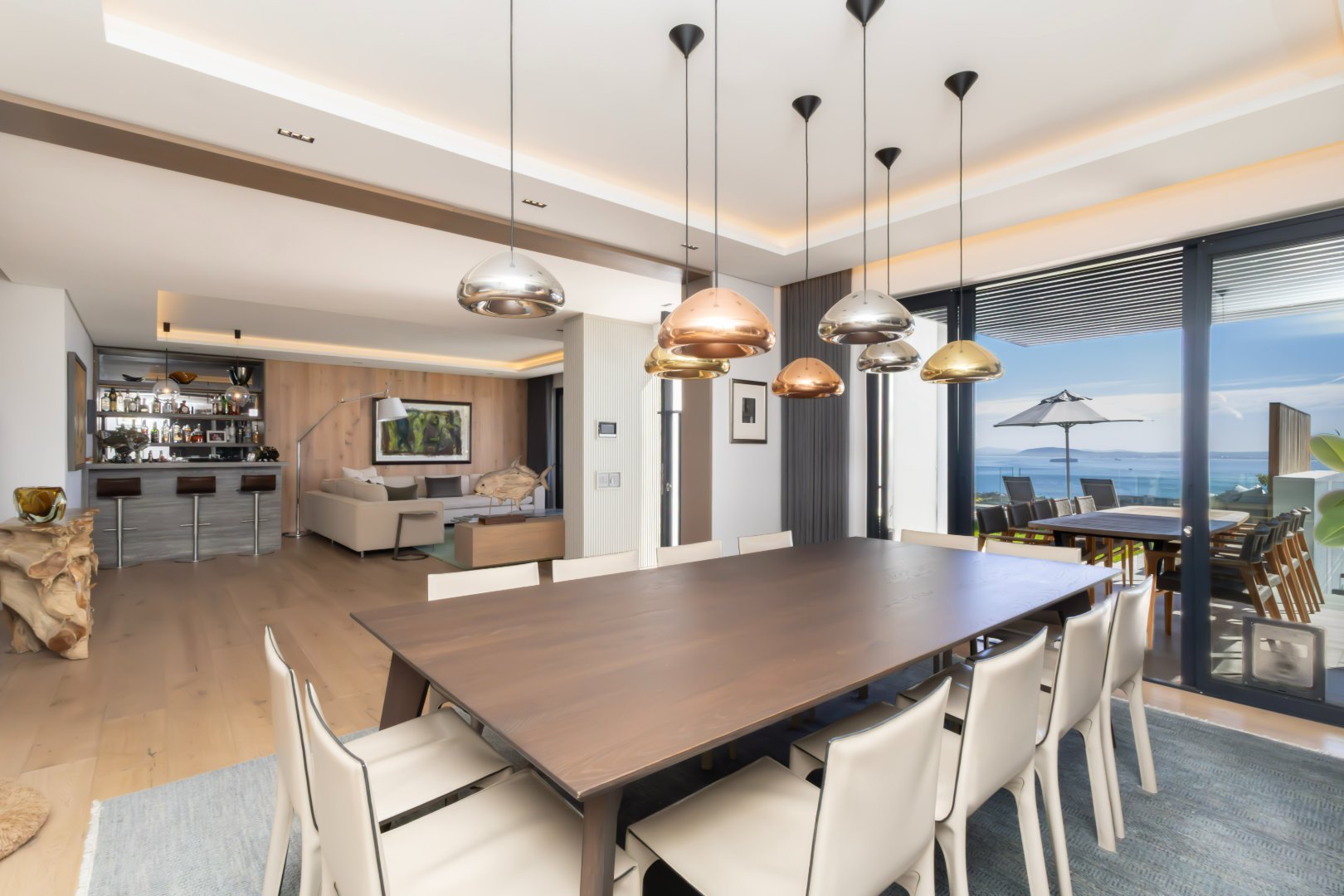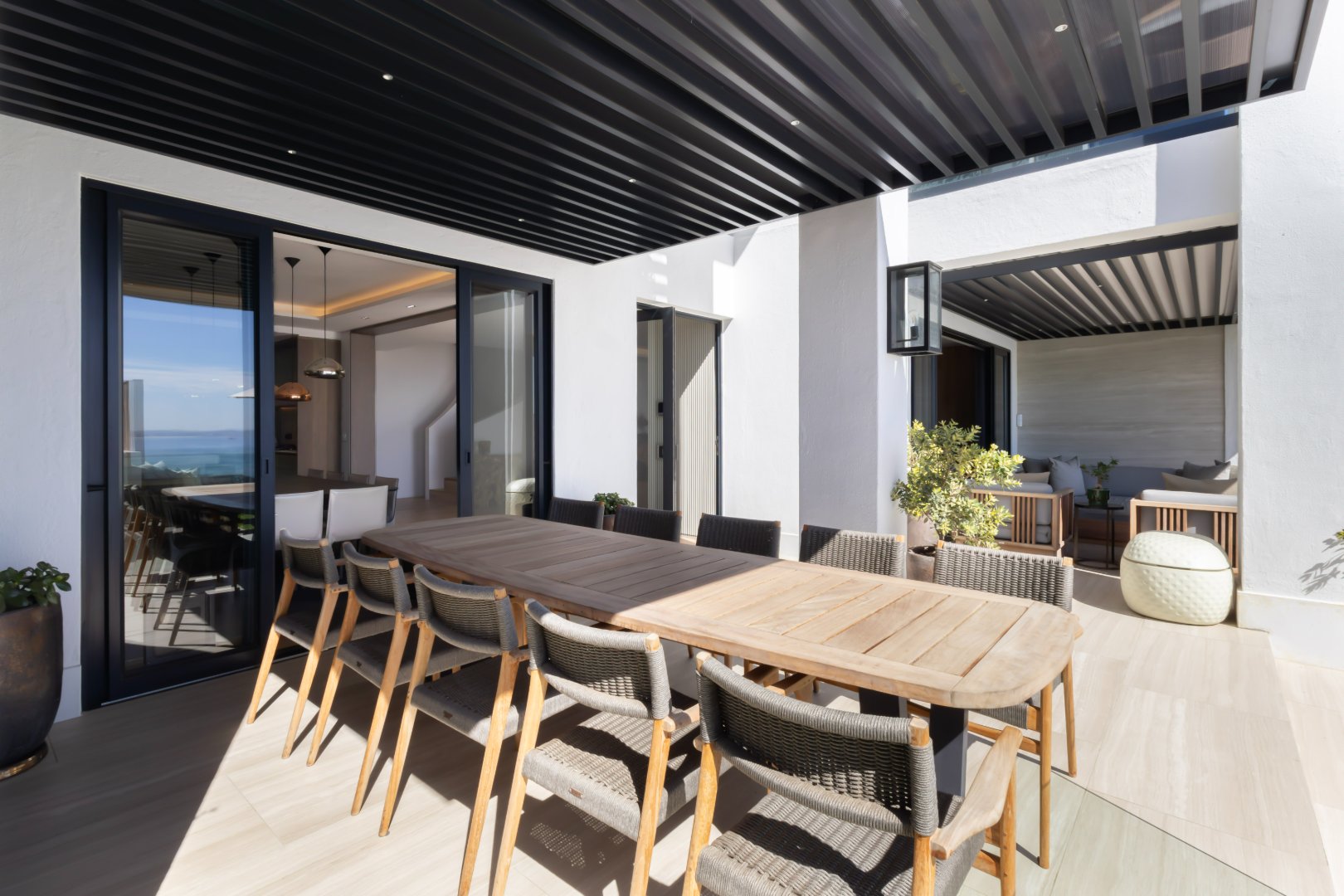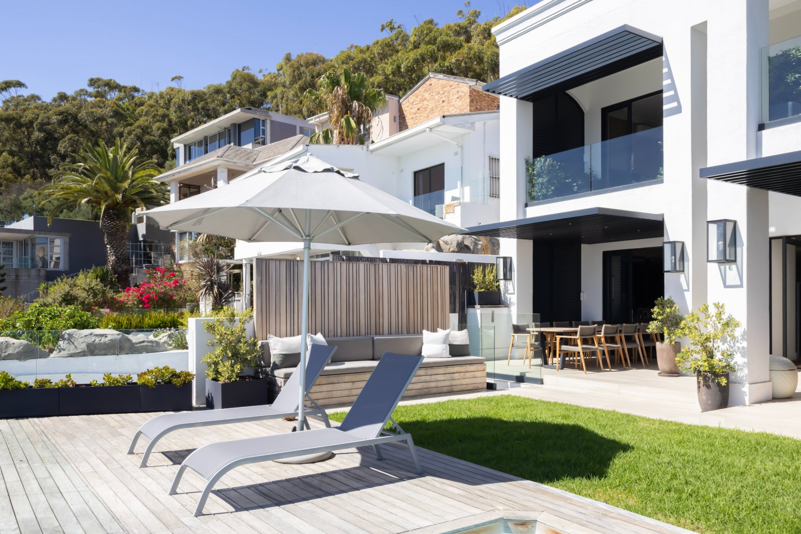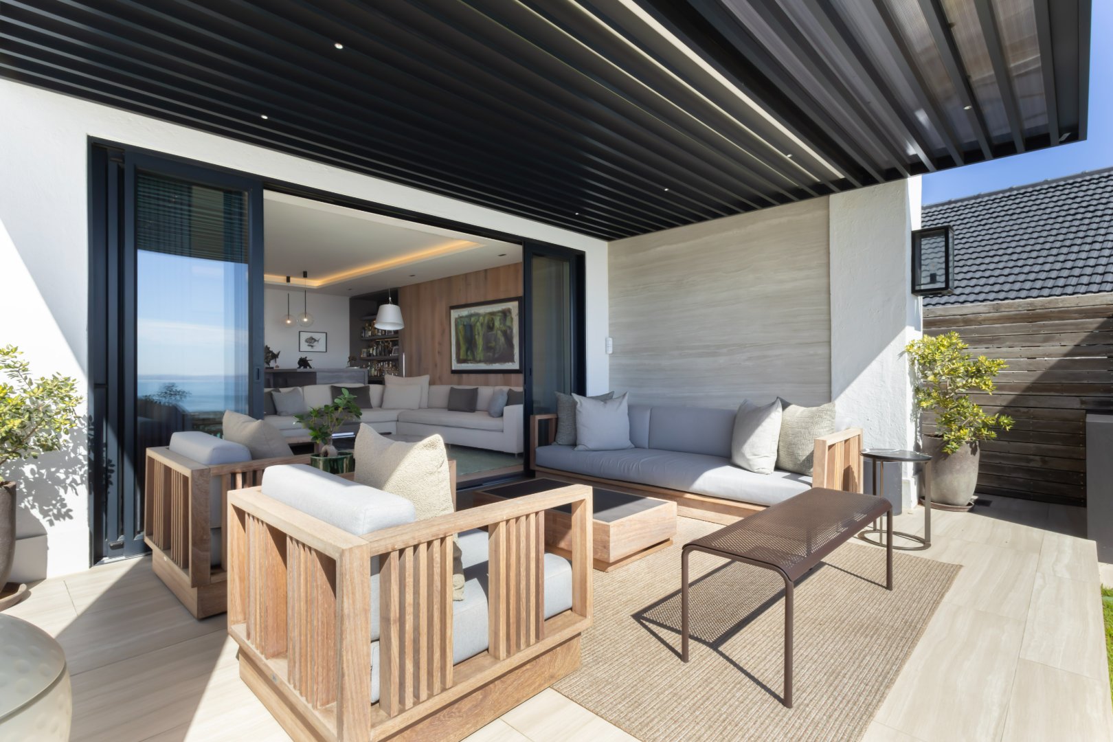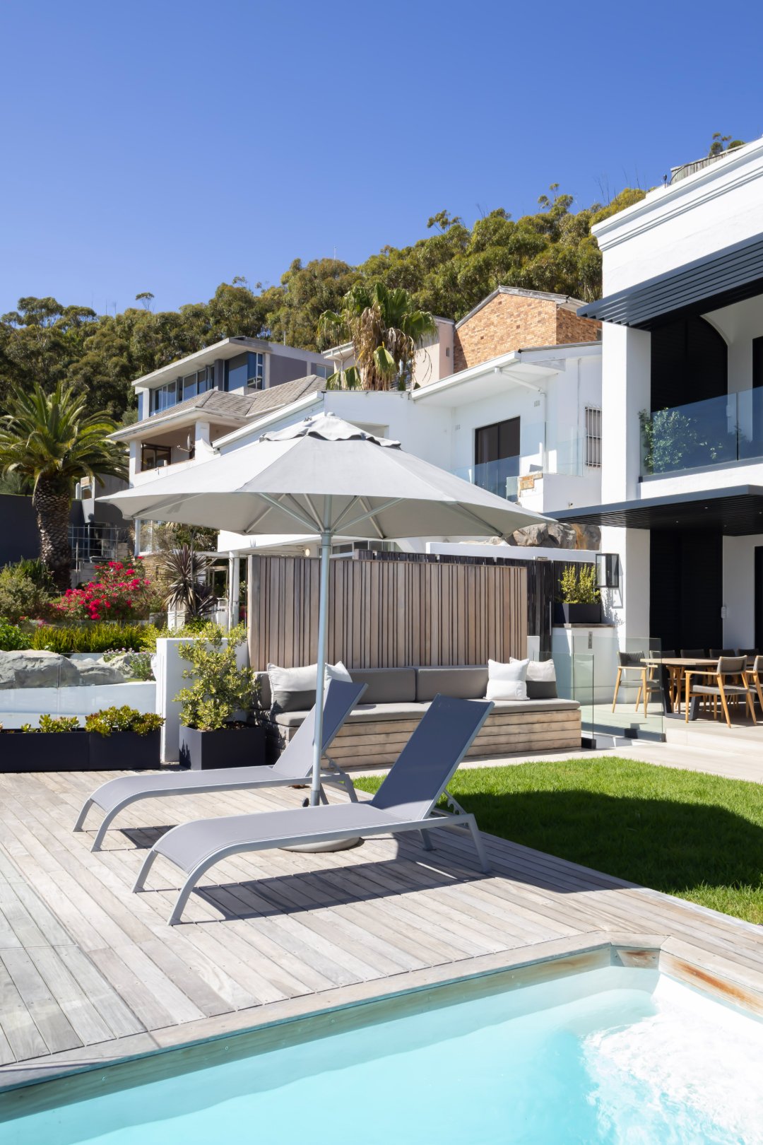 Floor-to-ceiling sliding doors open onto a covered terrace lounge overlooking the pool deck and manicured garden, creating a private oasis with breathtaking ocean and city views. The outdoor area includes a swimming pool, sun deck, and multiple seating areas designed to take full advantage of Cape Town’s outdoor lifestyle and spectacular sunsets.