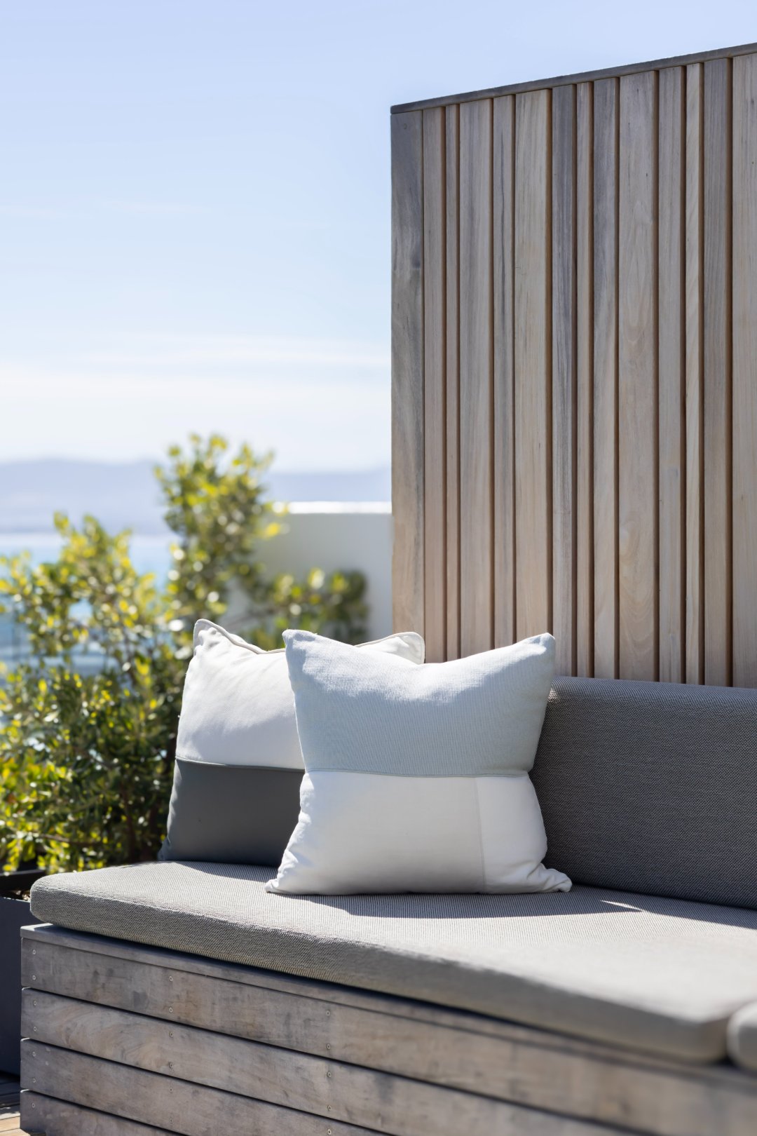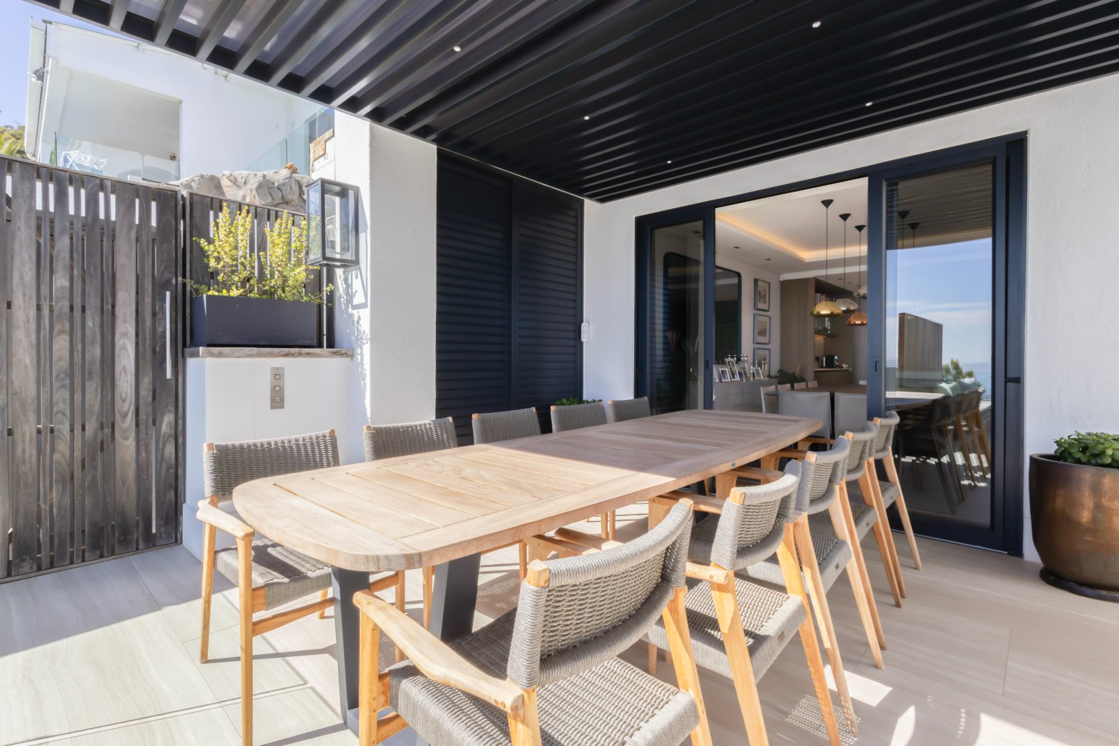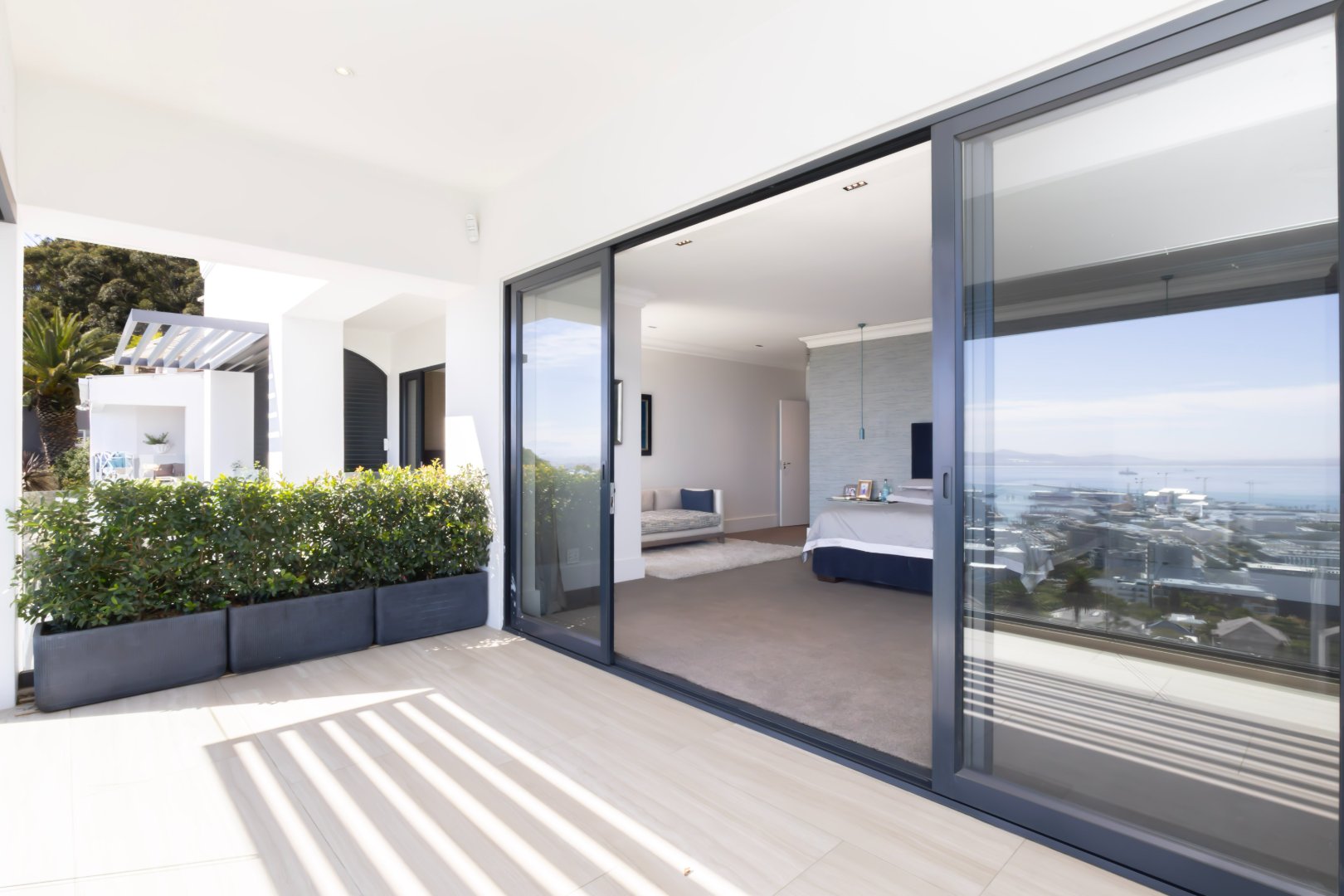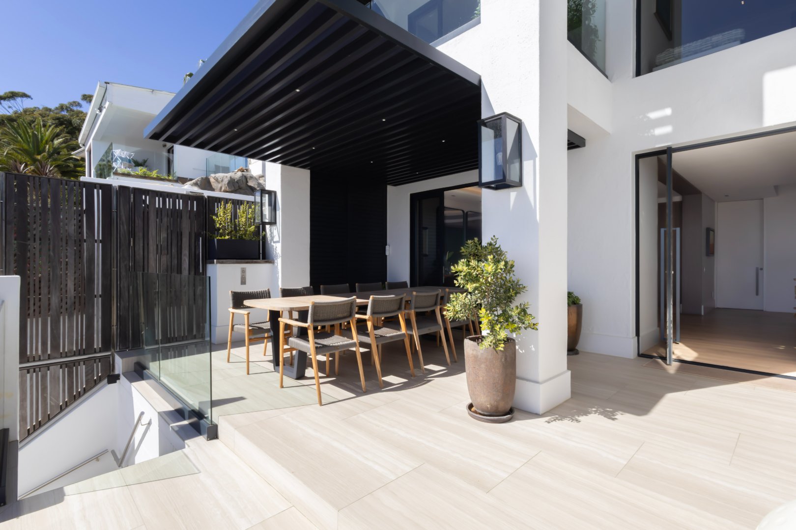 Floor-to-ceiling sliding doors open onto a covered terrace lounge overlooking the pool deck and manicured garden, creating a private oasis with breathtaking ocean and city views. The outdoor area includes a swimming pool, sun deck, and multiple seating areas designed to take full advantage of Cape Town’s outdoor lifestyle and spectacular sunsets.