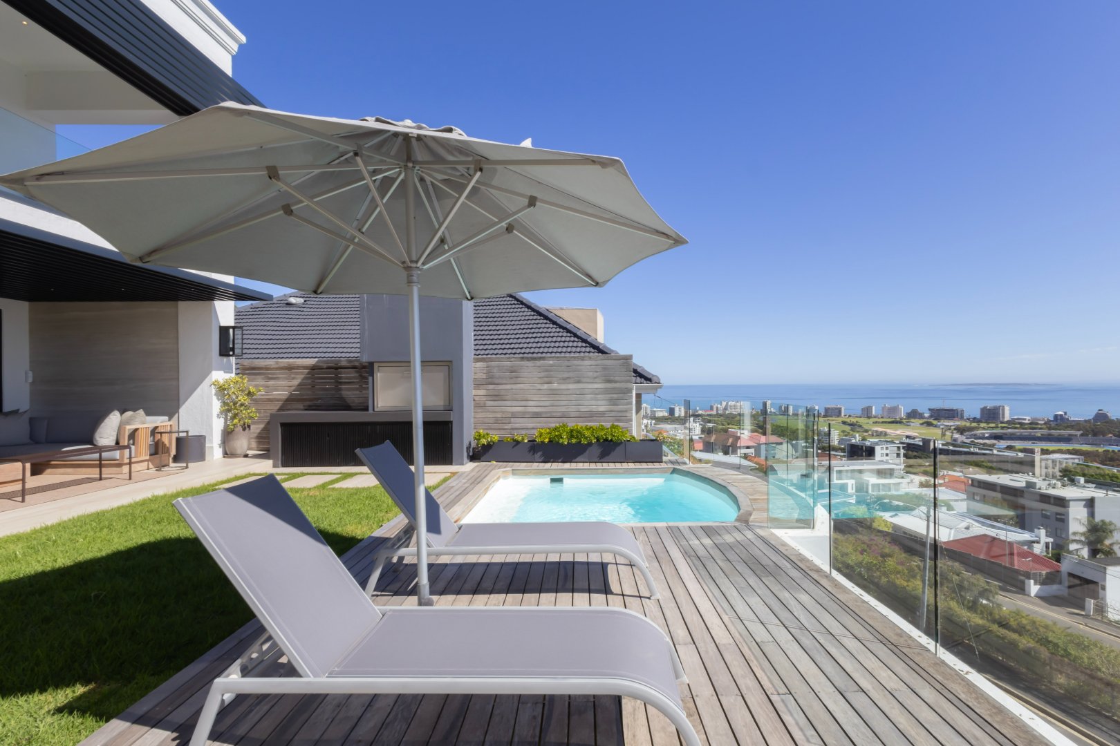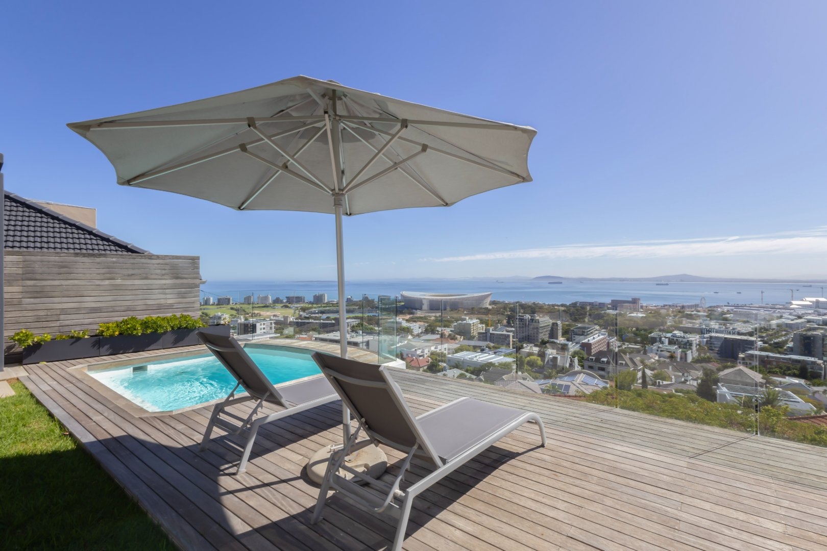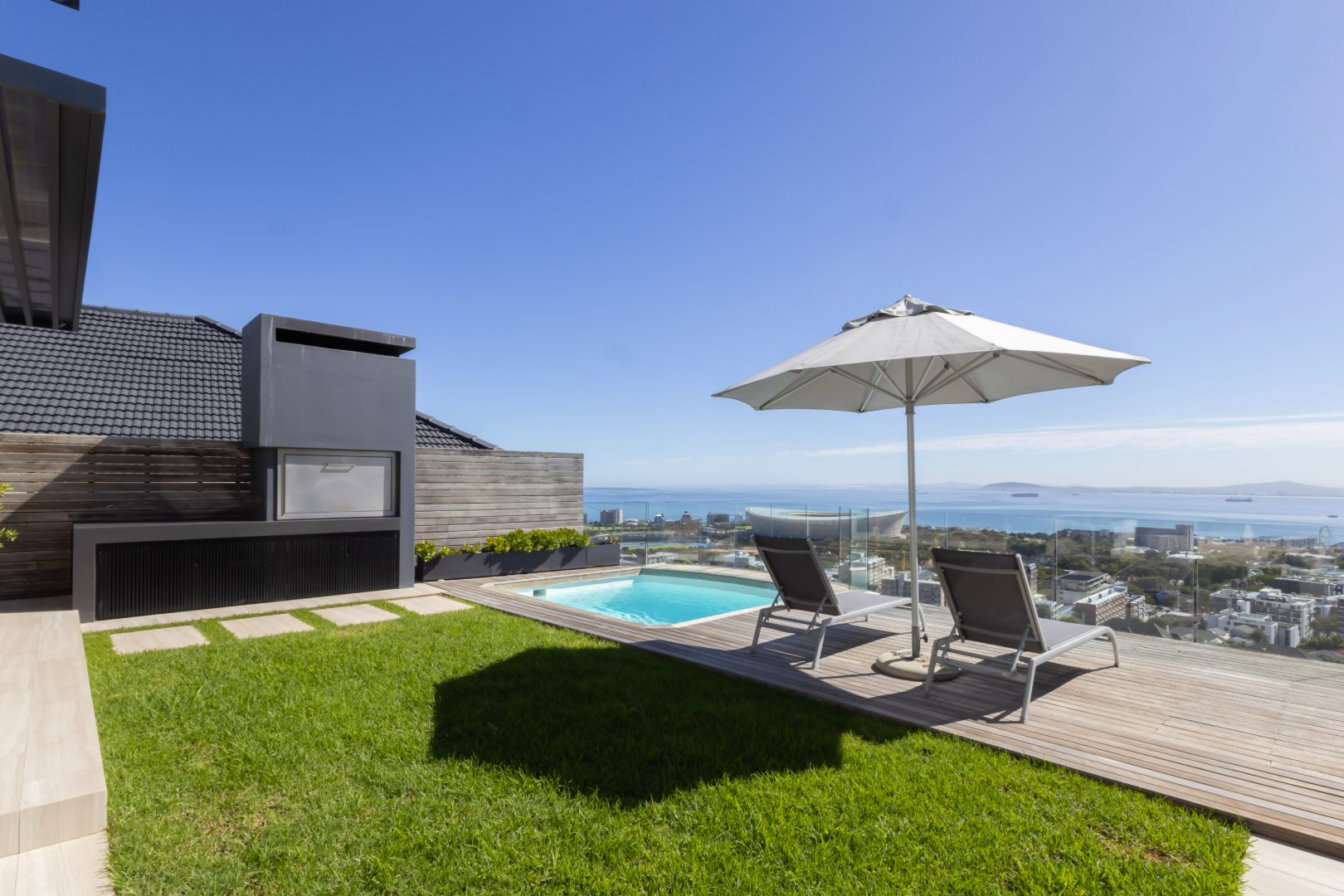 Set in an elevated position with sweeping views across the Atlantic Ocean and the iconic Green Point Stadium, this exceptional modern residence offers sophisticated living, effortless indoor–outdoor flow, and luxurious comfort throughout.