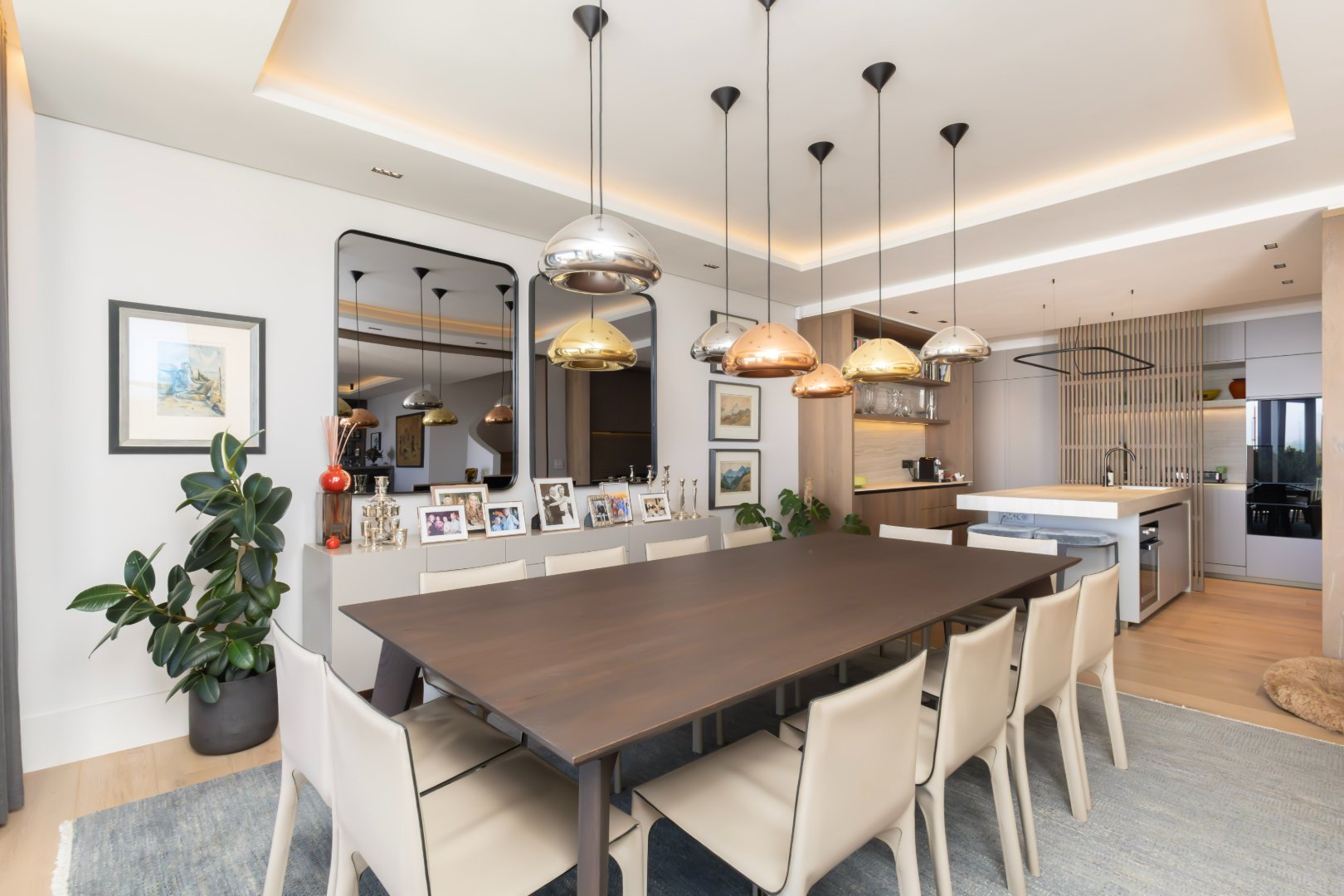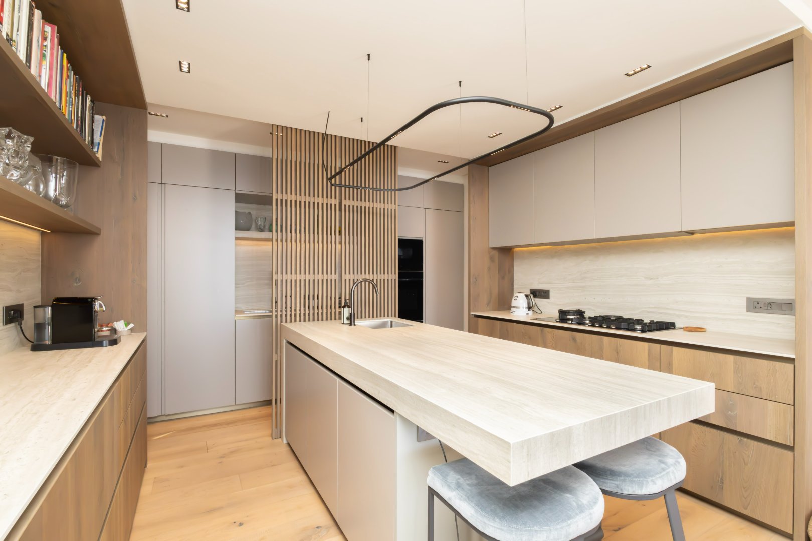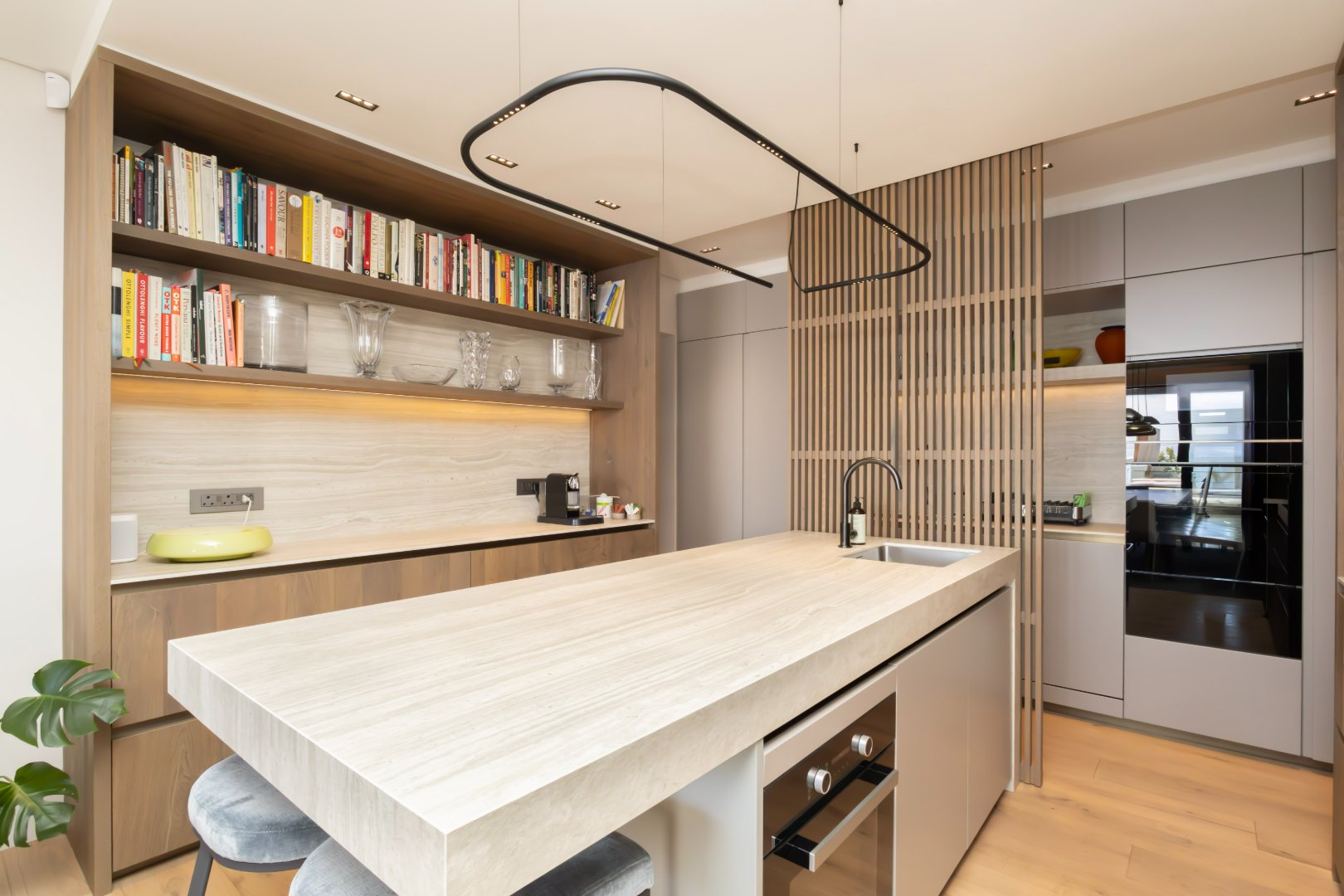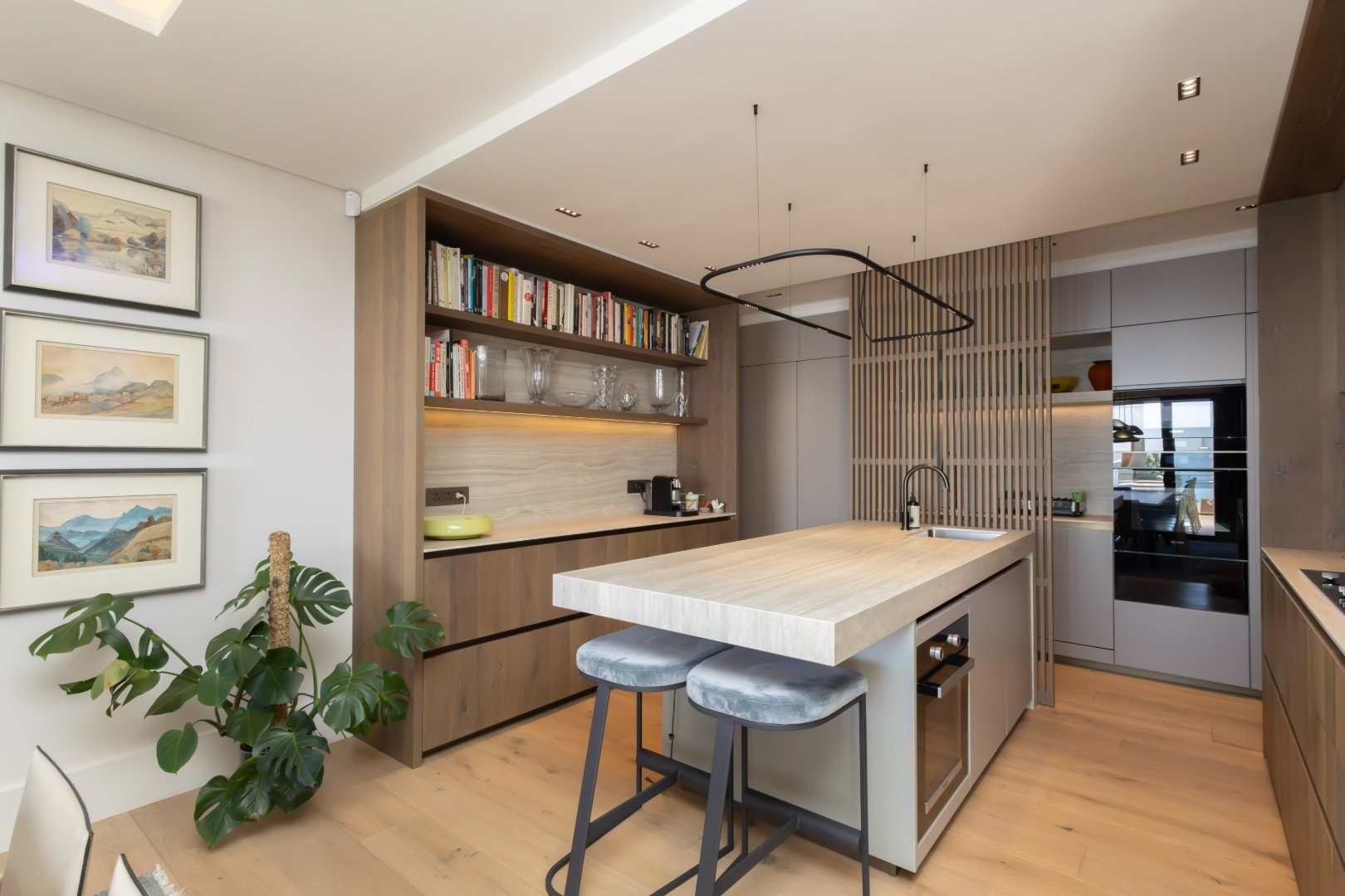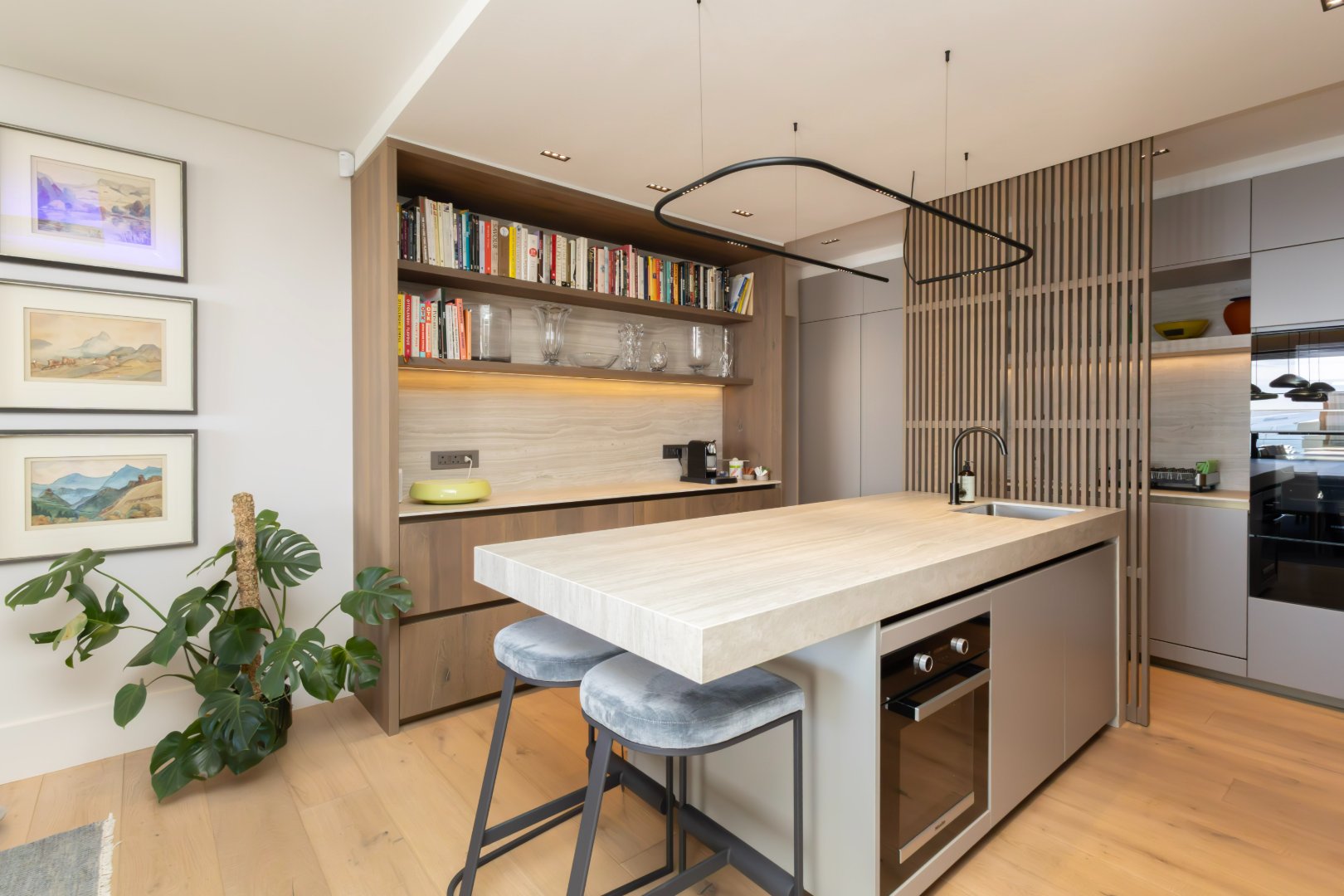 The designer kitchen is beautifully appointed with sleek cabinetry, a large central island, integrated appliances, and elegant shelving, perfectly suited for modern living and entertaining.