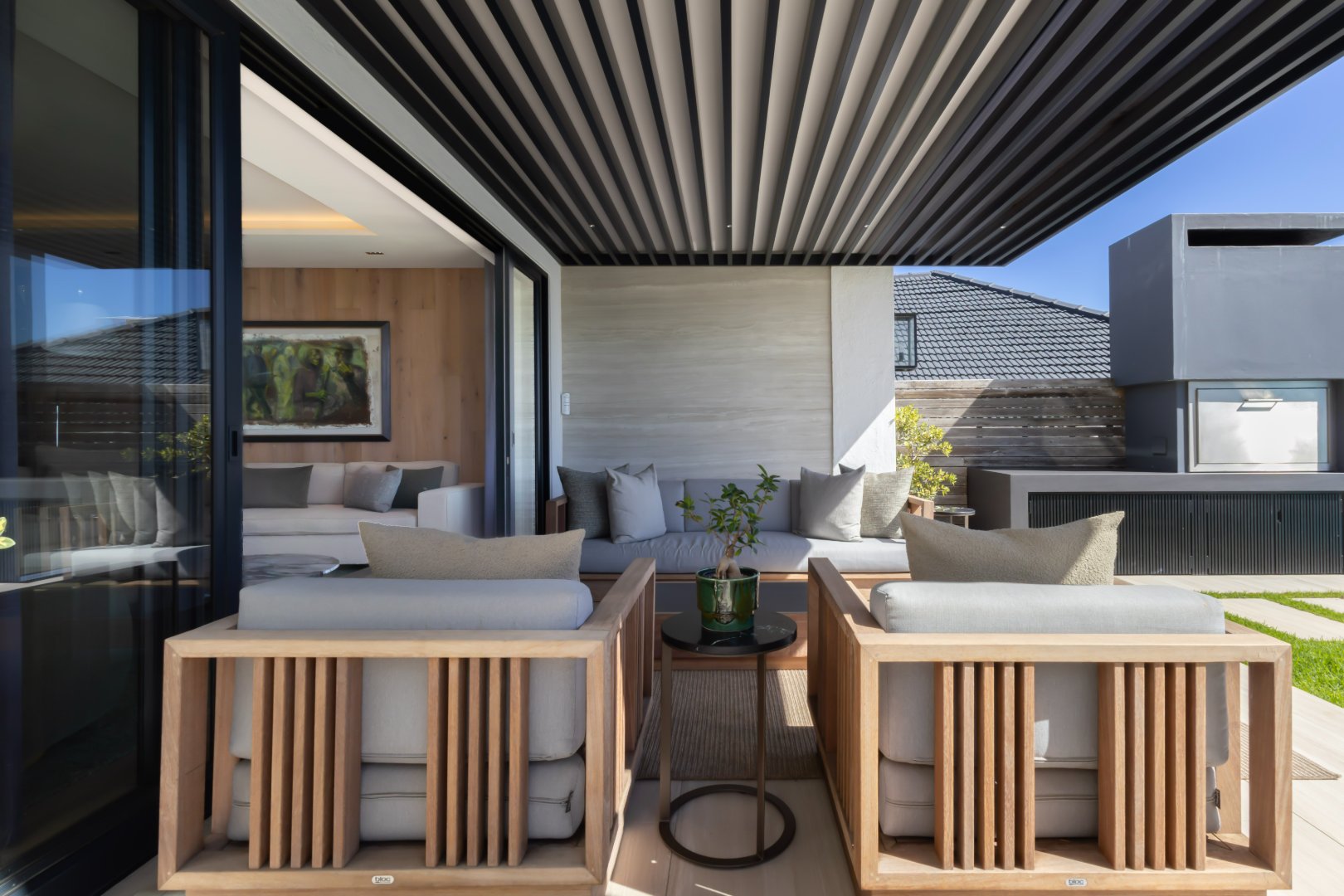 Designed with clean architectural lines and high-end finishes, the home features three spacious en-suite bedrooms and an additional guest cloakroom. Light-filled open-plan living and dining areas create a seamless connection to the outdoor entertainment spaces, making it ideal for both relaxed family living and hosting.