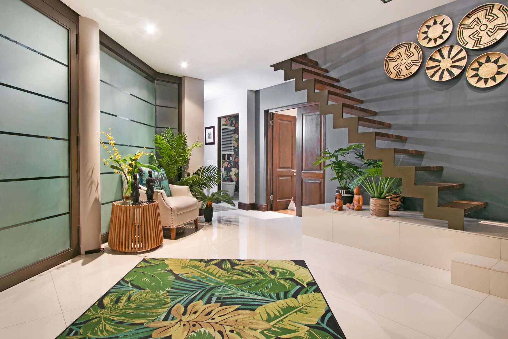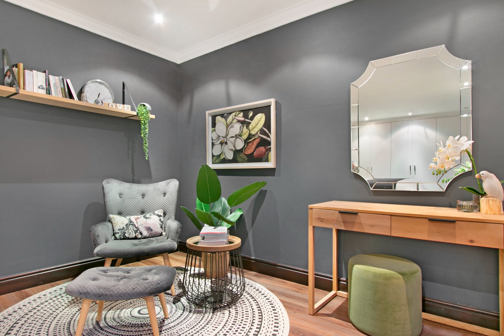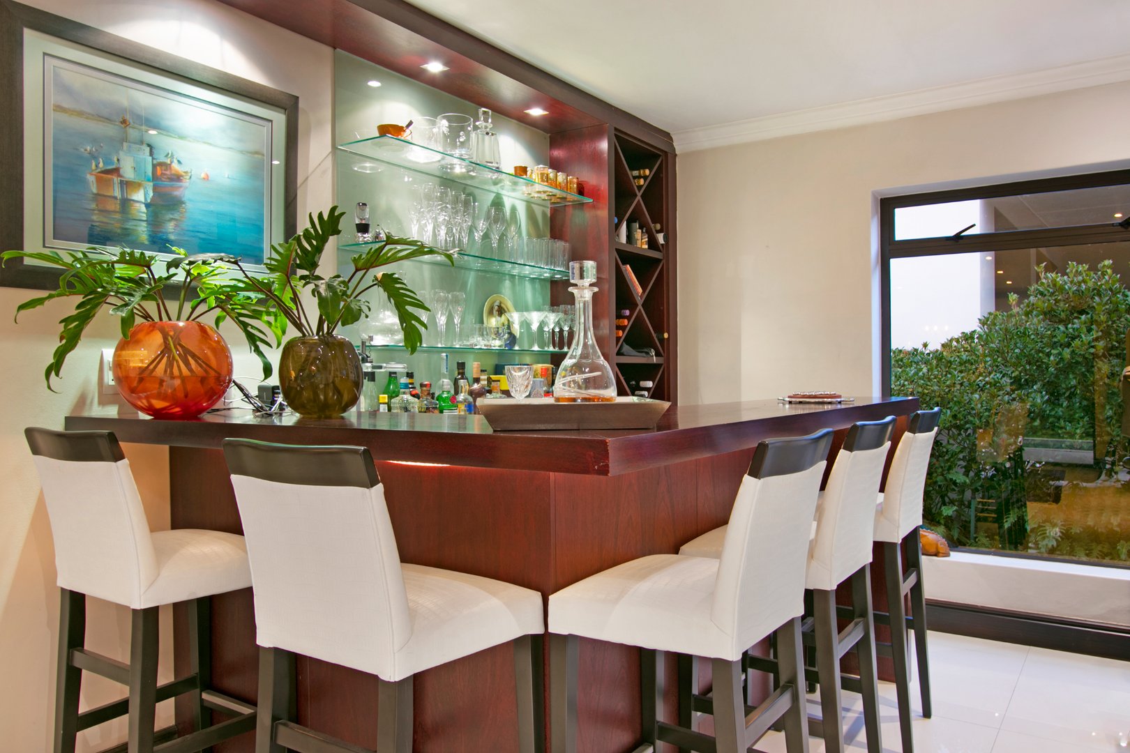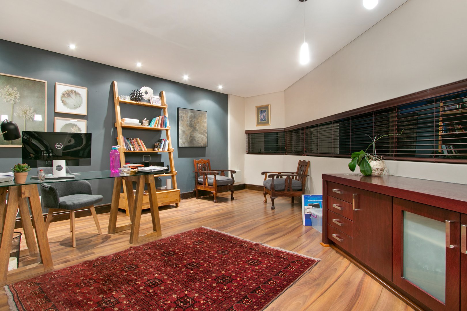 Inside, the villa features multiple lounges, including a cosy TV room near the kitchen and a main lounge with a centrally positioned fireplace shared with the dining area. A bar and piano add character and warmth, making the space ideal for relaxed evenings at home. An office and additional study space provide flexibility for remote work or quiet downtime.