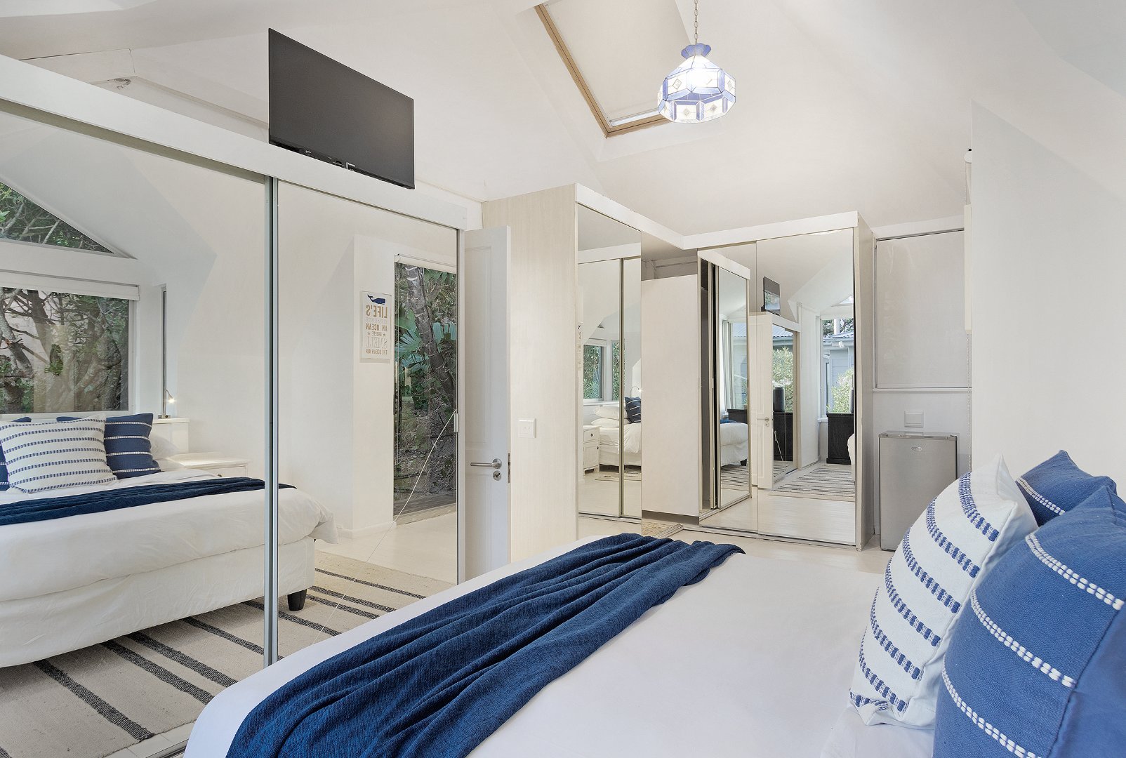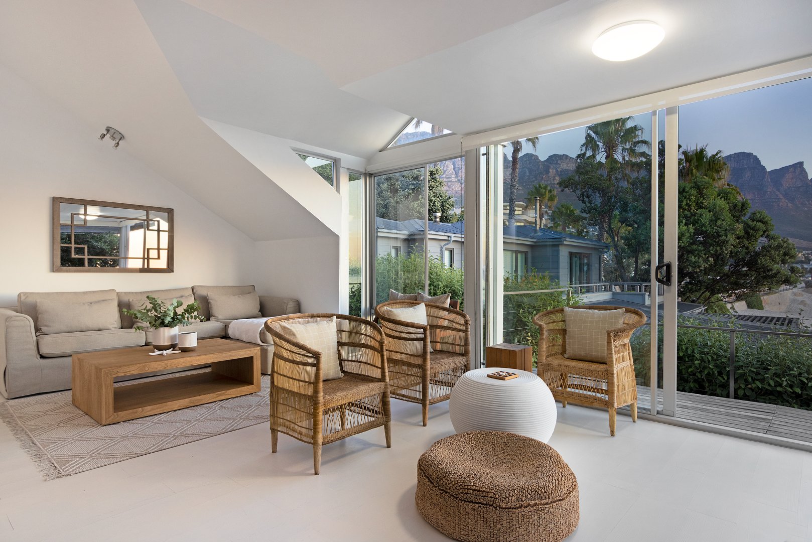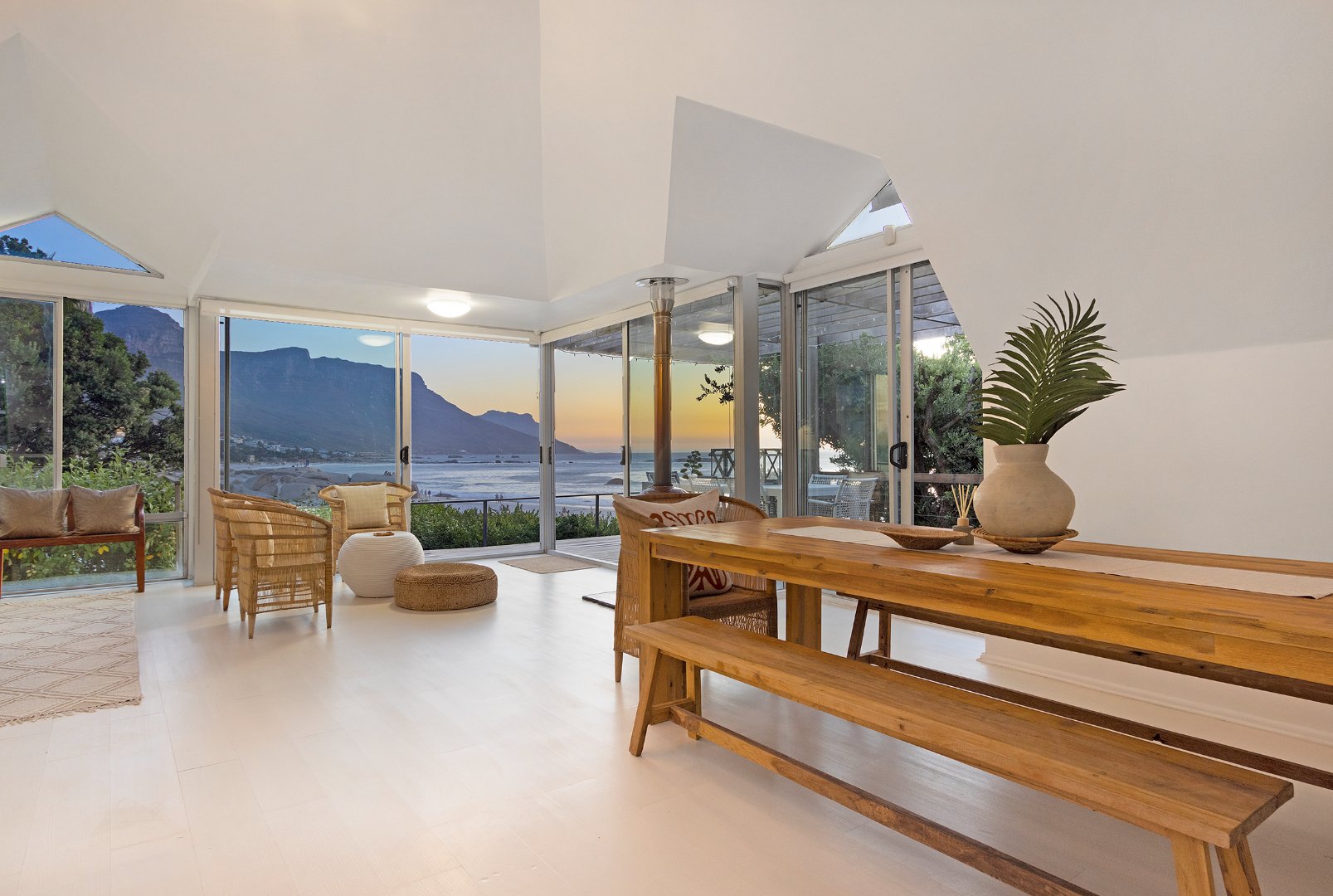 Living Areas: Open-plan lounge and dining with skylights, indoor fireplace, air-conditioning, reading/kids’ room