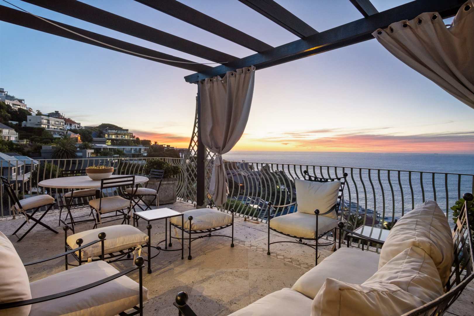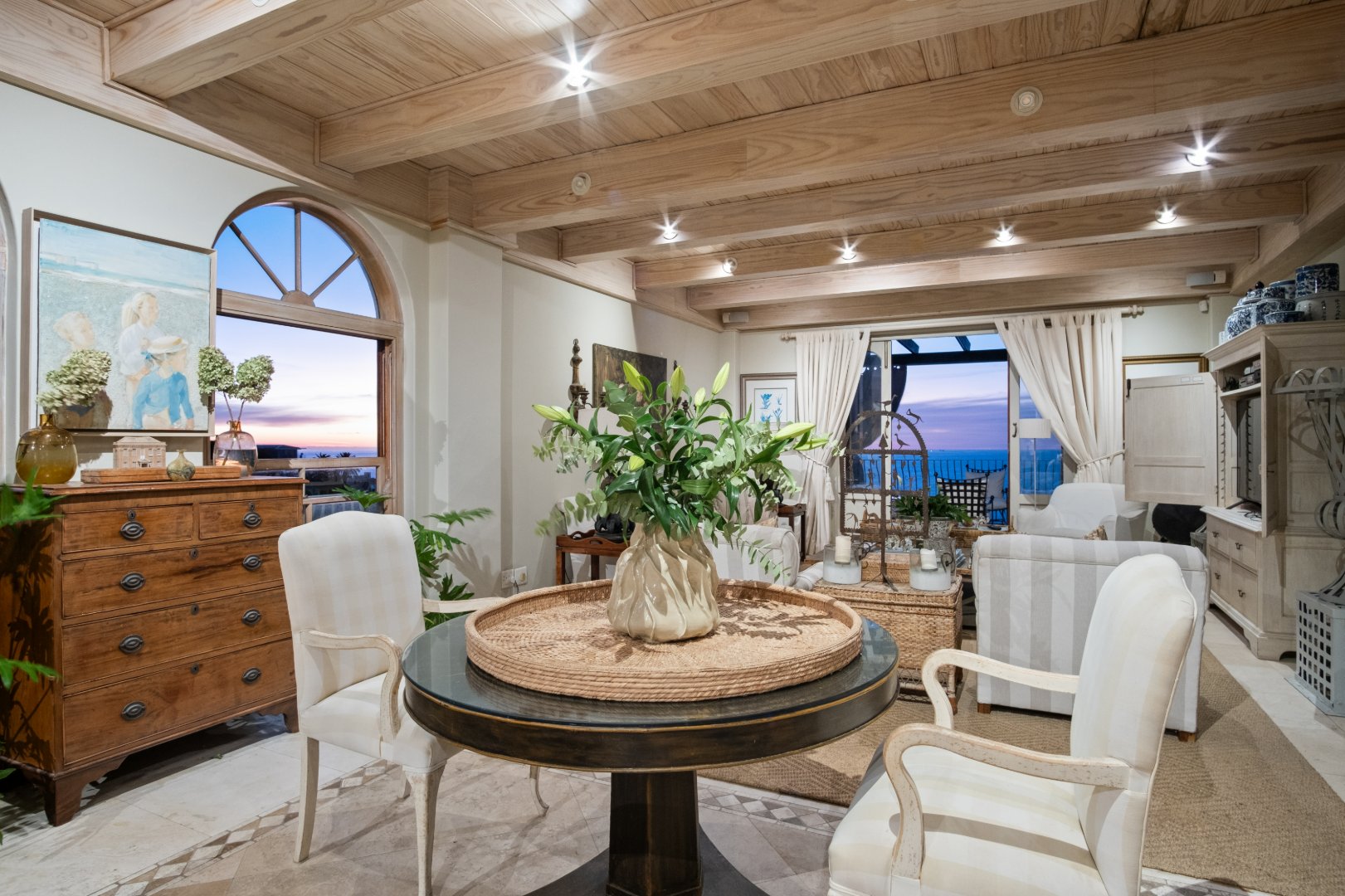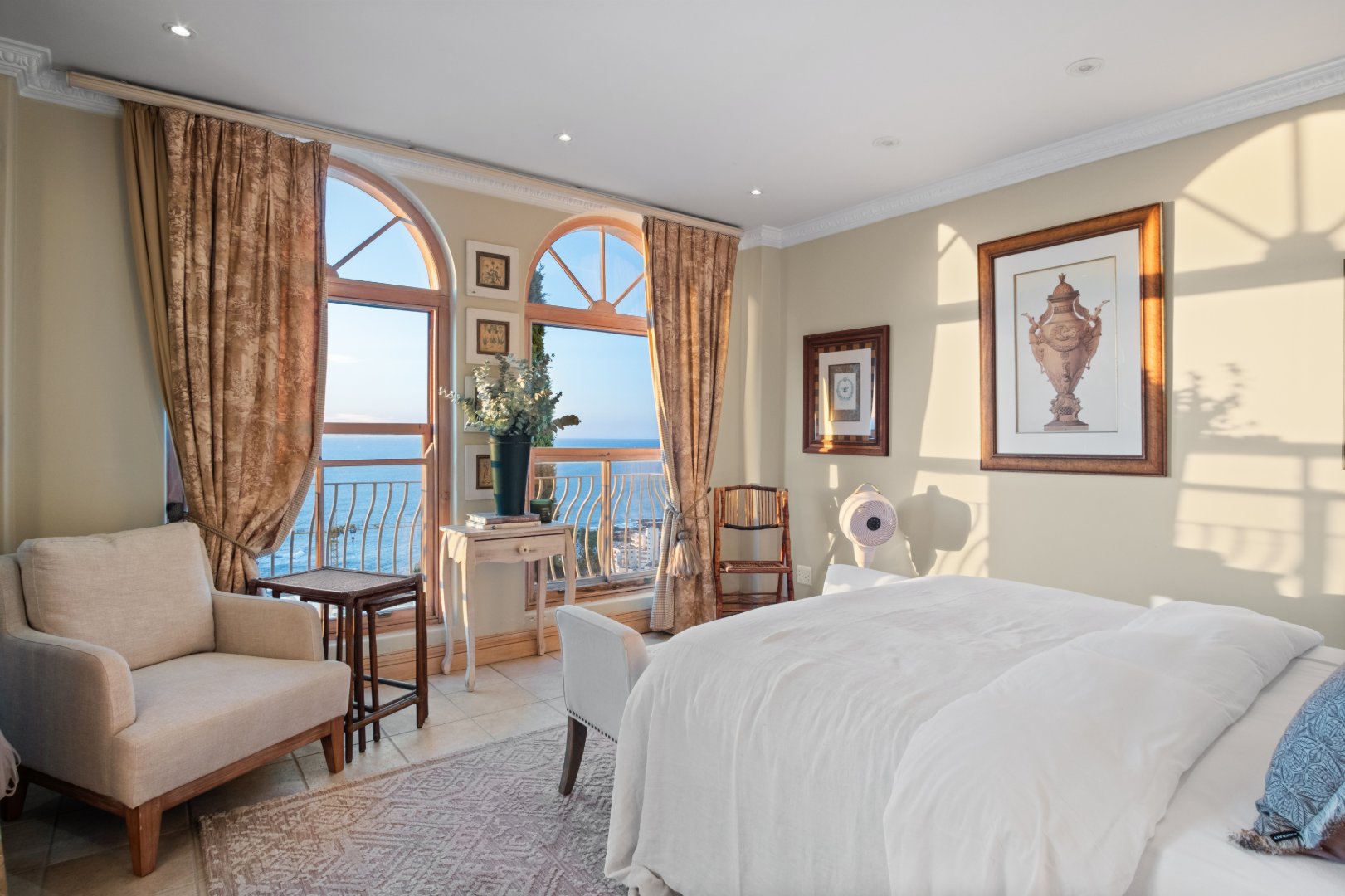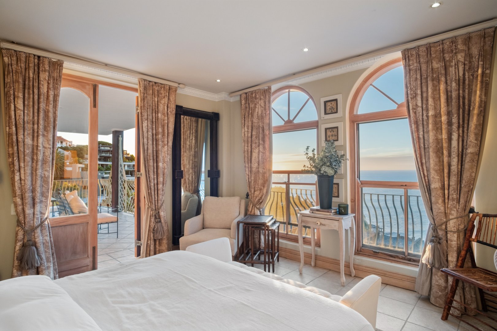 Designed with elegance and comfort in mind, the residence offers four spacious bedrooms and four-and-a-half bathrooms, each thoughtfully positioned to maximise privacy, natural light, and the remarkable ocean outlook. The generous proportions and timeless finishes throughout the home create an atmosphere of understated luxury, blending classic Mediterranean influences with the relaxed sophistication of the Atlantic Seaboard.