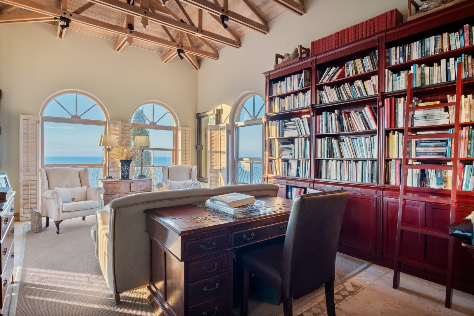 Adjacent to the main living areas is a refined library or private office an elegant retreat ideal for quiet reading, working from home, or simply enjoying the tranquility of the surroundings. Throughout the home, large openings and expansive windows frame the ocean beyond, filling each room with natural light and fresh sea air.