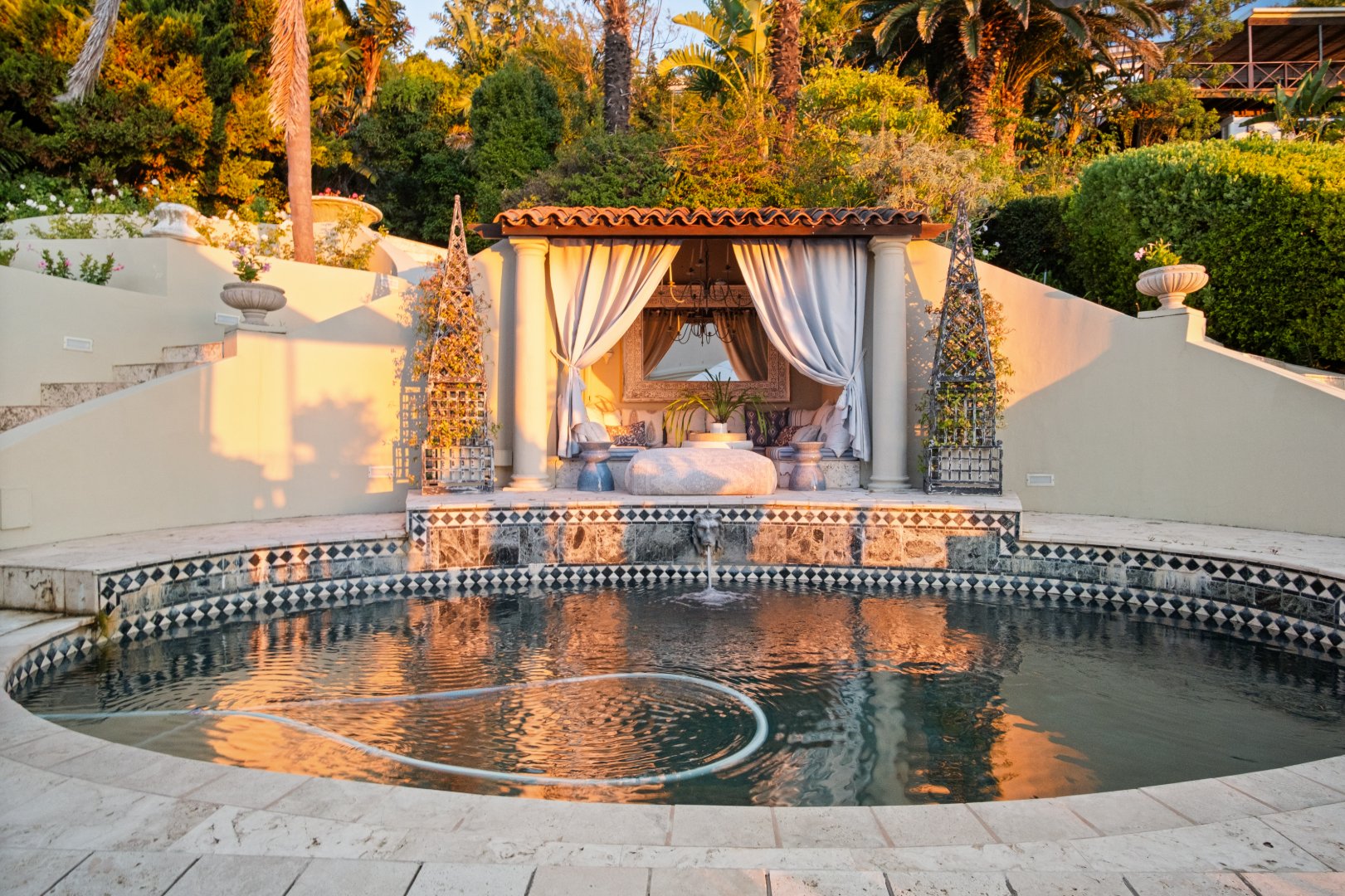 Outdoors, the property continues to impress with beautifully designed terraces and a secluded pool area that evokes the charm of a Mediterranean villa. Surrounded by lush greenery and elegant architectural elements, this serene outdoor space offers the perfect setting for relaxation, entertaining, or peaceful moments beside the water.
