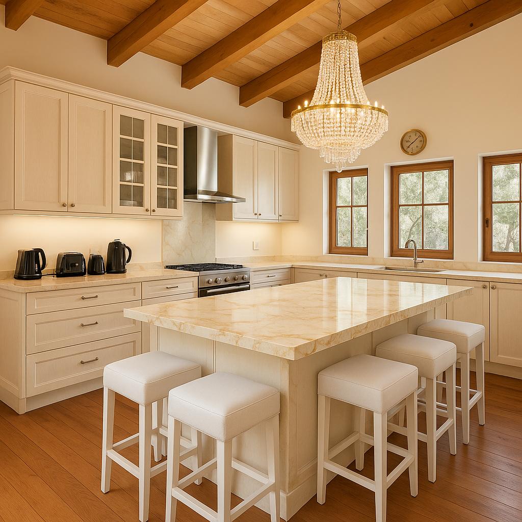 Downstairs, the guest bedroom features its own en-suite bathroom and offers direct access to a beautifully landscaped garden, creating a private retreat for visitors. The ground level also houses a large kitchen and scullery, perfectly positioned to overlook the dining area, making it an ideal space for both intimate family meals and grand entertaining.