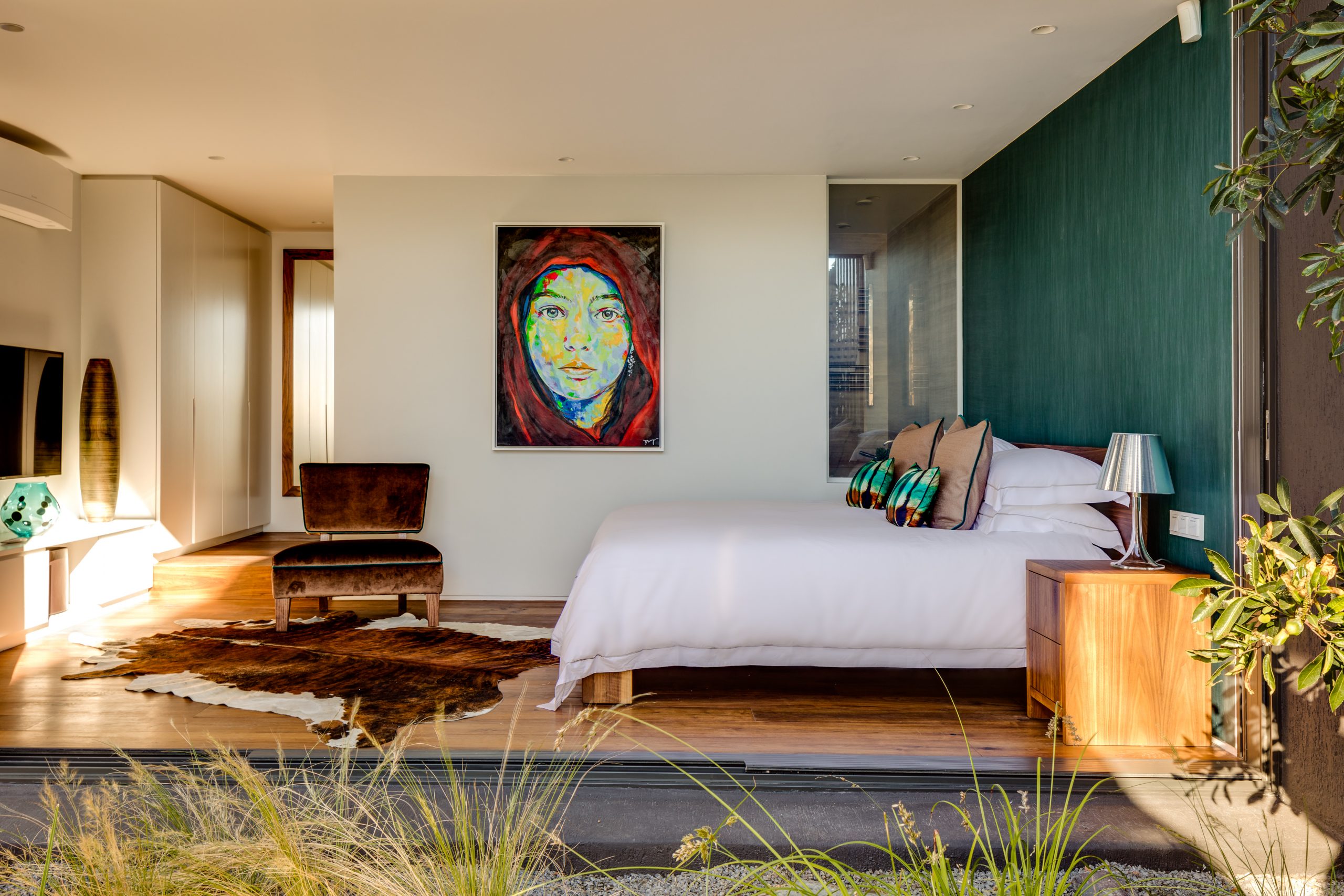 Its 725 square meters of space feature generous amounts of textured granite, warm walnut and luxurious marble which form the neutral backdrop for its vibrant contemporary interiors and its impressive collection of art from across the globe. Superb attention to every aspect of its interior detail ensures that each and every area of the home and its ensuite bedrooms are individually distinct & luxurious. A stunning laser cut steel and glass entrance forms the starting point of a journey into a luxury villa epitomised by quiet interior garden spaces and large picture windows with ocean and mountain views. The views of the Atlantic Ocean & Robben Island from every single room through-out the house are simply unsurpassed and provide stiff competition to the equally dramatic views of Lion’s Head from many areas of this luxury villa.